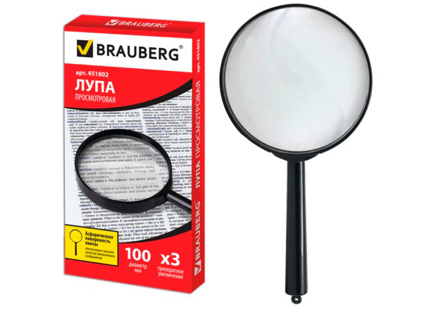 Ручная лупа BRAUBERG 3х, 100 мм (451802) – универсальный оптический помощник, который отлично проявит себя во время чтения, просмотра фотографий, изучения карт и схем. Асферическая линза большого диаметра (100 мм) позволяет изучать обширные области на увеличении 3 крата. Оптические элементы выполнены из пластика. Оправа лупы слегка выходит за границы линзы во избежание царапин. Благодаря легкому пластиковому корпусу прибор будет удобно брать с собой.