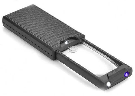 Ювелирная лупа Kromatech MG9581 2,5/45x, 57х30/9 мм (с подсветкой 3 LED, ультрафиолет) – отличный инструмент для работы с денежными купюрами, ювелирными изделиями, драгоценными камнями и любыми другими мелкими деталями. Линза размером 5,7х3 см дает увеличение 2,5 крат. Она полностью задвигается в пластиковый корпус и надежно защищена от повреждений. В основании большой линзы находится дополнительная, круглой формы. Она имеет диаметр 0,9 см и дает мощное 45-кратное увеличение. Яркие светодиоды работают от трех батареек LR1130 (идут в комплекте). От одного набора батареек подсветка может проработать до 20 часов. Благодаря UF-светодиоду раздвижную лупу можно использовать для проверки подлинности денежных знаков в ультрафиолетовом излучении.