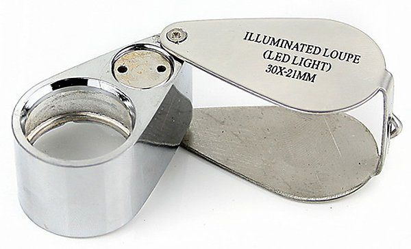 Складная ювелирная лупа. Диаметр линзы – 21 мм, увеличение – 30 крат. Яркая светодиодная подсветка позволяет подробно рассмотреть детали мелких предметов. Компактные размеры лупы позволяют легко брать ее с собой.