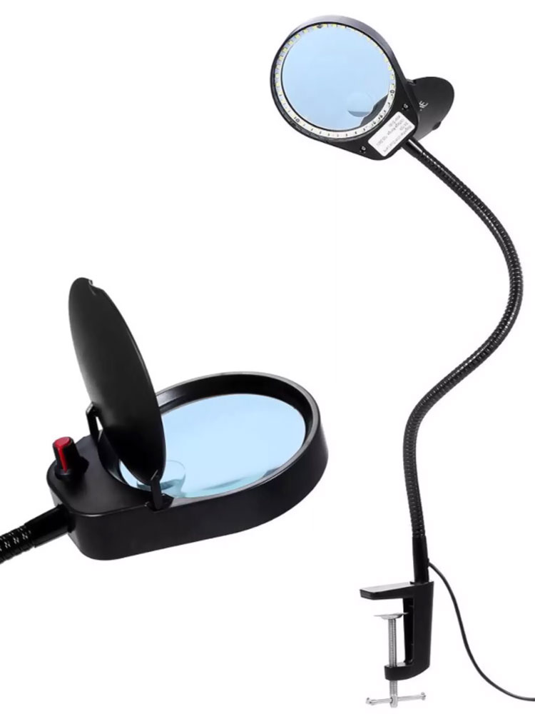 Лупа-лампа Kromatech PD-7S совмещает в себе функции обоих приборов: она имеет яркую бестеневую подсветку из 38 светодиодов и бифокальную линзу, дающую увеличения 5 и 15x. Это функциональное приспособление особенно удобно для часовых и ювелирных работ, занятий скрапбукингом и других хобби, требующих особого внимания к деталям. Струбцина обеспечивает надежную фиксацию на столешнице или другой поверхности, а гнущийся штатив позволяет выбирать оптимальный угол обзора. Лампа комплектуется сетевым адаптером и USB-кабелем для питания подсветки, яркость освещения регулируется специальной ручкой. Питание осуществляется от сети или компьютера. Цвета в ассортименте – белый, черный (случайный выбор).