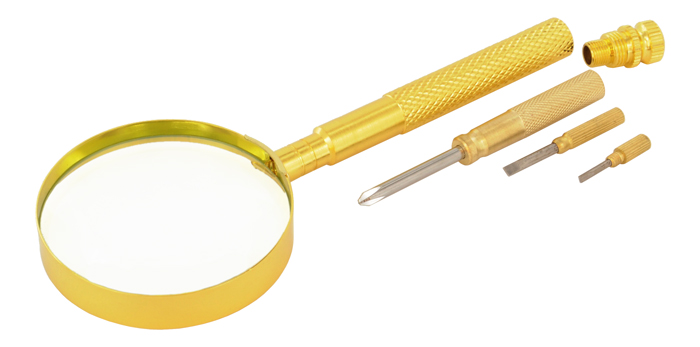 Классическая просмотровая лупа в оправе и с ручкой. В ручку вложен набор отверток. Корпус лупы изготовлен из металла и выполнен в привлекательном золотистом цвете. Линза изготовлена из прочного оптического пластика, имеет двукратное увеличение, а в диаметре составляет 65 мм.