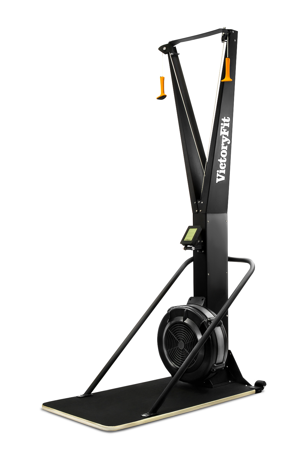 Лыжный тренажер VictoryFit VF-Ski100. Нагрузка происходит за счет аэродинамической системы сопротивления, создаваемой воздухом. В тренажере предусмотрено до 10 уровней нагрузки. Нагрузка регулируется за счёт интенсивности движений рук пользователя (высокий уровень при резких движениях и низкий при плавных). Техника тренировки соответствует технике бега на лыжах, эргономичные рукоятки на прочнейших нейлоновых тросиках максимально точно имитируют биомеханику движений рук в естественных условиях лыжной тренировки. Тренажер может устанавливается на специальную подставку (входит в комплект), а также может быть закреплен к стене.