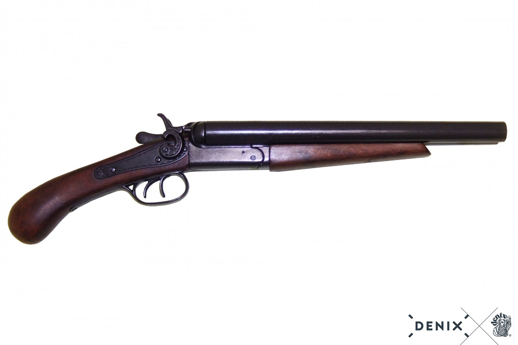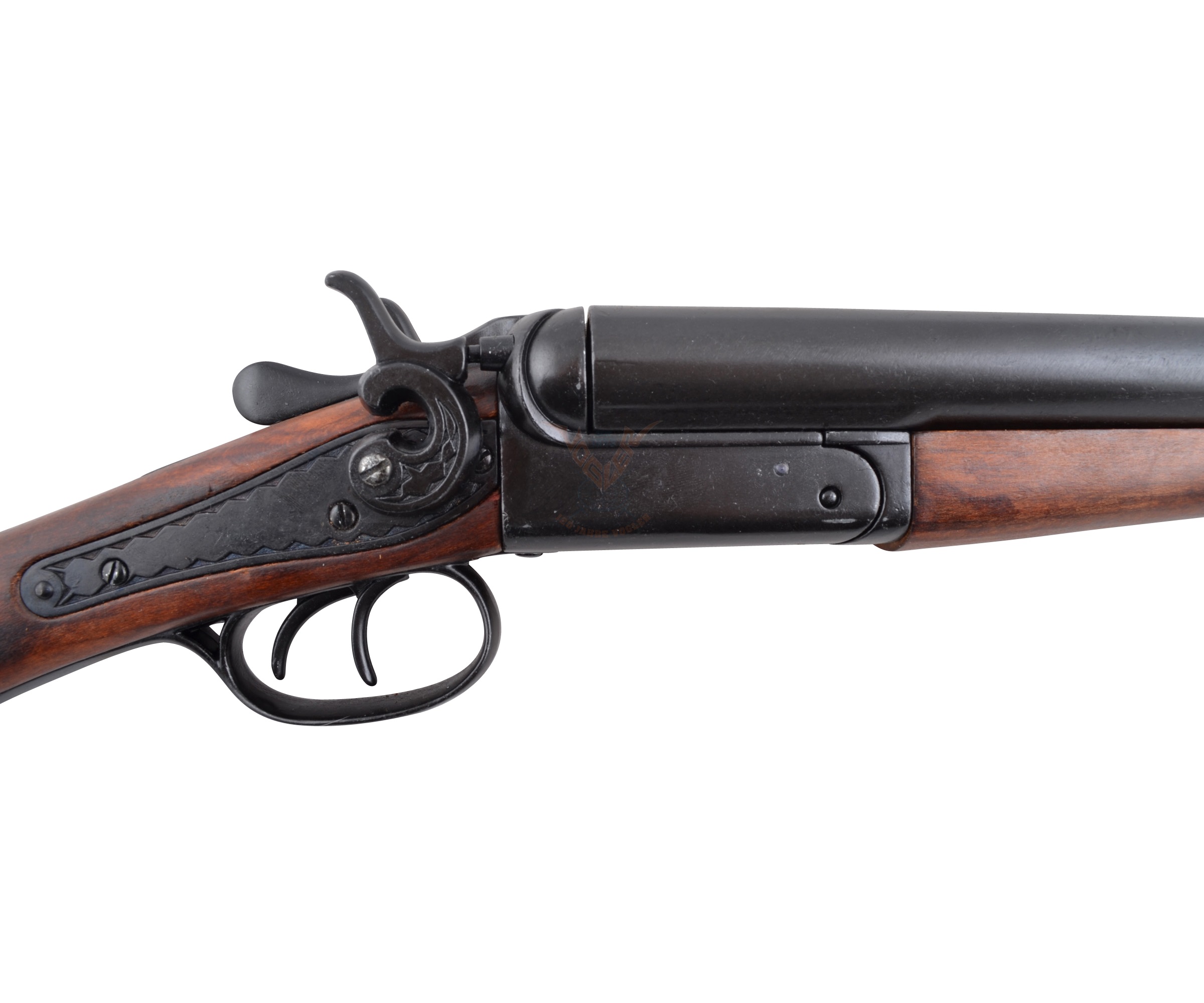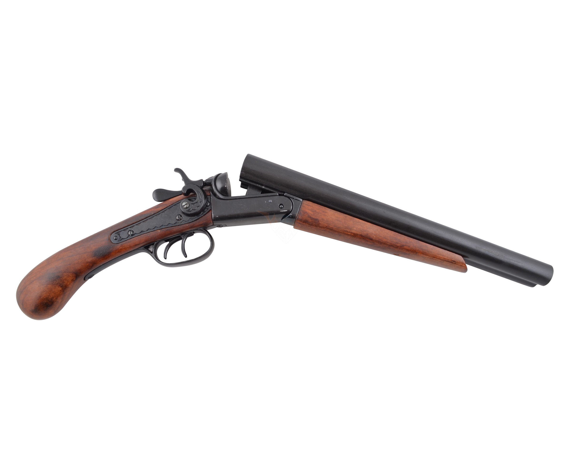 Макет двуствольный обрез от испанского бренда Denix отличает качественное исполнение и поразительное внешнее сходство с оригинальными образами времен Дикого Запада. Использование в изготовлении такого экземпляра металлического цинкового сплава обеспечивает макету необходимую прочность. Ложе обреза и его рукоять выполнены из натурального дерева. Ударно-спусковой механизм действует, ствол переламывается, при нажатии на спусковой крючок слышен характерный звук. Несмотря на то, что данная модель не позволяет вести стрельбу, в остальном она является точной копией грозного оружия Дикого Запада. Вес обреза соответствует оригинальным образцам, и составляет 1,83 кг. Длина двуствольного обреза – 53 см.
