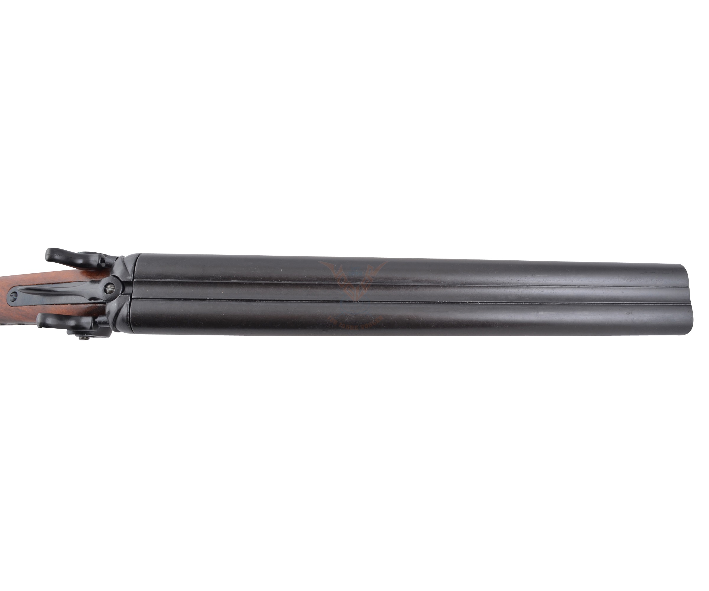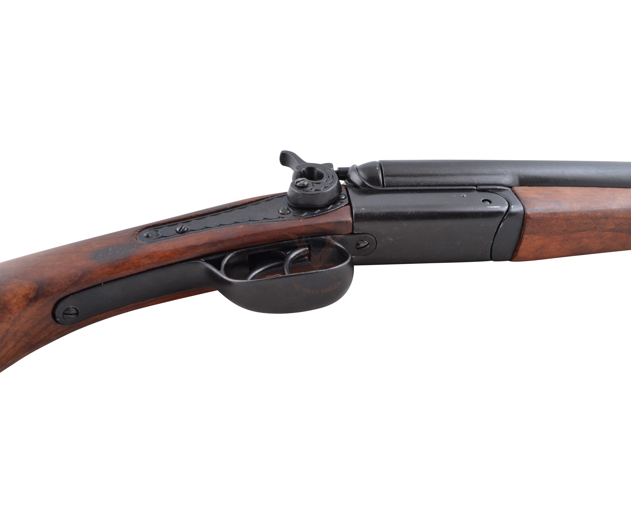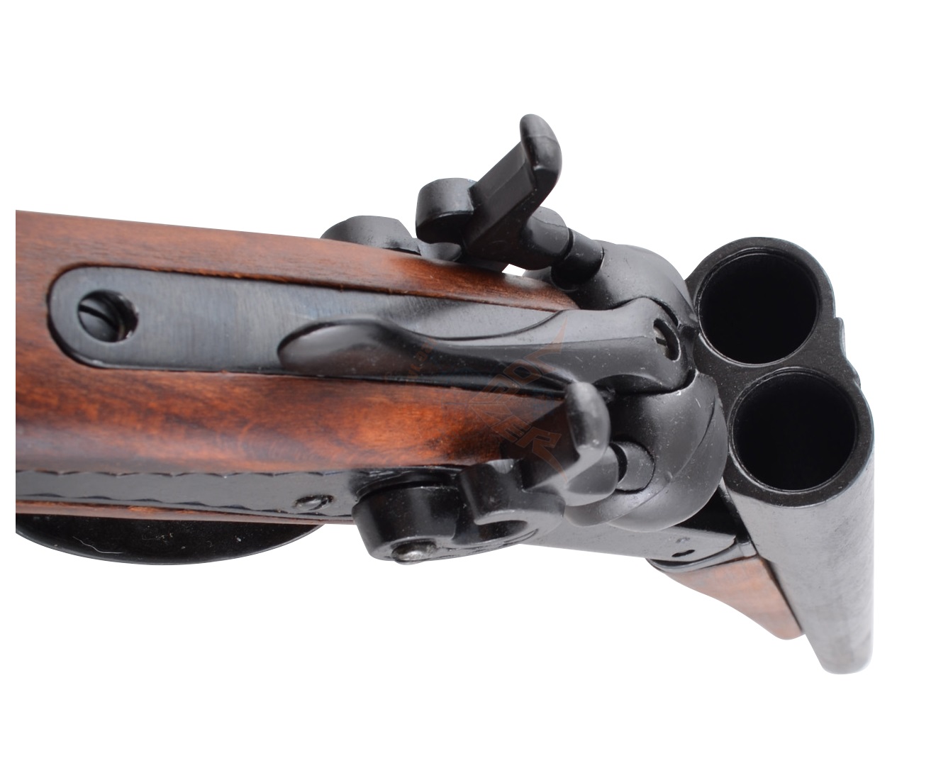 Макет двуствольный обрез от испанского бренда Denix отличает качественное исполнение и поразительное внешнее сходство с оригинальными образами времен Дикого Запада. Использование в изготовлении такого экземпляра металлического цинкового сплава обеспечивает макету необходимую прочность. Ложе обреза и его рукоять выполнены из натурального дерева. Ударно-спусковой механизм действует, ствол переламывается, при нажатии на спусковой крючок слышен характерный звук. Несмотря на то, что данная модель не позволяет вести стрельбу, в остальном она является точной копией грозного оружия Дикого Запада. Вес обреза соответствует оригинальным образцам, и составляет 1,83 кг. Длина двуствольного обреза – 53 см.