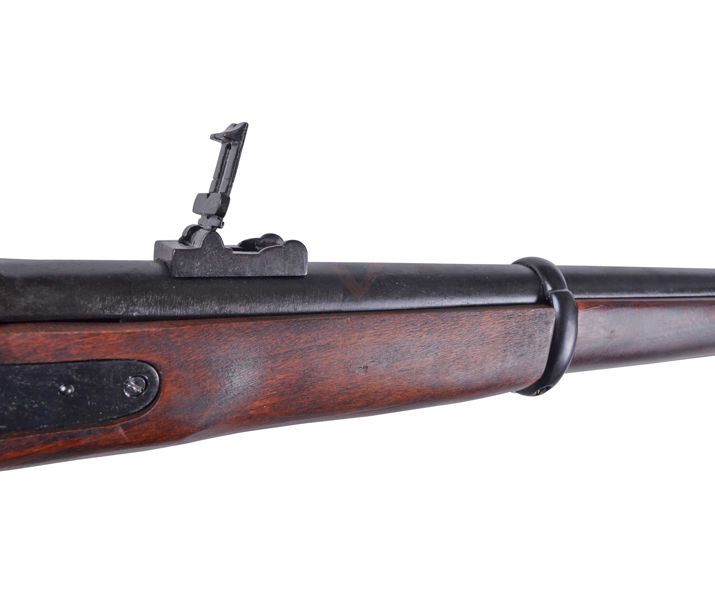 Макет мушкетон Энфилд – это массогабаритная копия винтовки английского производства выпуска 1853 года. Мушкет Энфилд, несмотря на достаточно короткий срок его эксплуатации армией Британии, получил высокое признание. Зарядка мушкета производилась с дульной части, использовались патроны Притчетта калибра 577. Винтовка отличалась весьма приличной прицельной дальностью стрельбы для того времени – до 280 метров. Скорострельность ее составляла порядка трех выстрелов в минуту. Технический прогресс и распространение оружия с зарядкой с казенной стороны привели к необходимости переоснащения уже выпущенных винтовок Энфилд. Благодаря переоснащению мушкетов скорострельность оружия увеличилась втрое. Видоизмененные винтовки Энфилд стали называть Снайдер-Энфилд.