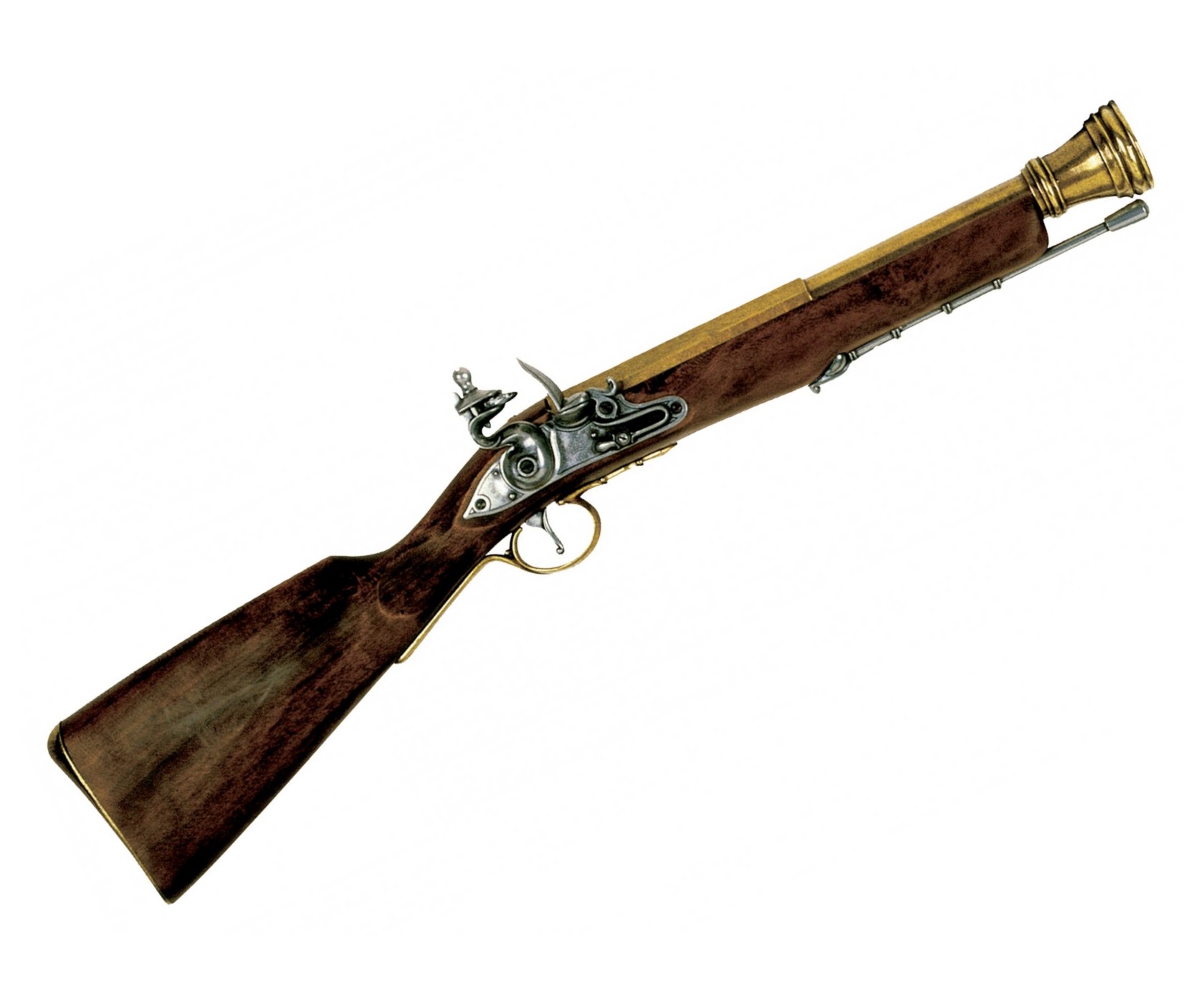 Макет мушкетон пиратский, латунь (Англия, XVIII век) – реалистичная и очень точная копия пиратского оружия, изготовленная испанской компанией Denix из цинкового металлического сплава и натурального дерева. Вес макета достаточно большой – 2 кг, длина оружия – 74 см. Расширенный к концу ствол имитирует позолоту, и украшен инкрустацией с изображением диких животных и растительных мотивов. Кремниевый замок сам по себе является украшением данного образца, специалисты Denix выполнили его функционирующим. Под стволом закреплен шомпол. Деревянный приклад мушкетона идеально гладкий, его украшает символ пиратов – череп со скрещенными саблями, или «веселый Роджер».