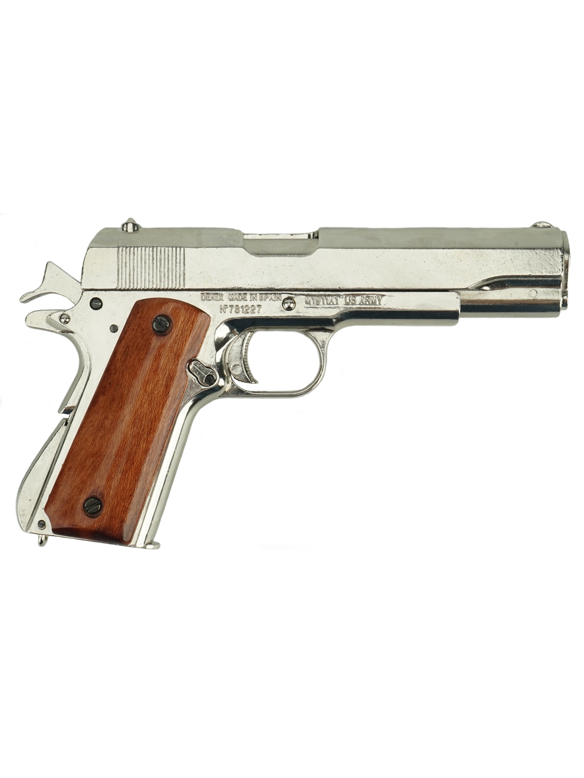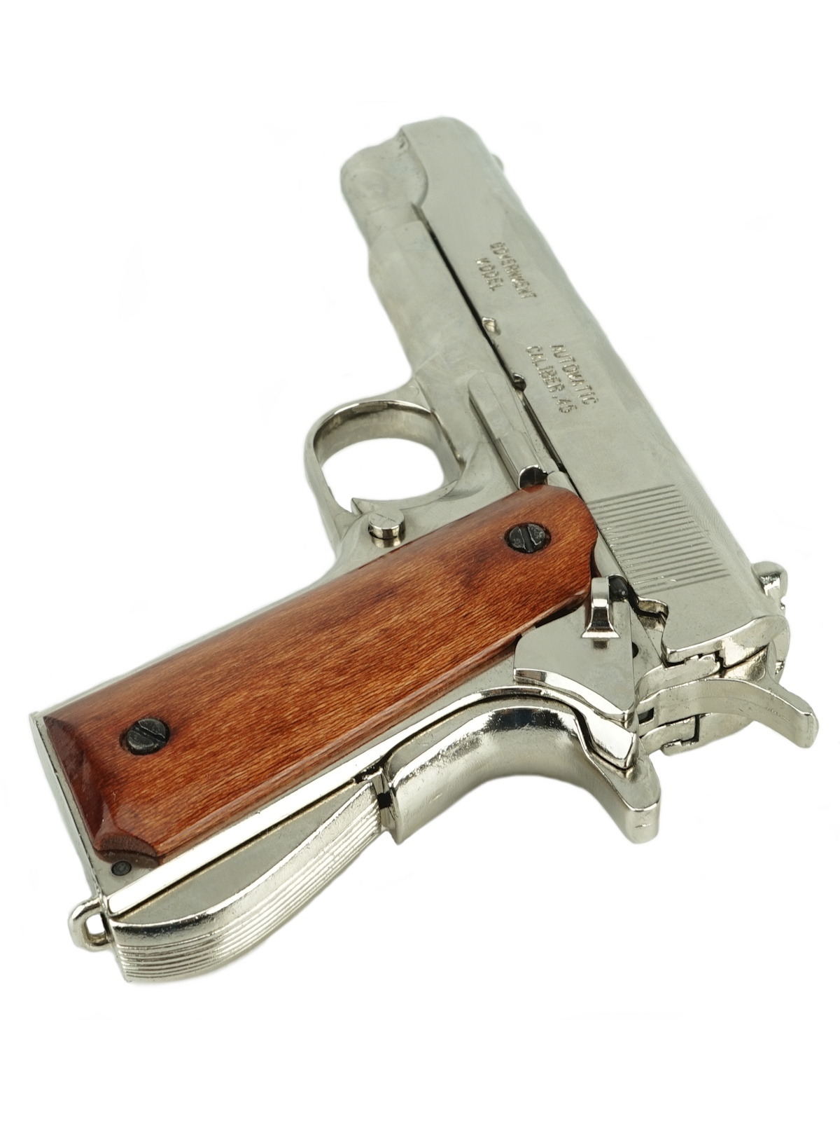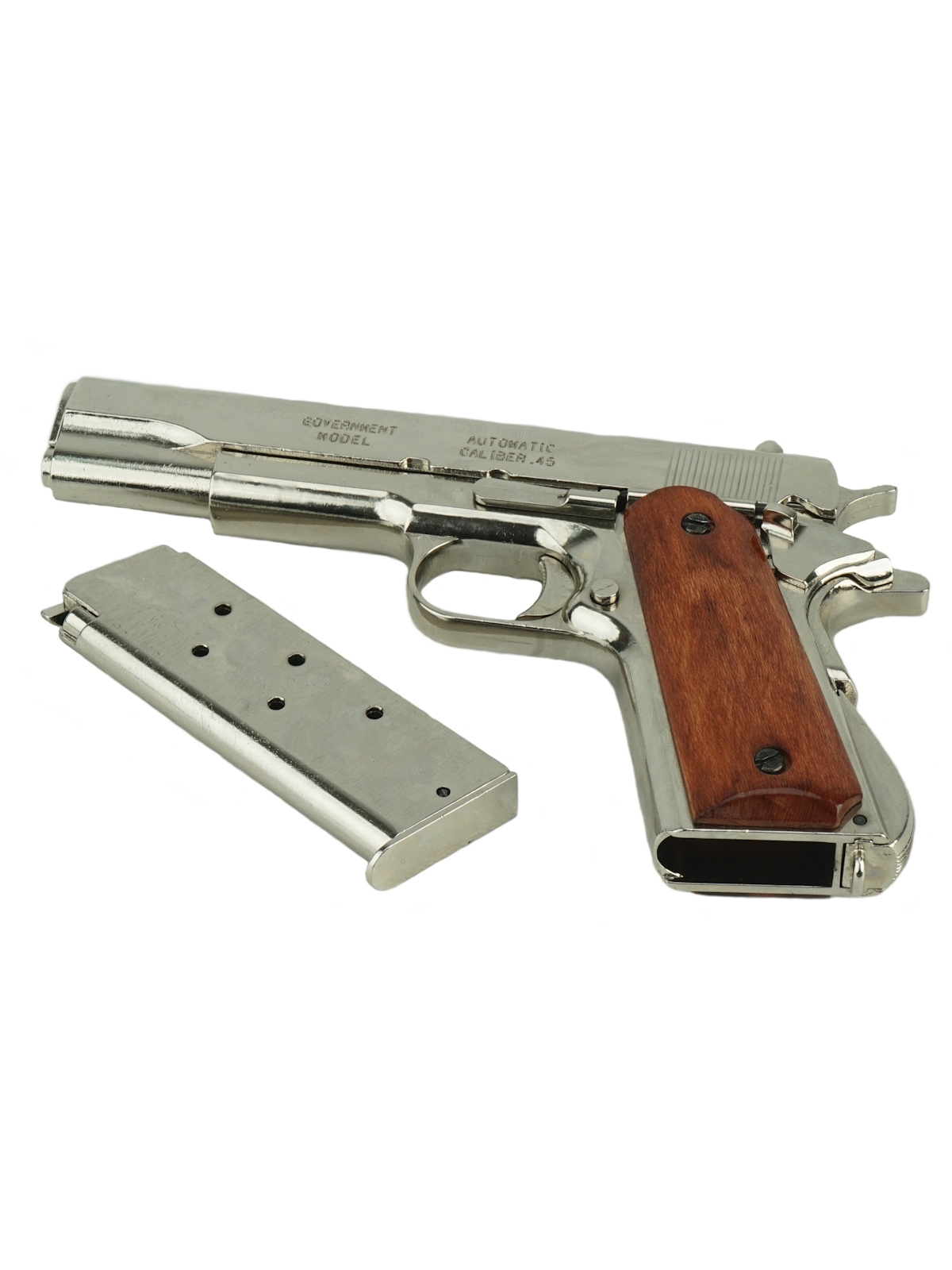 Реплика автоматического пистолета Кольт М1911, выполненная из хромированного металла и лакированного дерева. Имитация механизма заряжания и стрельбы. Оснащен функциональными кнопками предохранителя, съемным стволом и съемным магазином.
