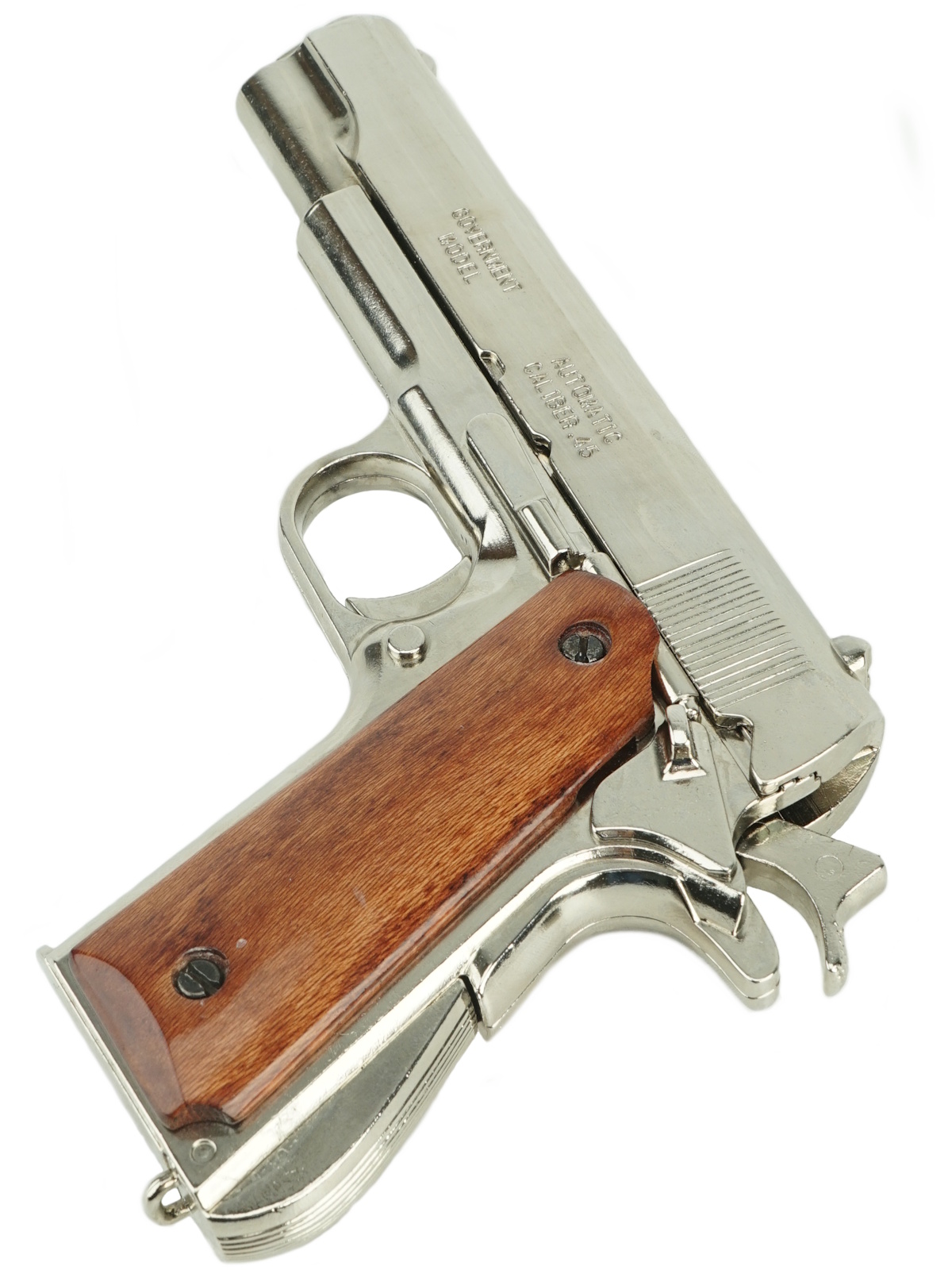 Реплика автоматического пистолета Кольт М1911, выполненная из хромированного металла и лакированного дерева. Имитация механизма заряжания и стрельбы.