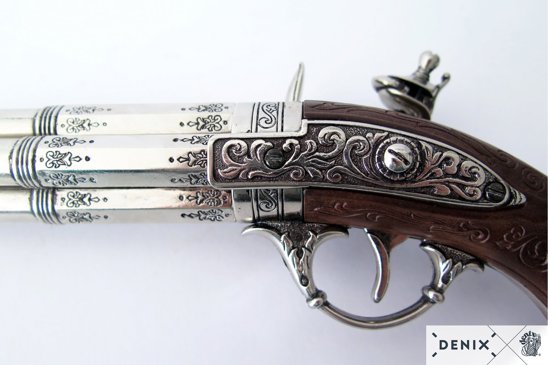 Макет пистолет кремневый четырехдульный (Франция, XVIII век) DE-1307 – это версия четырехзарядного пистолета от мастеров Деникс, разработанная на основе реального огнестрельного прототипа. В 18 столетии большинство пистолетов были однозарядными, и оружие с несколькими стволами встречалось довольно редко. Макет четырехдульного пистолета копирует боевой прототип, который можно встретить в музеях или у частных коллекционеров.
