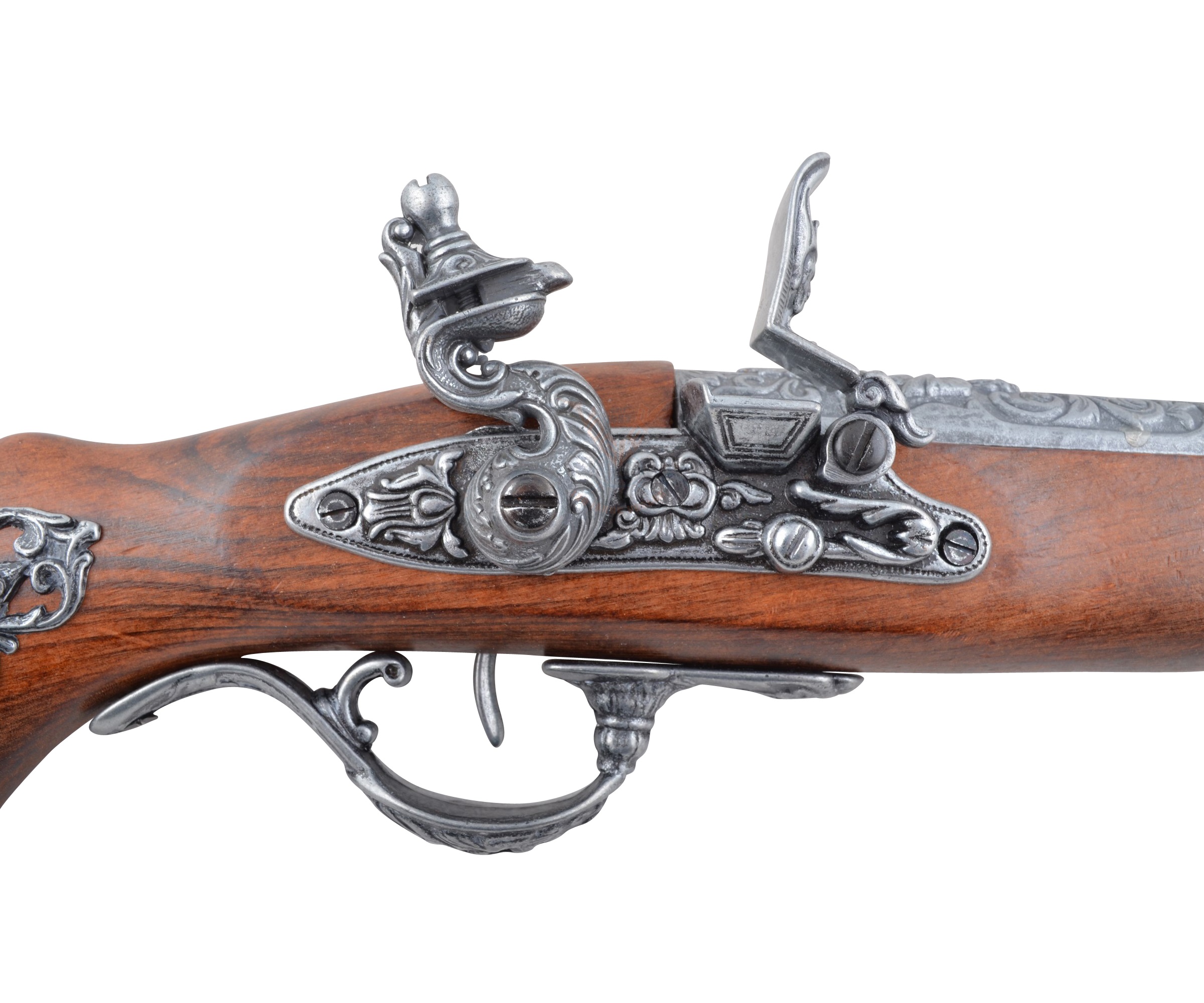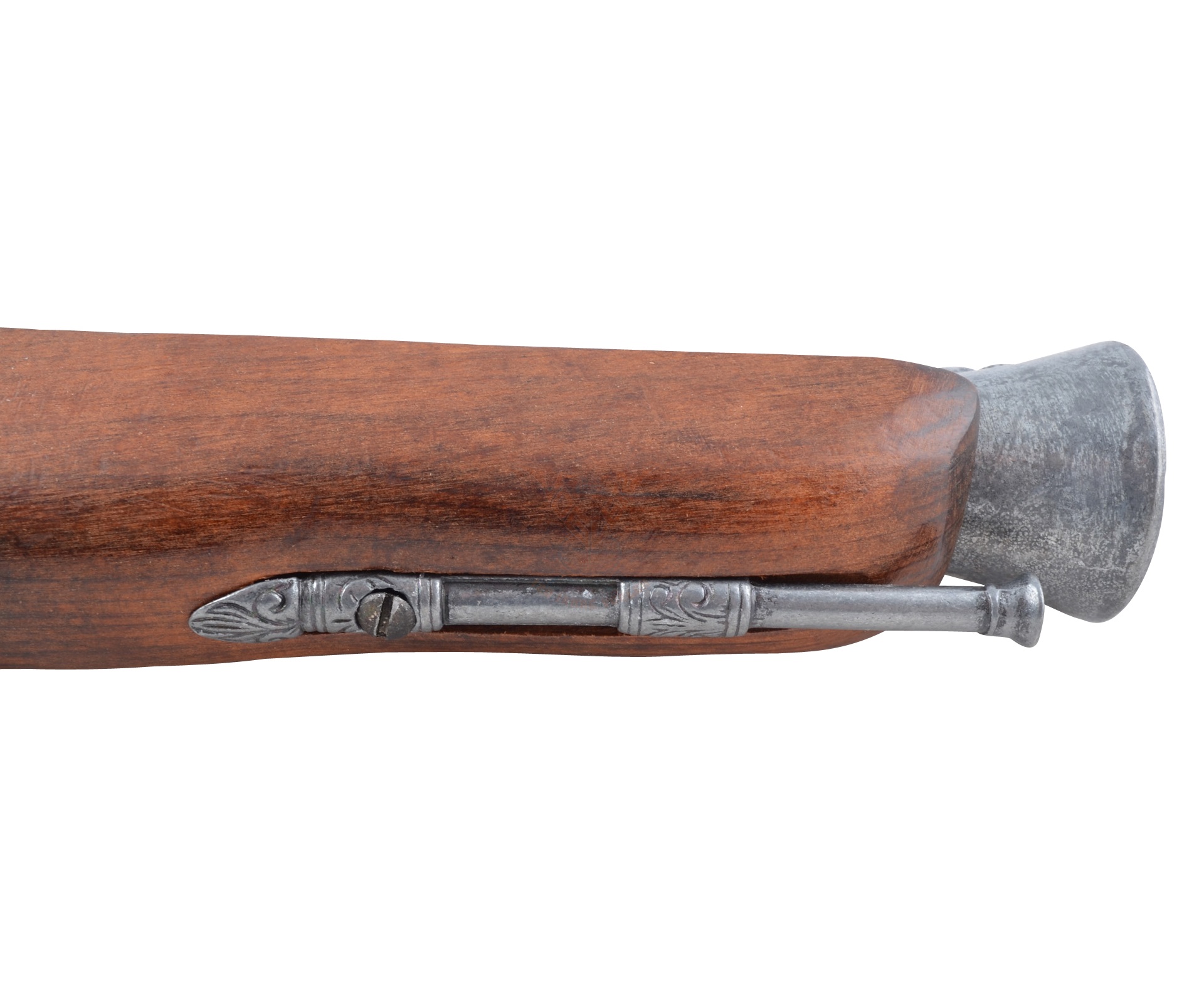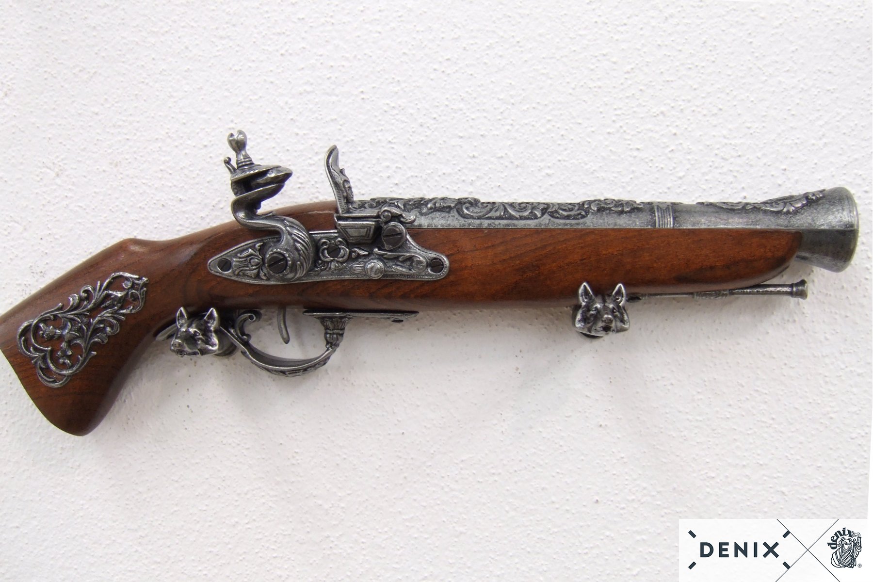 Изделие имеет красивый, очень эффектный внешний вид, украшено гравировками цветочной тематики. Изготовлен пистолет из металла и натурального дерева коричневого цвета. Вес мушкетона – 0,6 кг, длина 39 см.