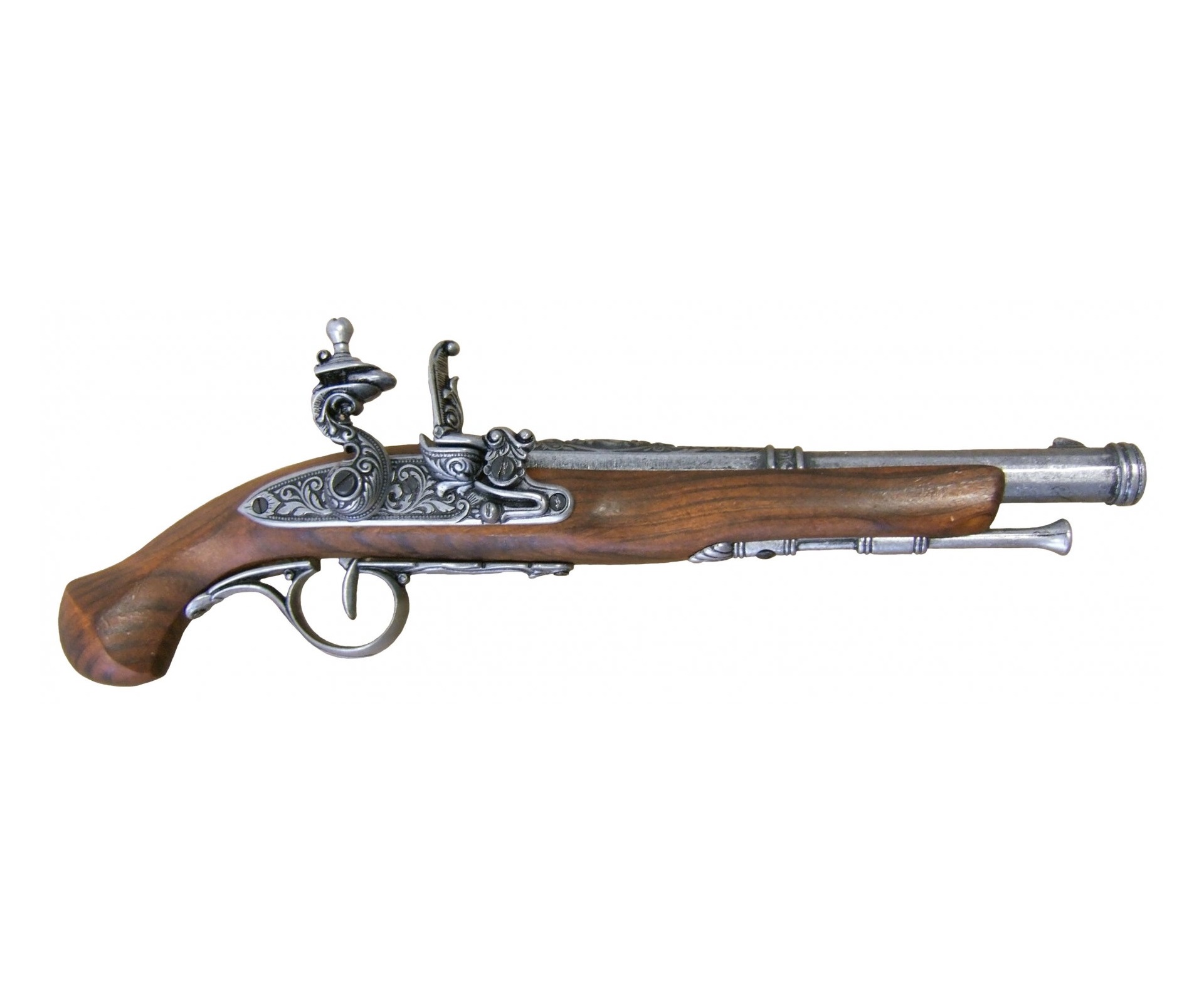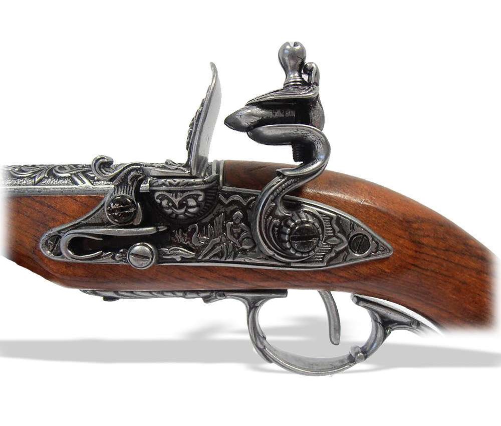 Макет пистолет кремневый, никель (XVIII век) DE-1102-G – это изящная декоративная копия реального исторического оружия, изготовленная с большим вниманием к каждой детали мастерами Деникс. Можно сказать, что данное изделие является типичным оружием своего времени. Функционал макета позволяет увидеть работу ударного механизма и нажать на курок для условного выстрела. Использовать с этим изделием боевые или холостые боеприпасы невозможно, так как оно не предназначено вести стрельбу.