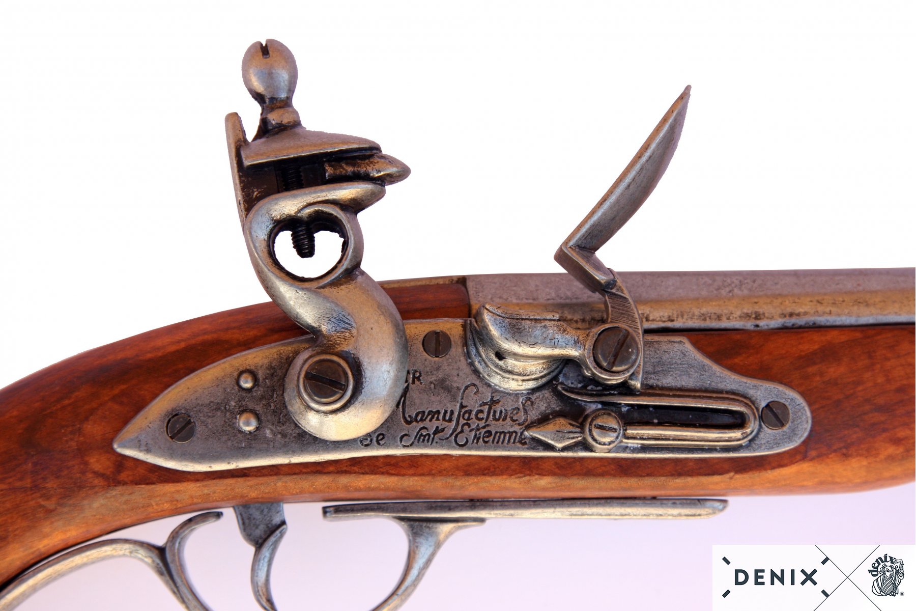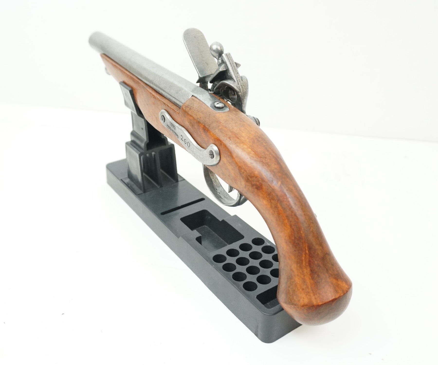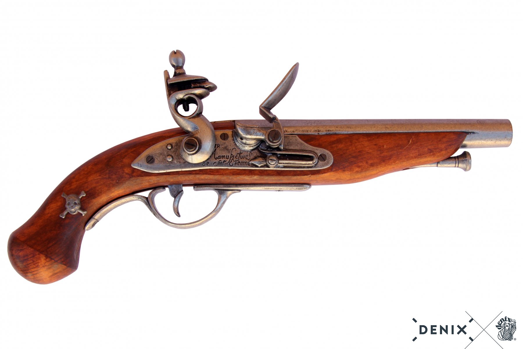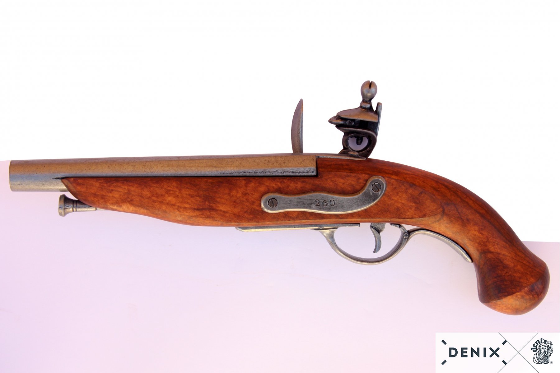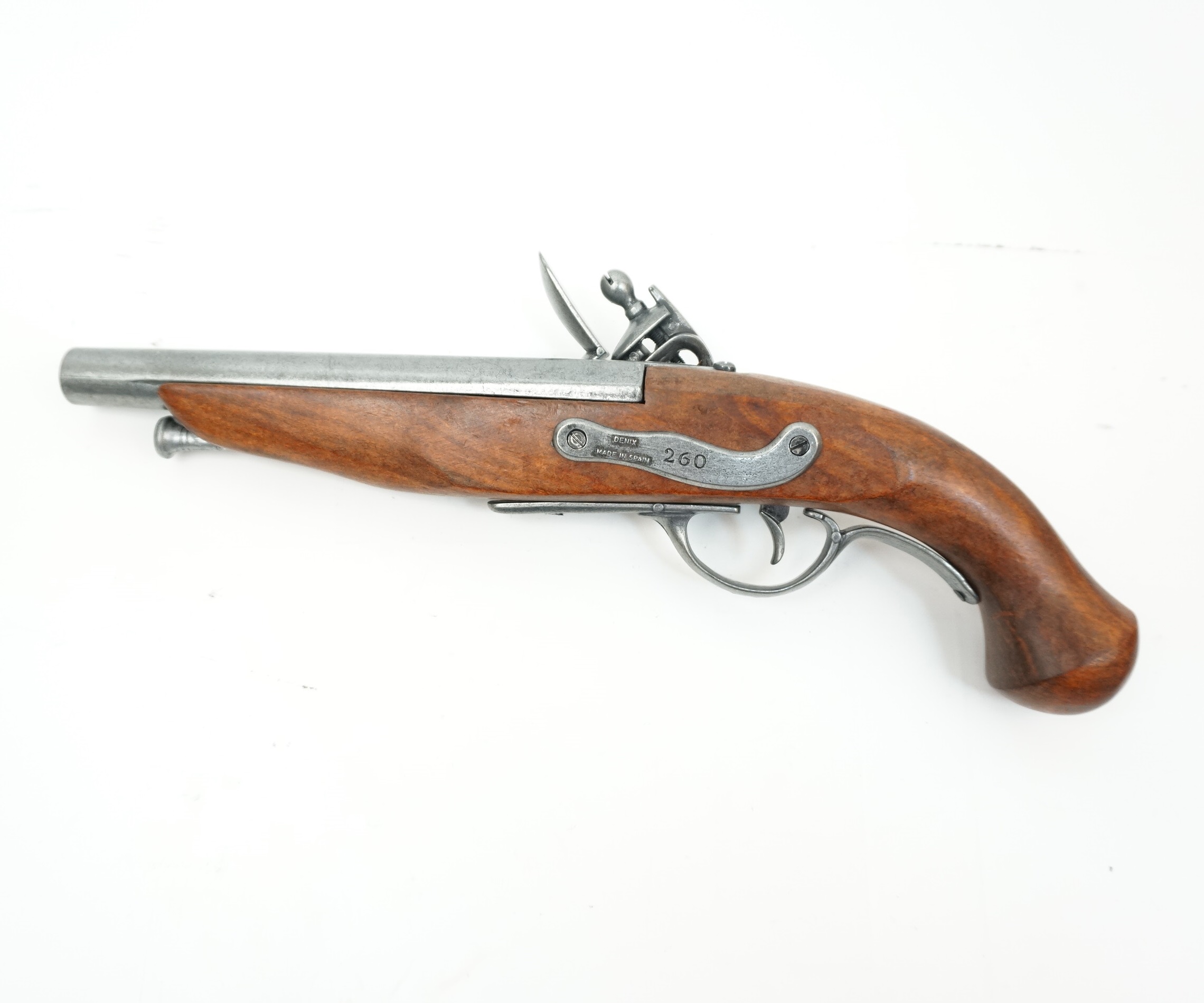 Макет пистолет кремневый пиратский (Франция, XVIII век) DE-1012 – это реплика сувенирно-декоративного назначения на основе наиболее распространенного огнестрельного оружия Франции 18 века. Изделие дает возможность имитировать и механизм заряжания, и процесс выстрела, но не позволяет произвести сам выстрел и тем более не может быть доработано до боевого оружия.