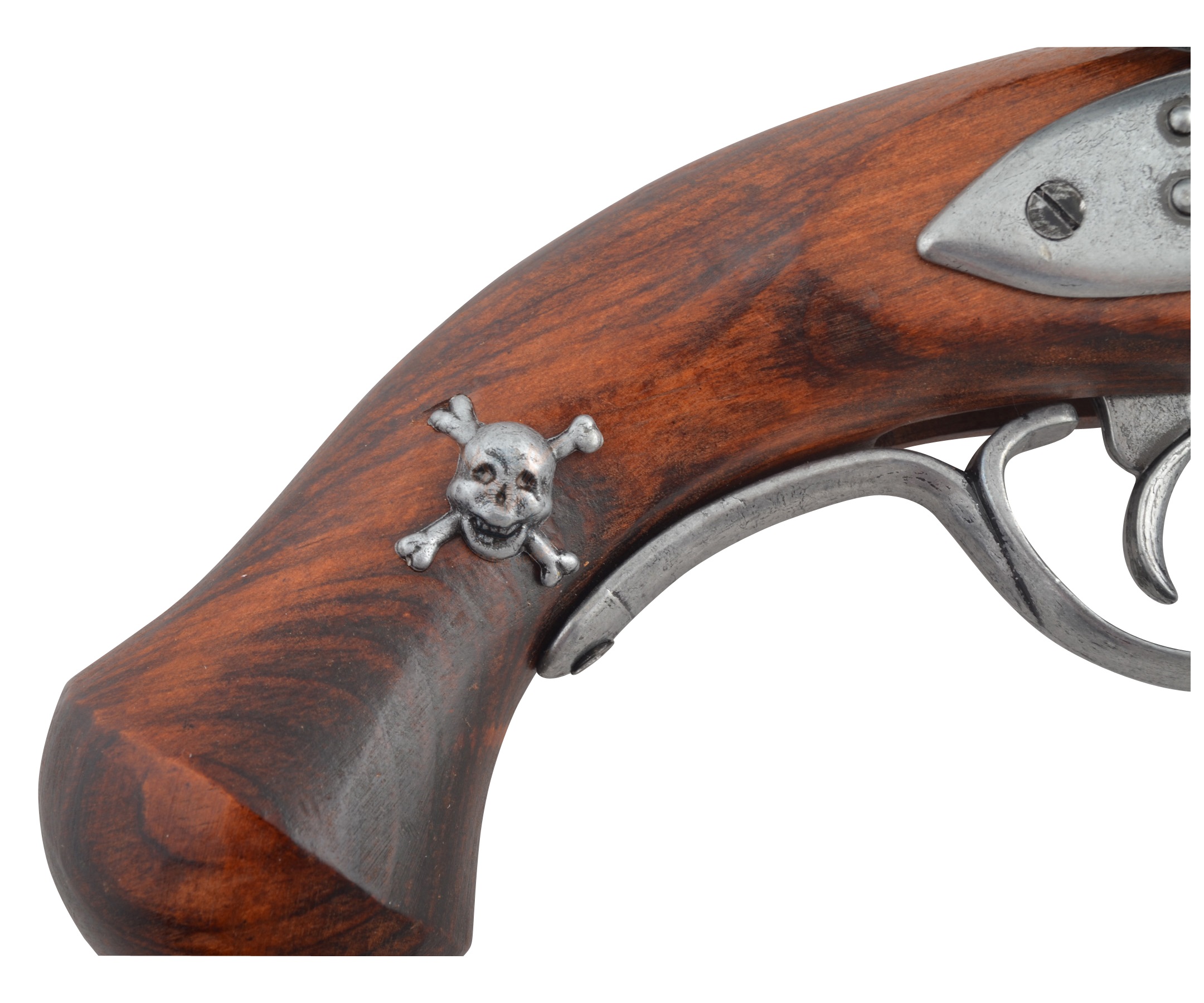 Так как в 18 столетии массовое производство пистолетов не было налажено, каждый мастер-оружейник мог украсить свое оружие богатой инкрустацией или наоборот, придать ему более строгий и брутальный вид. Данное изделие не слишком богато украшено, а о его принадлежности морскому разбойнику свидетельствует череп с перекрещенными костями на его рукоятке.