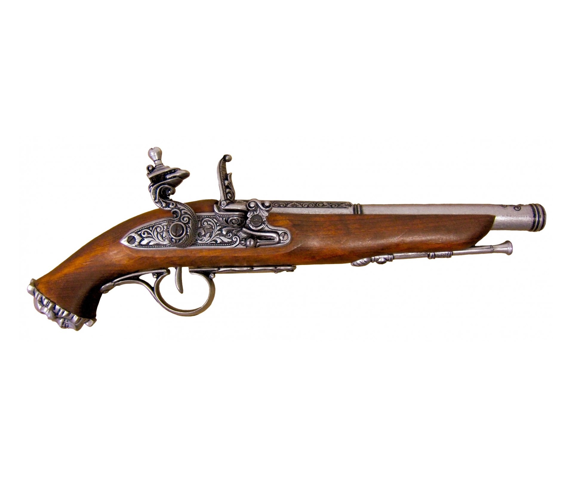 Макет пистолет кремневый пиратский, никель (XVIII век) DE-1103-G – это декоративно-сувенирная модель на основе настоящего кремниевого мушкетона, разработка мастеров компании Деникс. Изделие выполнено в точном соответствии с пистолетами 18 века, которые, в том числе, использовались и пиратами при нападении на торговые корабли. Такое оружие идеально подходило для абордажа, поскольку имело укороченную длину, небольшие габариты и было простым в эксплуатации.