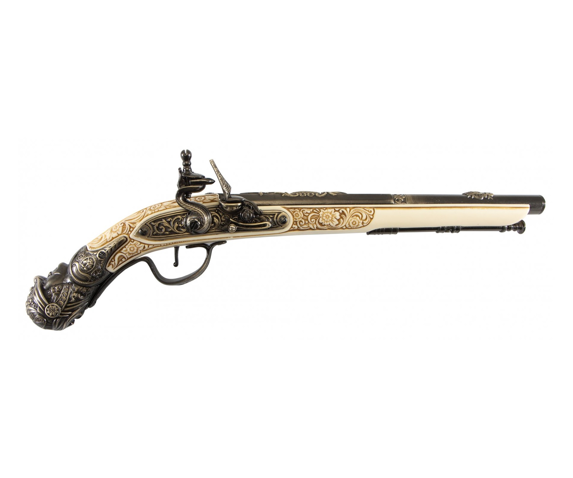 Реплика кремневого пистолета (Германия) 17 века. Выполнена из металла и пластика под слоновую кость. Имитирует механизм заряжания и стрельбы.