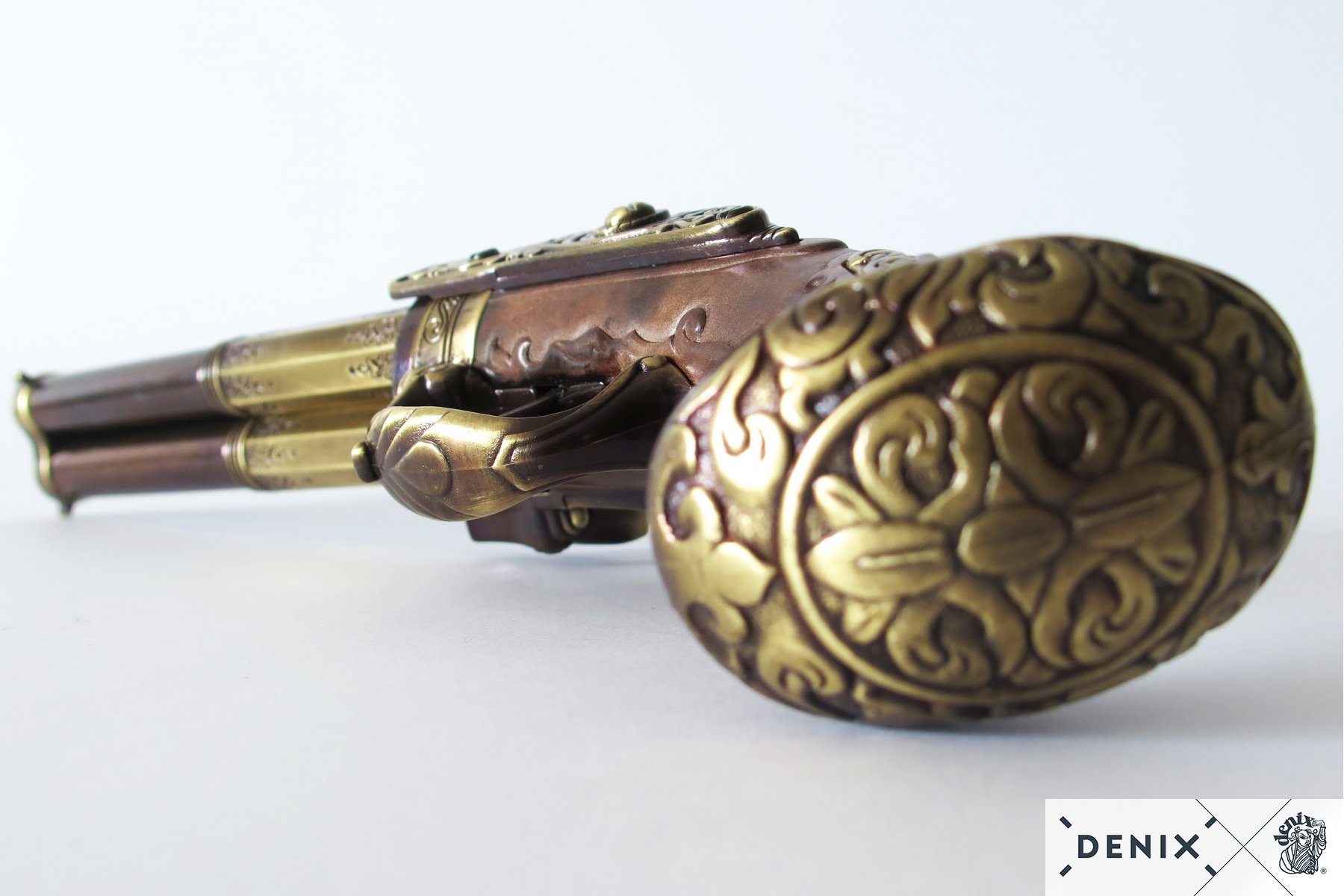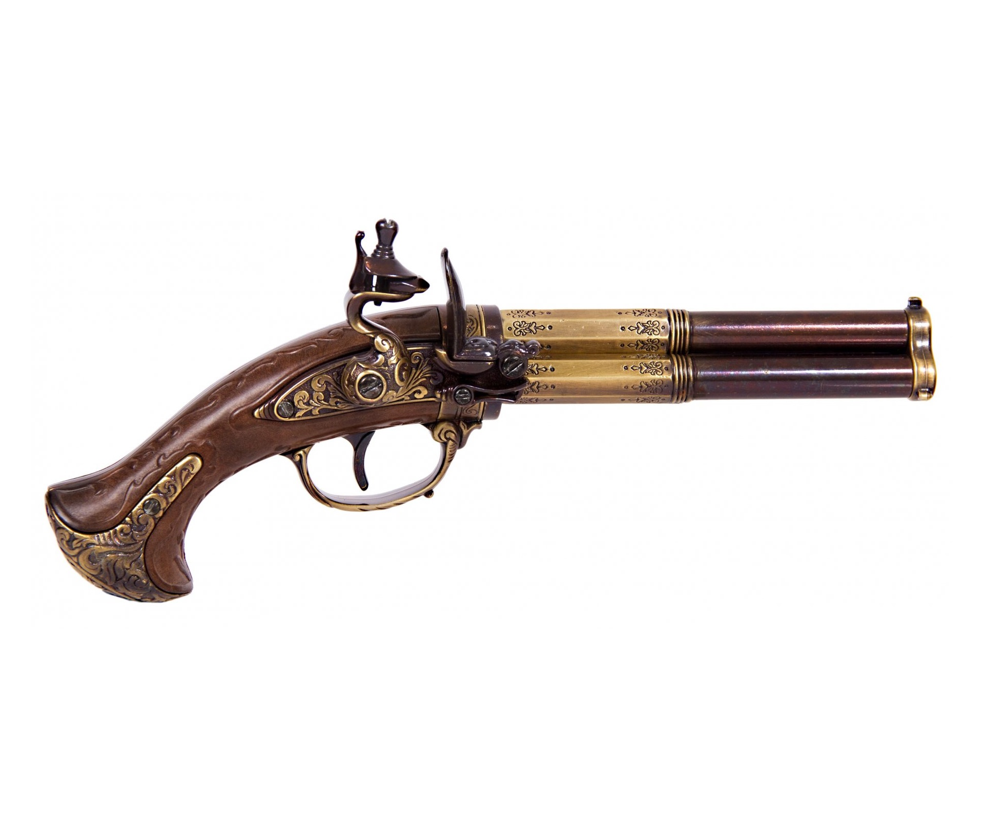 Реплика французского трехдульного кремневого пистолета 18 века. Выполнена из металла и пластика под дерево. Имитирует механизм заряжания и стрельбы.
