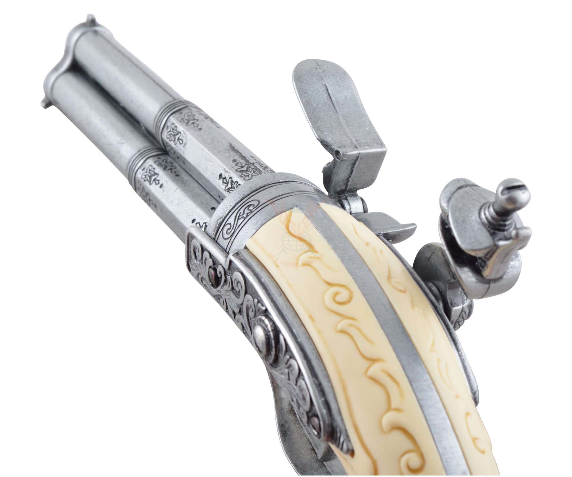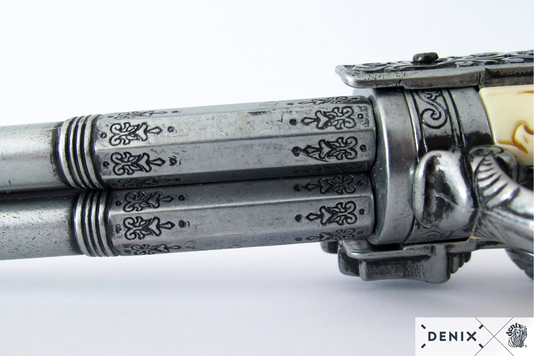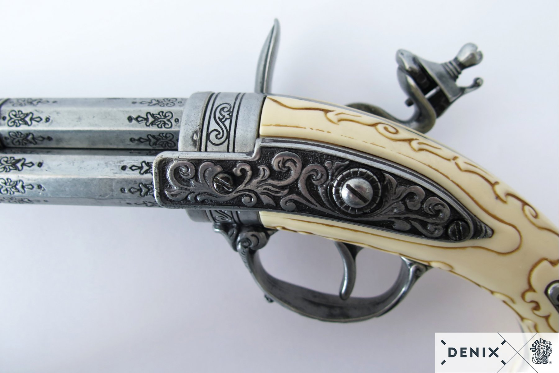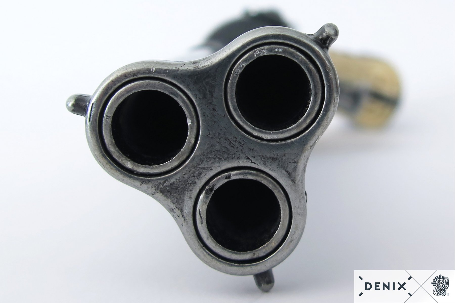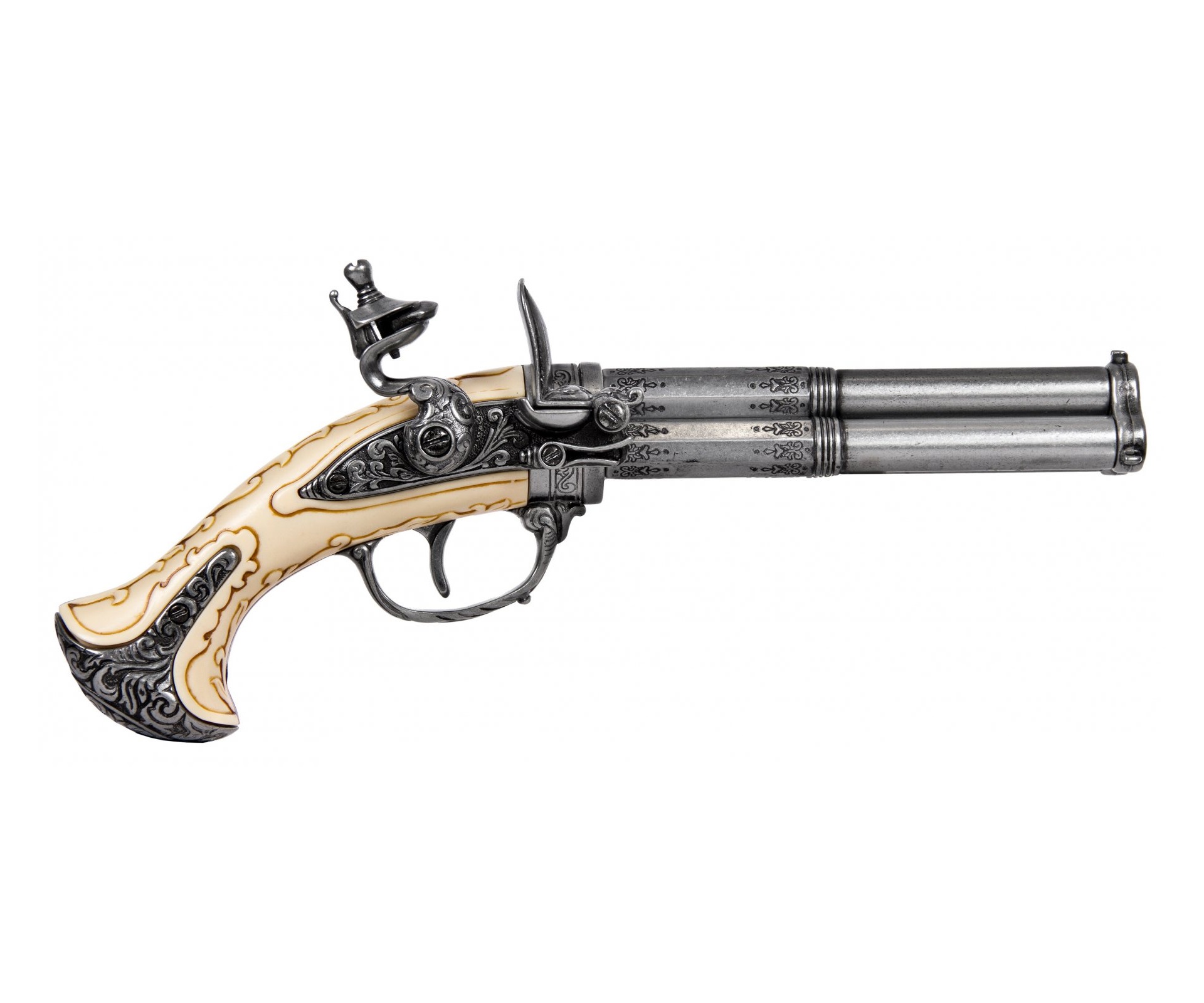 Макет пистолет кремневый трехдульный, под кость (Франция, XVIII век) DE-1309 – это копия исторического оружия оригинальной конструкции, продукт бренда Деникс. Изделие отличается стволом с тремя дулами, который вращается вручную. Таким образом возможности стрелка увеличиваются, повышается скорострельность. Таких трехдульных модификаций было выпущено немного, поэтому макет можно назвать достаточно уникальным. Помимо вращающегося ствола, здесь подвижен курок и можно имитировать процесс заряжания пистолета.