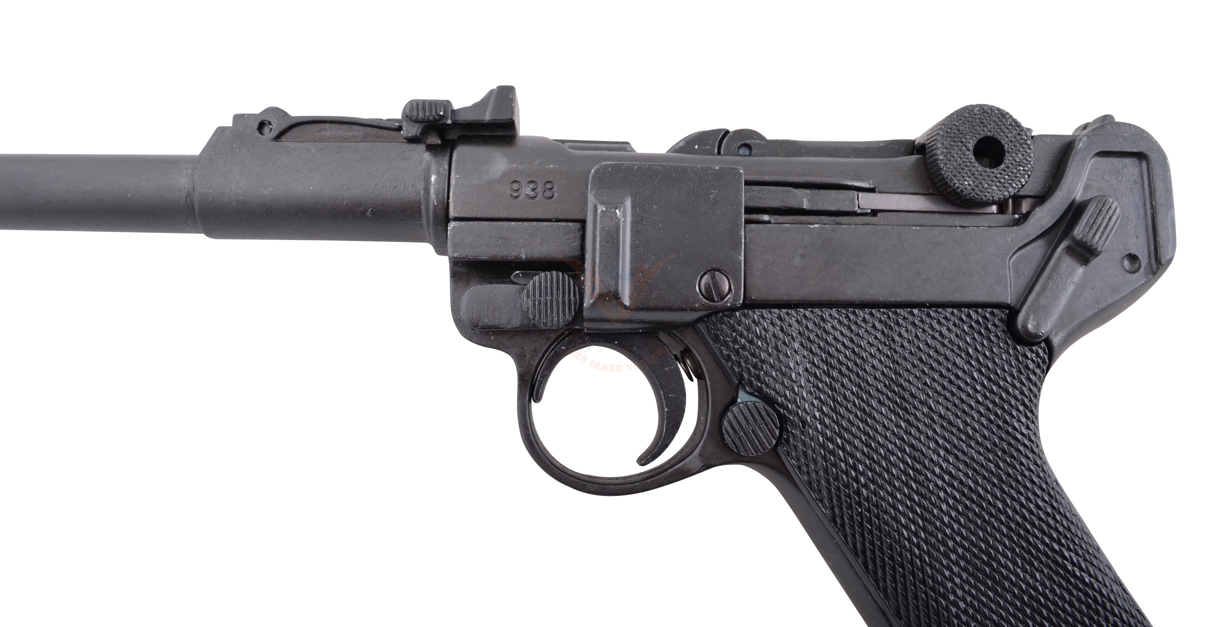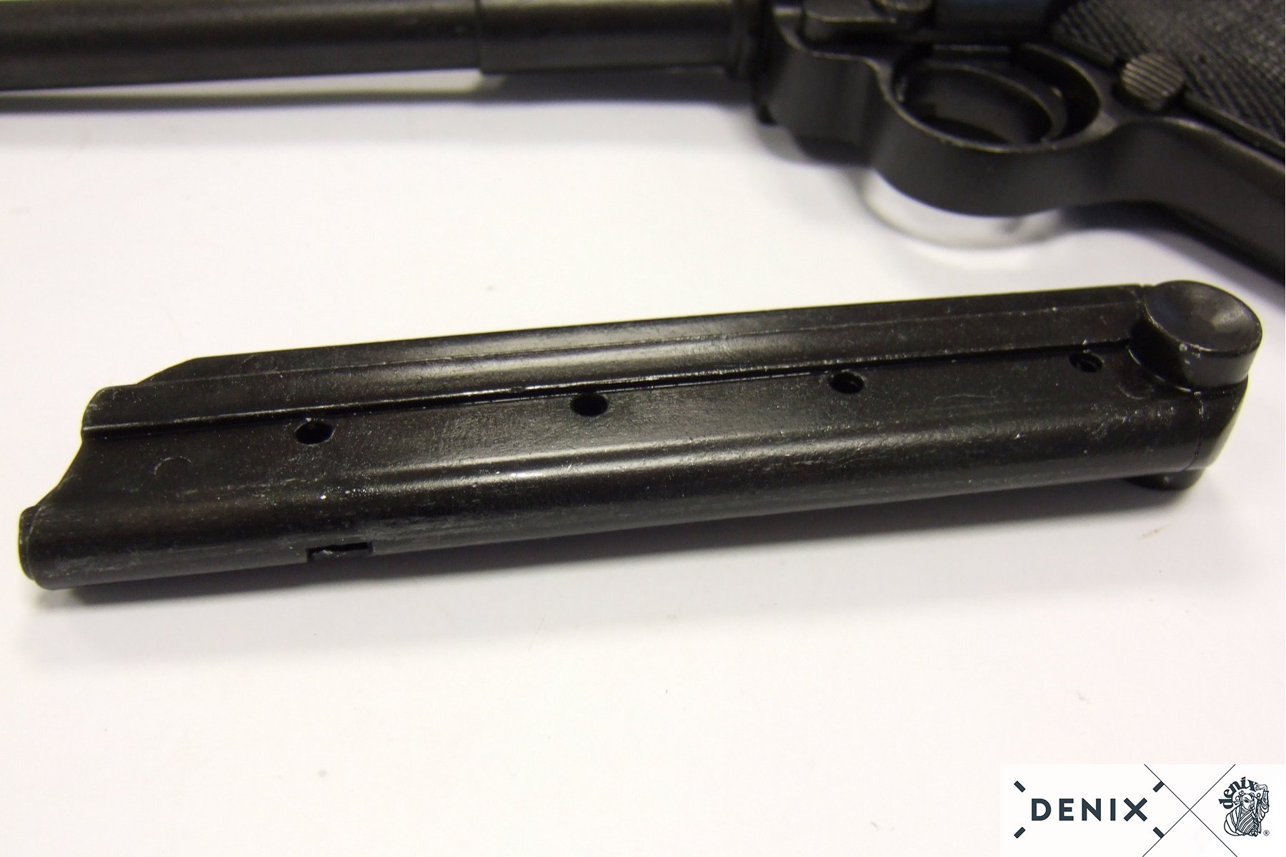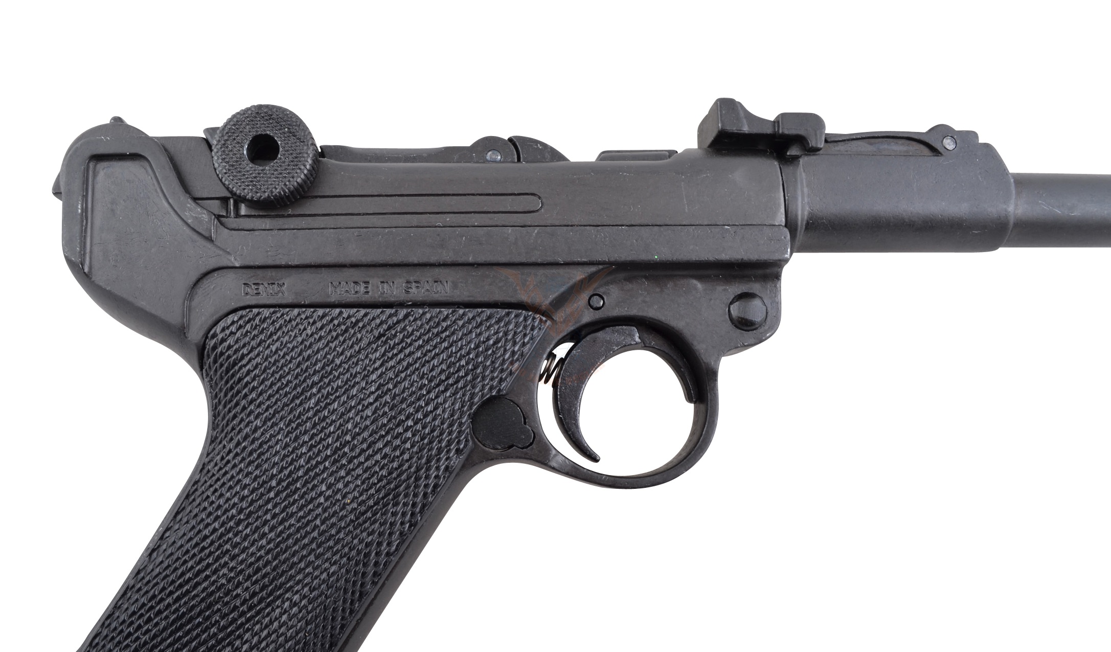 Макет Люгер P08 представляет собой точную как внешне, так и по габаритам и весу копию боевого прототипа, выполненную мастерами испанской компании Denix. Модель имеет подвижный ударно-спусковой механизм, что делает ее еще более реалистичной. Для изготовления данного экземпляра использован специальный металлический сплав на основе цинка, обеспечивающий оружию достаточную прочность и долговечность. На рукоятке револьвера имеется пластиковая накладка с рифленой поверхностью. Кроме клейма, свидетельствующего о стране происхождения макета, других надписей нет.