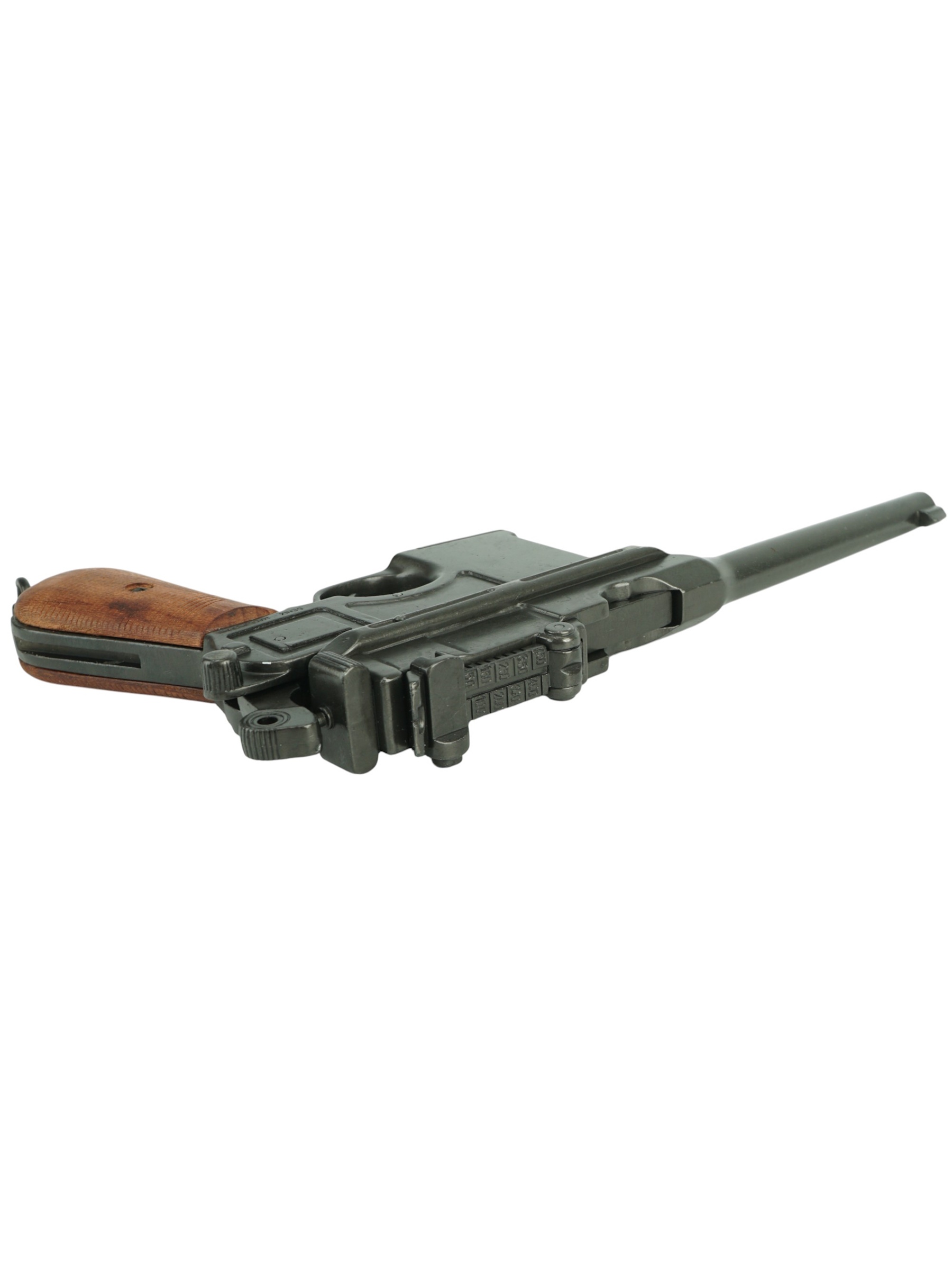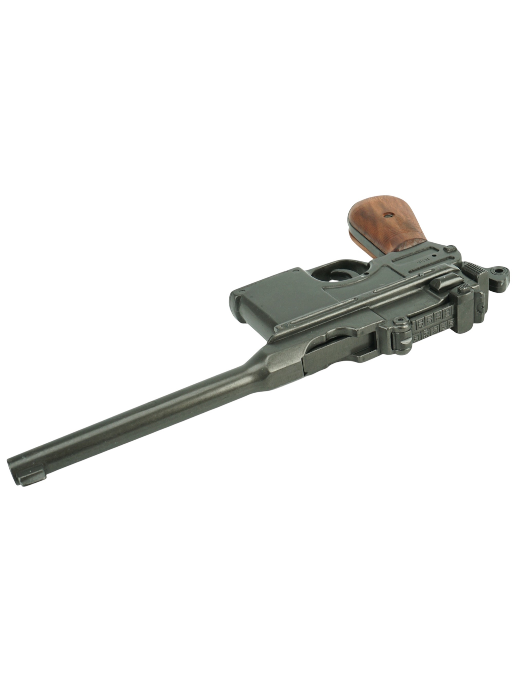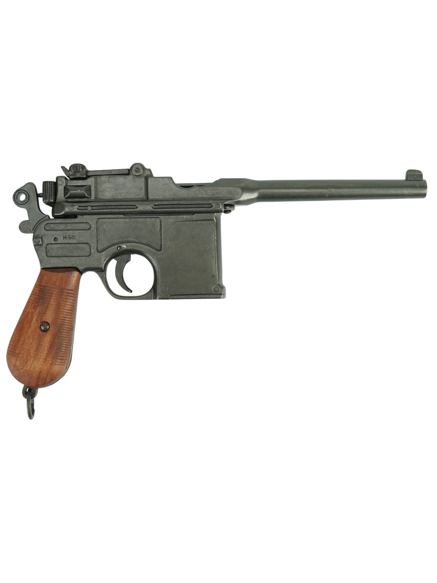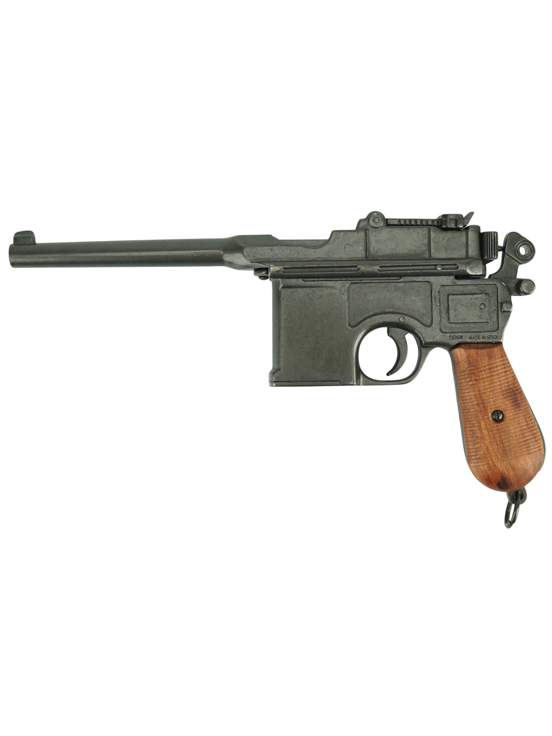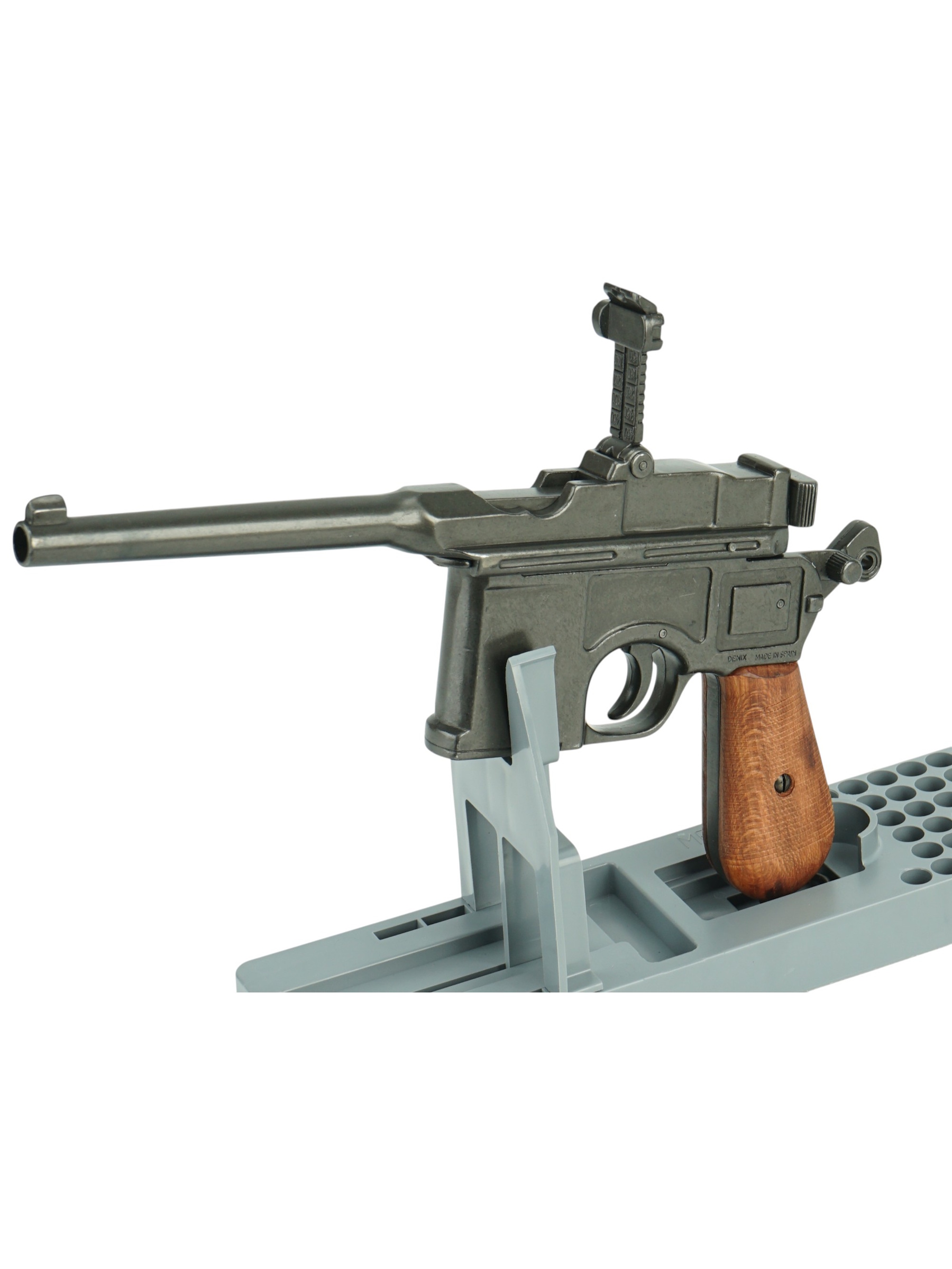 Макет пистолета Маузер с деревянной рукоятью от испанского бренда Denix отличается точным соответствием боевому аналогу, и является его объемно-весовой копией. Корпус оружия и его подвижные части выполнены из латуни, деревянный приклад изготовлен из тополя. Без учета приклада длина макета составляет 320 мм, вес – 1,12 кг.