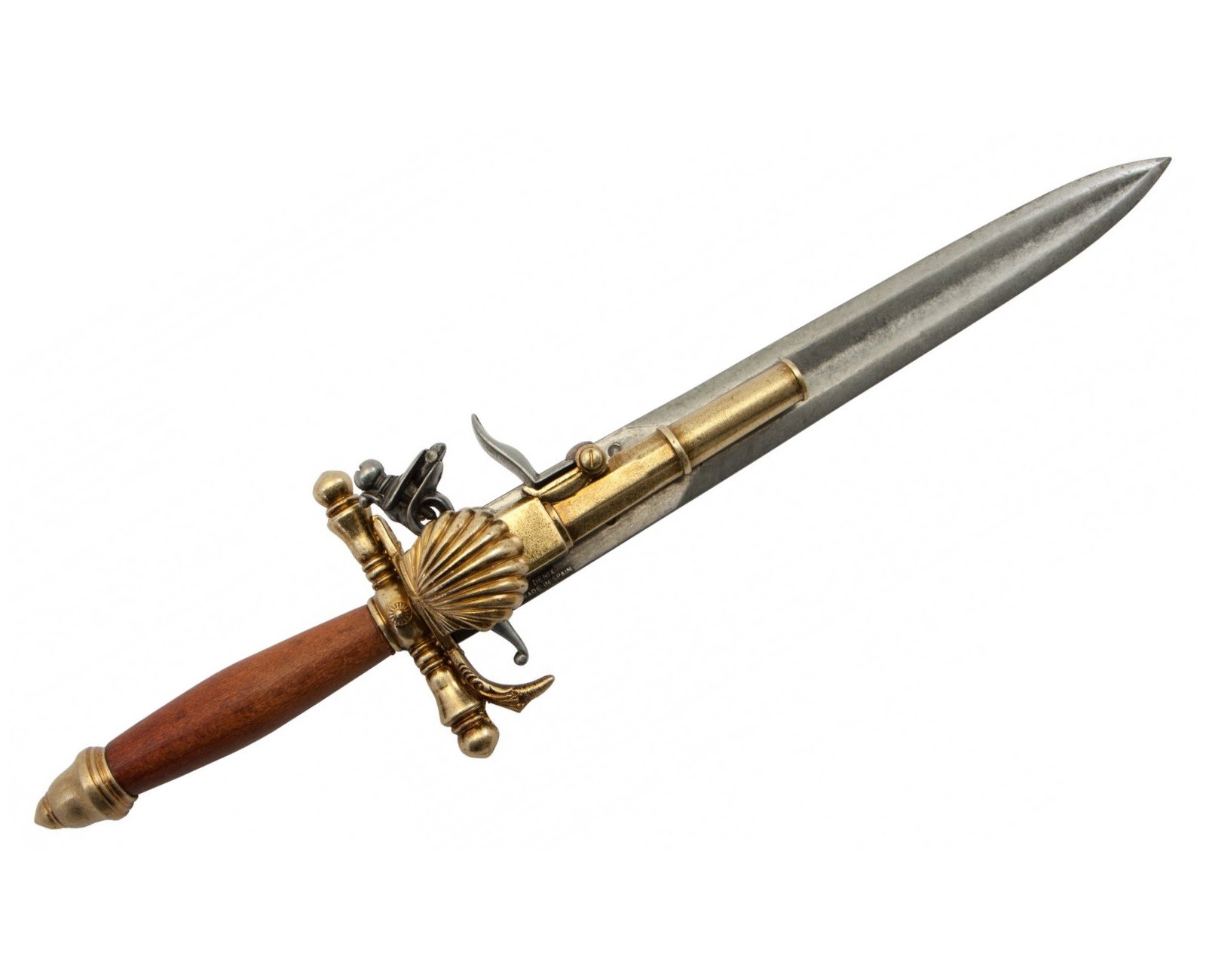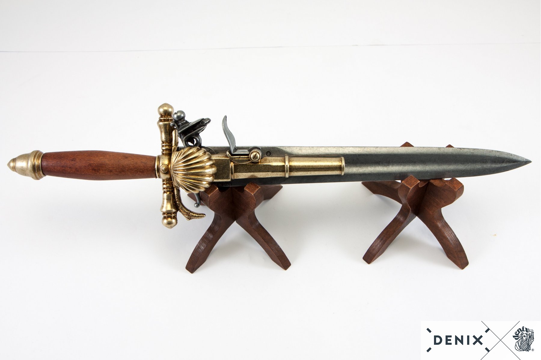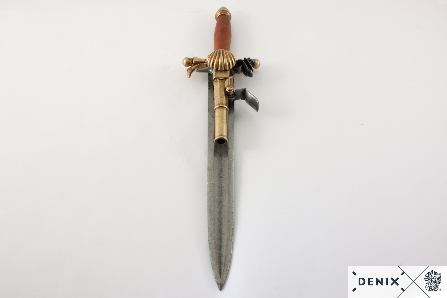 Таким оригинальным оружием является и пиратский пистолет-нож, относящийся к периоду 15-18 веков. Макет этого нестандартного оружия представляет испанский бренд Denix. Такой пистолет заряжался одним патроном, и мог произвести только один выстрел, после чего в дело должен был вступать нож. Эксперты считают, что подобное оружие часто использовали французские пираты при взятии кораблей на абордаж. Корпус пистолета и лезвие ножа изготовлены из металлического сплава замак, а рукоятка выполнена из натурального дерева. Макет DE-1204 по размеру, форме и конструкции аналогичен оригинальному образцу.