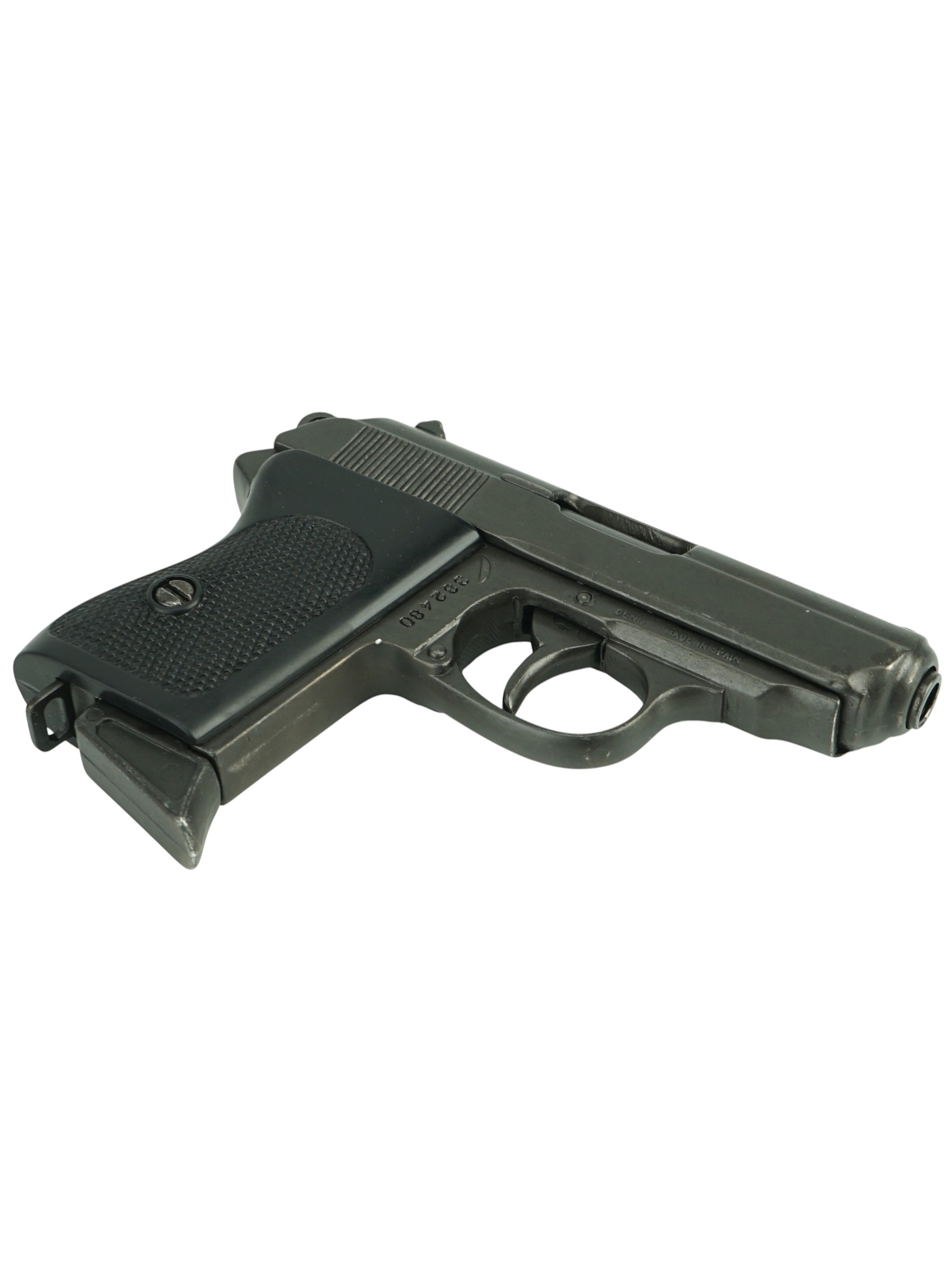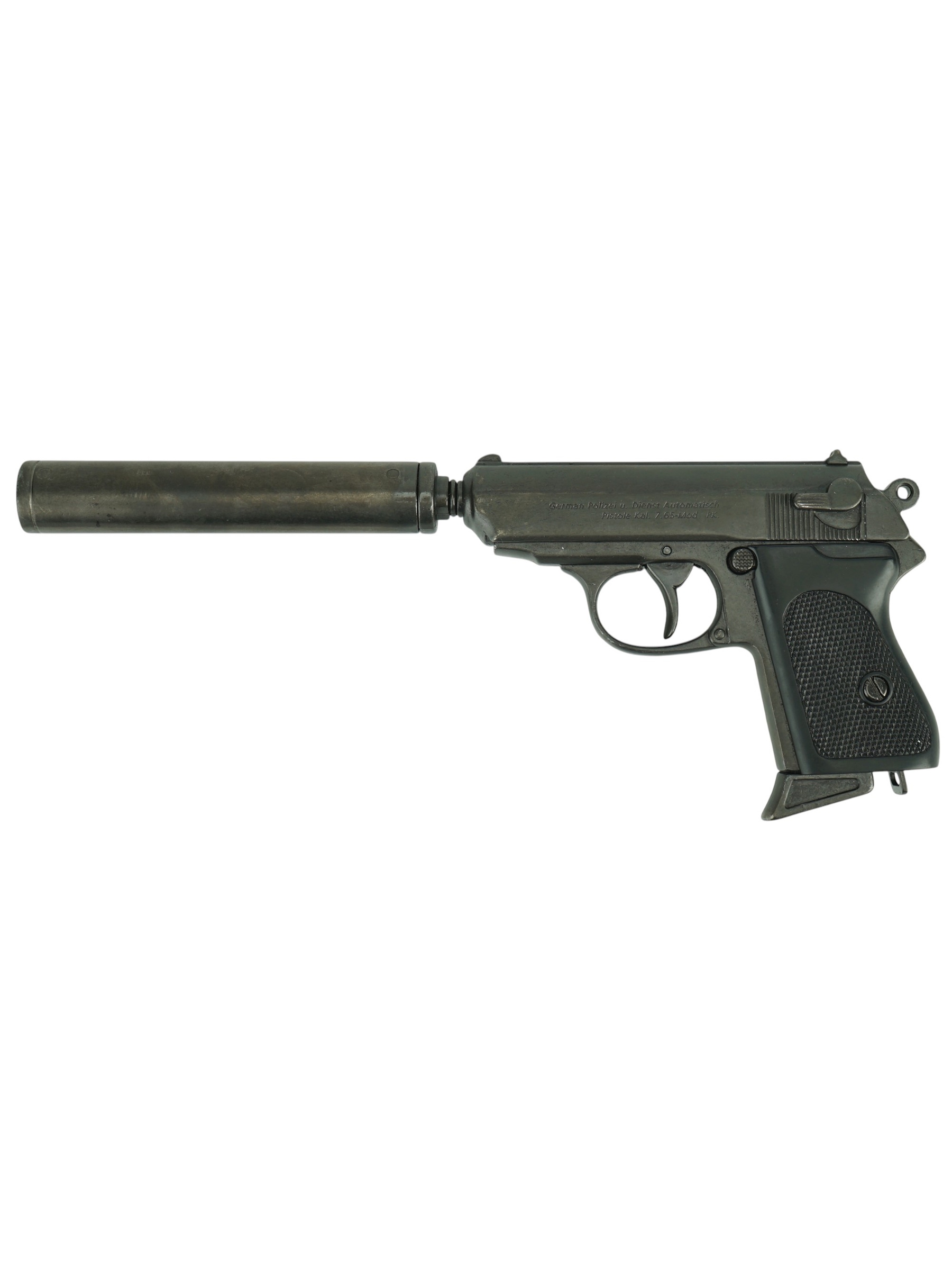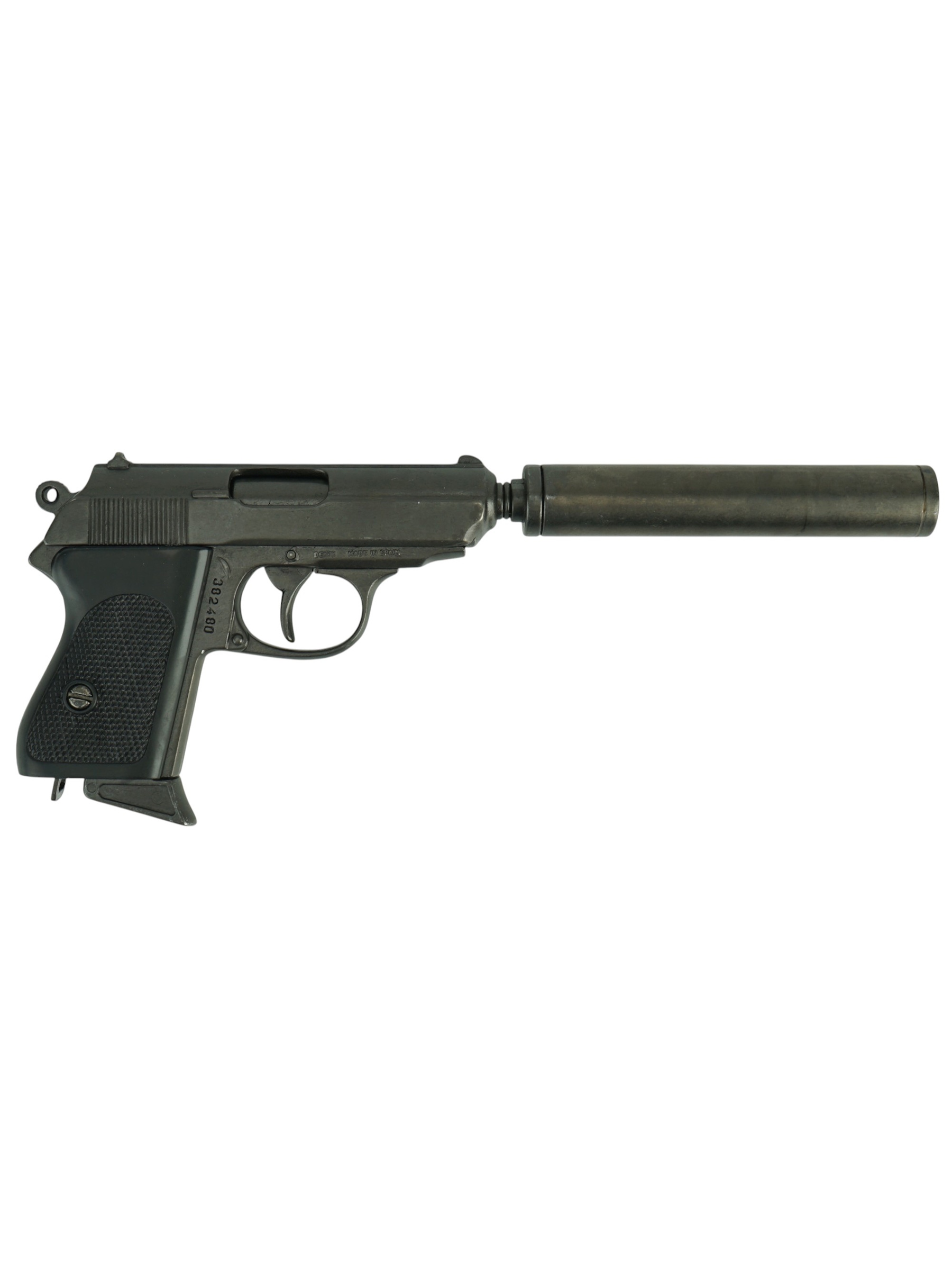 Макет пистолет Вальтер PPK с глушителем (Германия, 1931 г.) DE-1311 – это копия немецкого оружия, патент на его производство после поражения Германии во Второй мировой купили несколько стран-союзников. Данная модель отличается наличием глушителя, что практически вдвое увеличивает ее длину. Вальтер РРК без глушителя отличался небольшими размерами, и считался отличной моделью для скрытого ношения. Кстати, Бонд в исполнении Шона Коннери не раз был замечен именно с таким Вальтером.