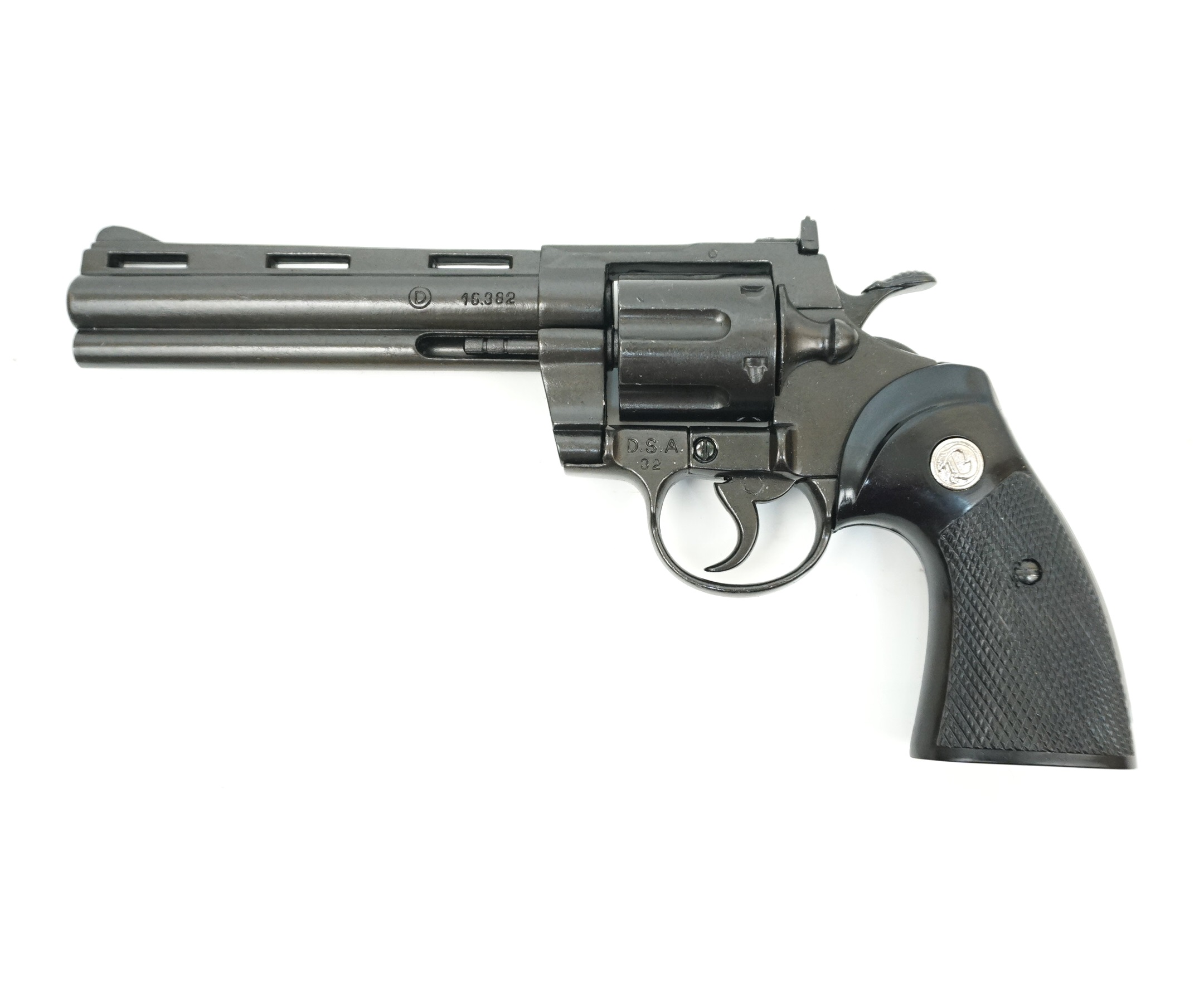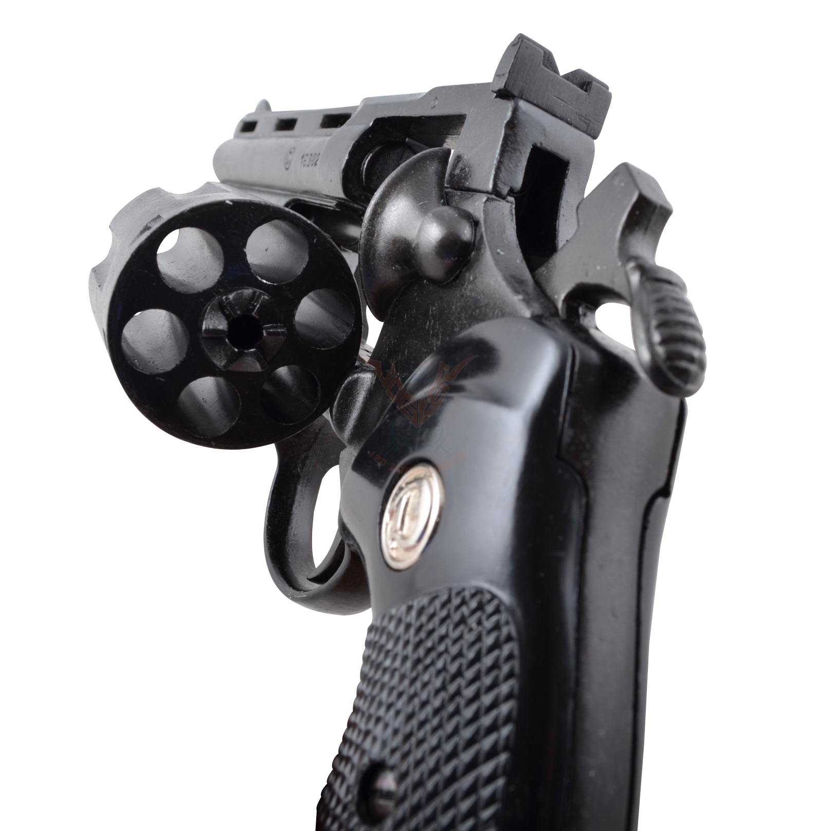 Выполнен пистолет револьвер магнум из металла с пластиковыми накладками на рукояти.