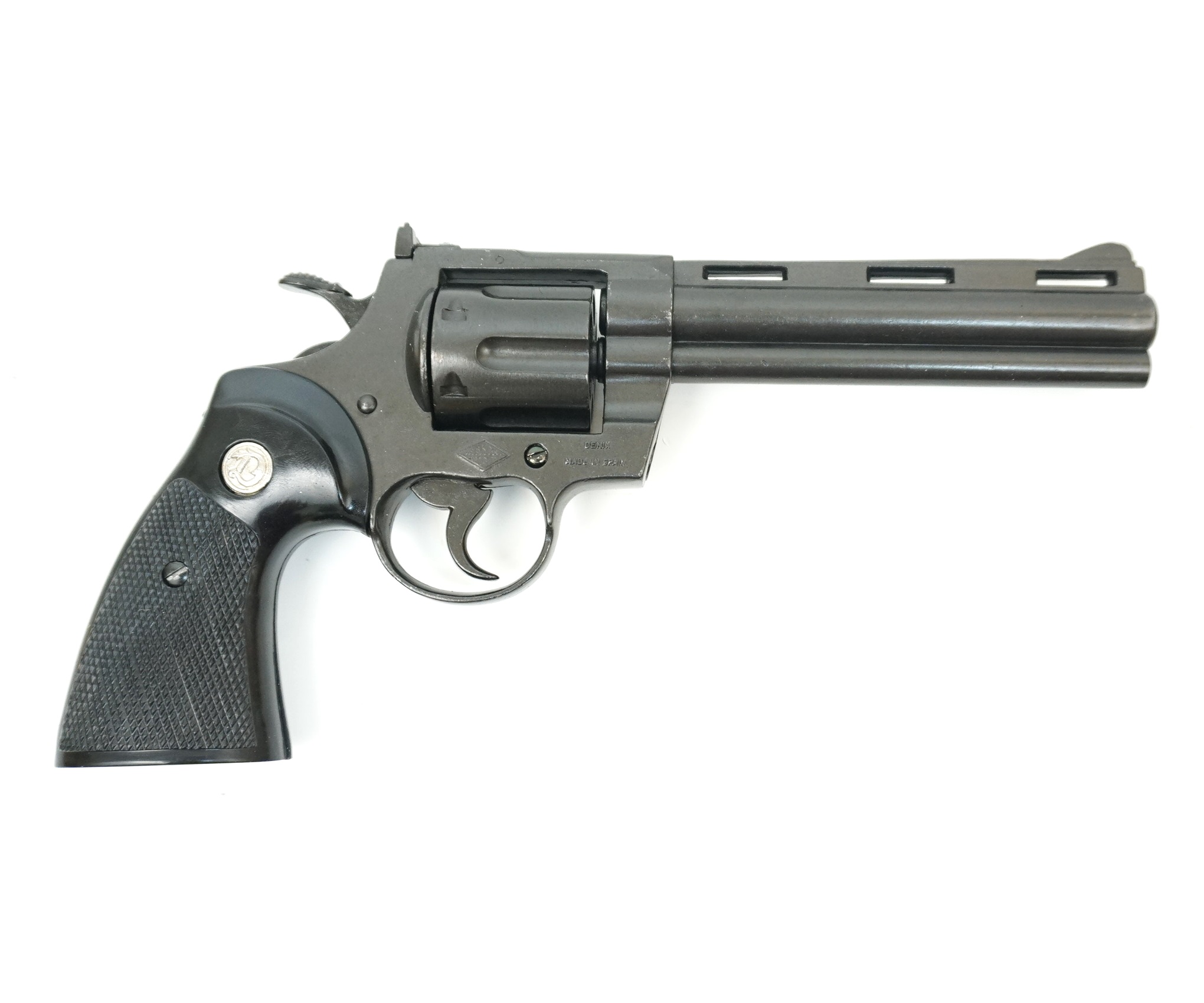 Представленная копия револьвера Python калибра .357 Магнум выполнена с подвижным (откидывающимся, вращающимся) цилиндром-барабаном с шестью каморами под патроны, и ударно-спусковым механизмом.