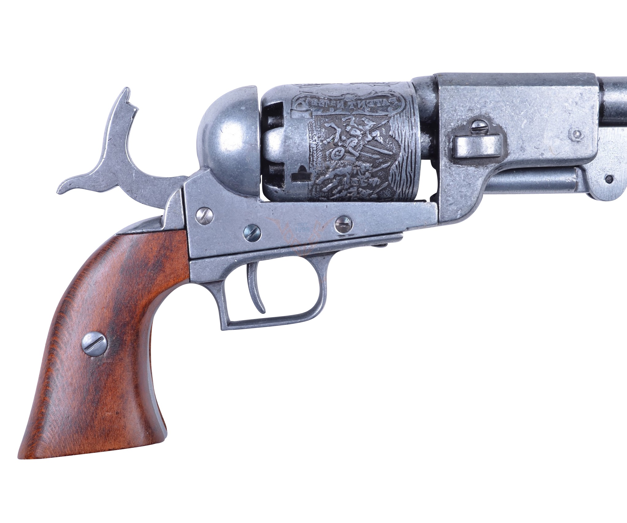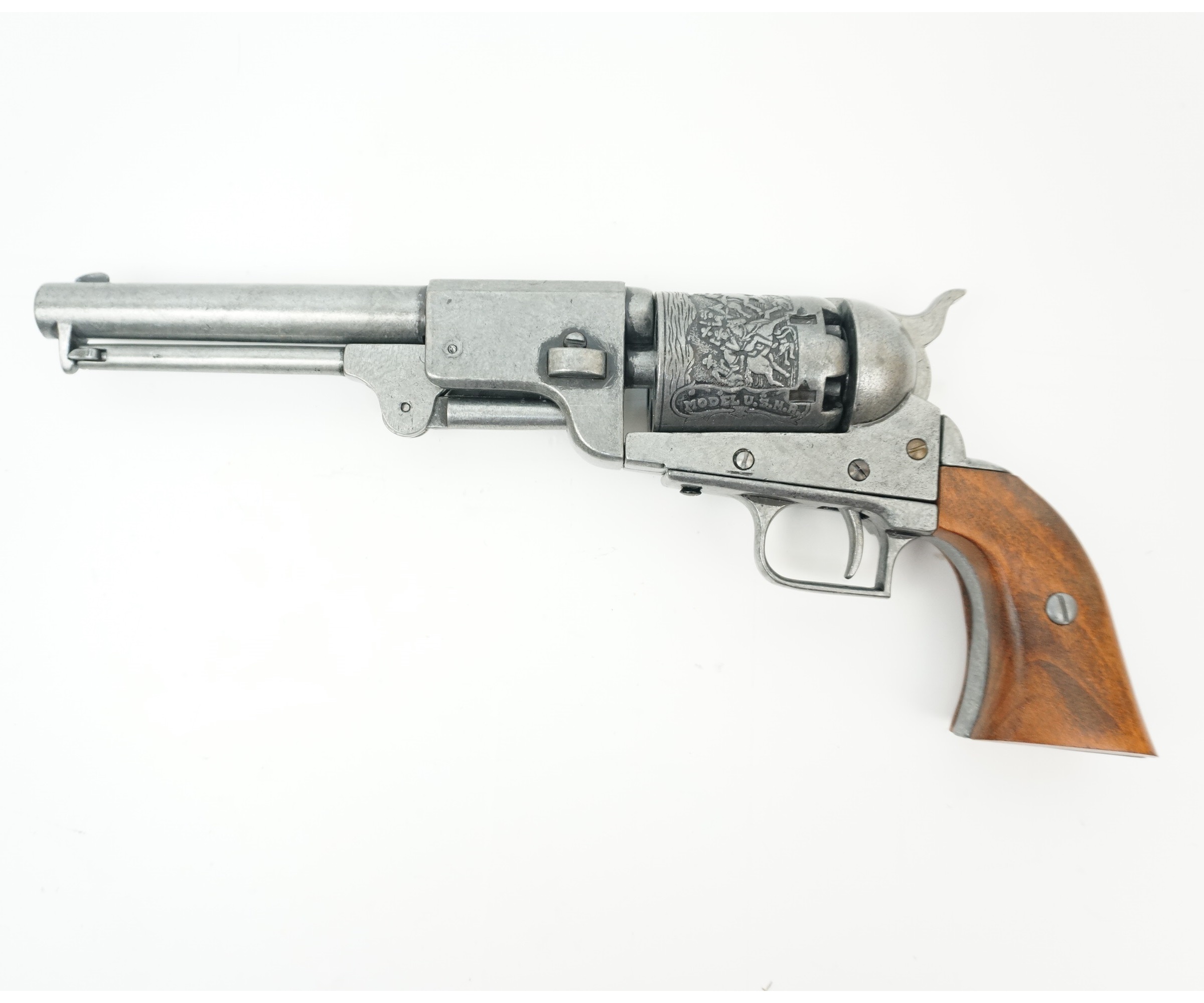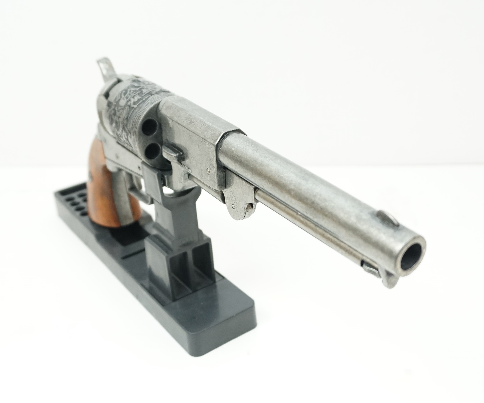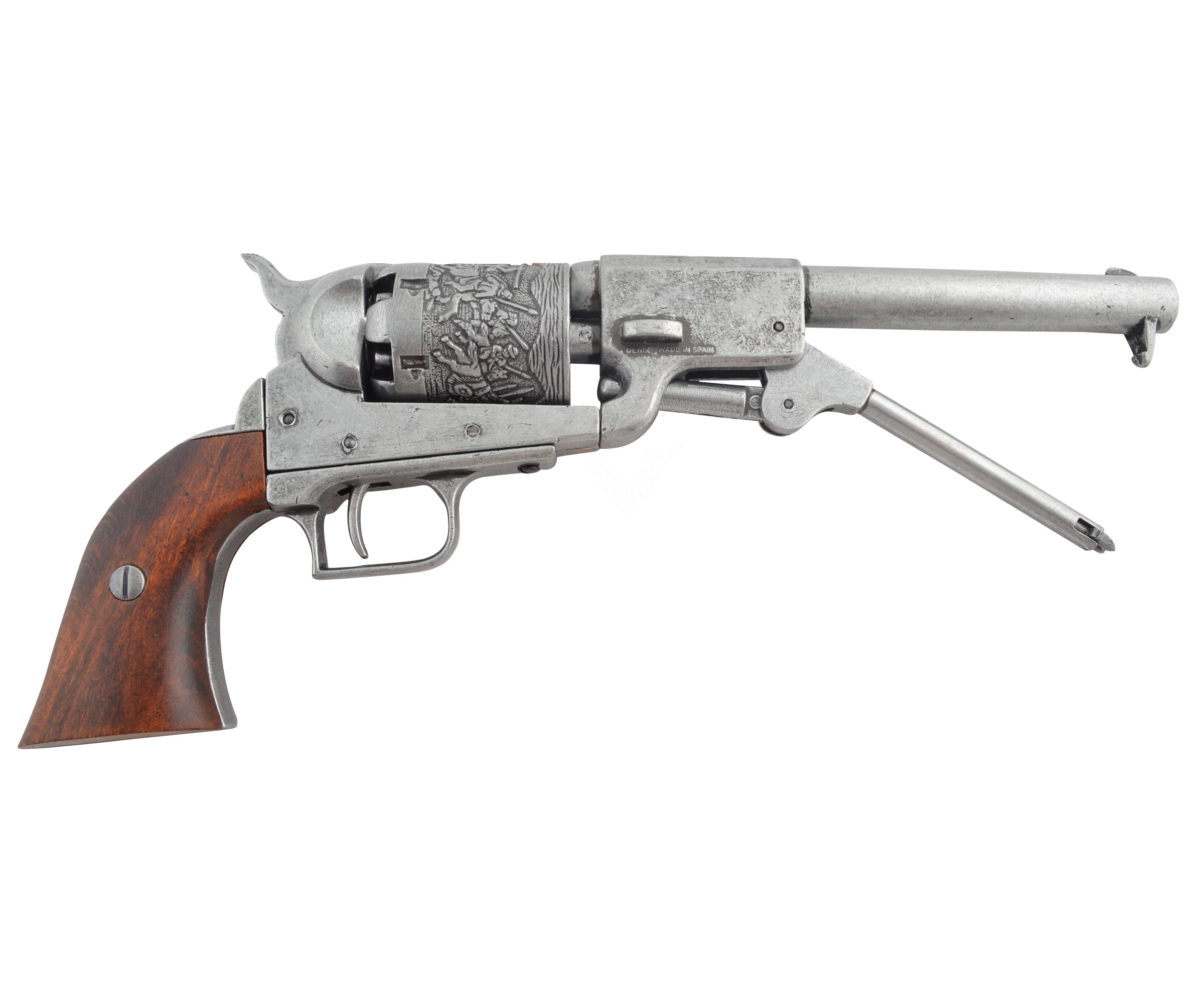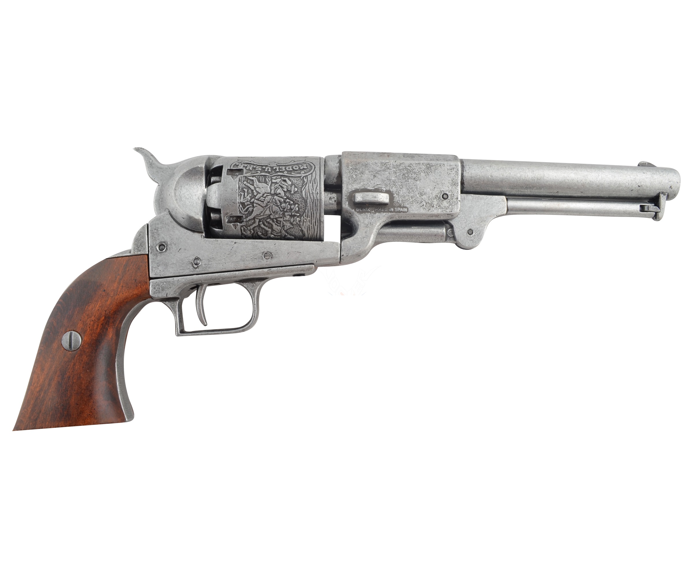 Кольт драгунский, изготовленный мастерами бренда Denix, отличается достойным качеством исполнения. Как внешне, так и по общим параметрам изделие идеально соответствует своему историческому прототипу – револьвер весит 1,57 кг, общая длина его составляет 35 см. В качестве материала специалисты Denix использовали специальный сплав с цинком, который обеспечивает достаточно высокую прочность макету. Рукоятка револьвер изготовлена из массива натурального дерева. На поверхность барабана с шестью каморами нанесена гравировка, изображающая сражение с индейцами. Имеет стилизованный шомпол. Подвижный УСМ позволяет выполнить взведение и услышать специфический щелчок при нажатии на крючок спуска.