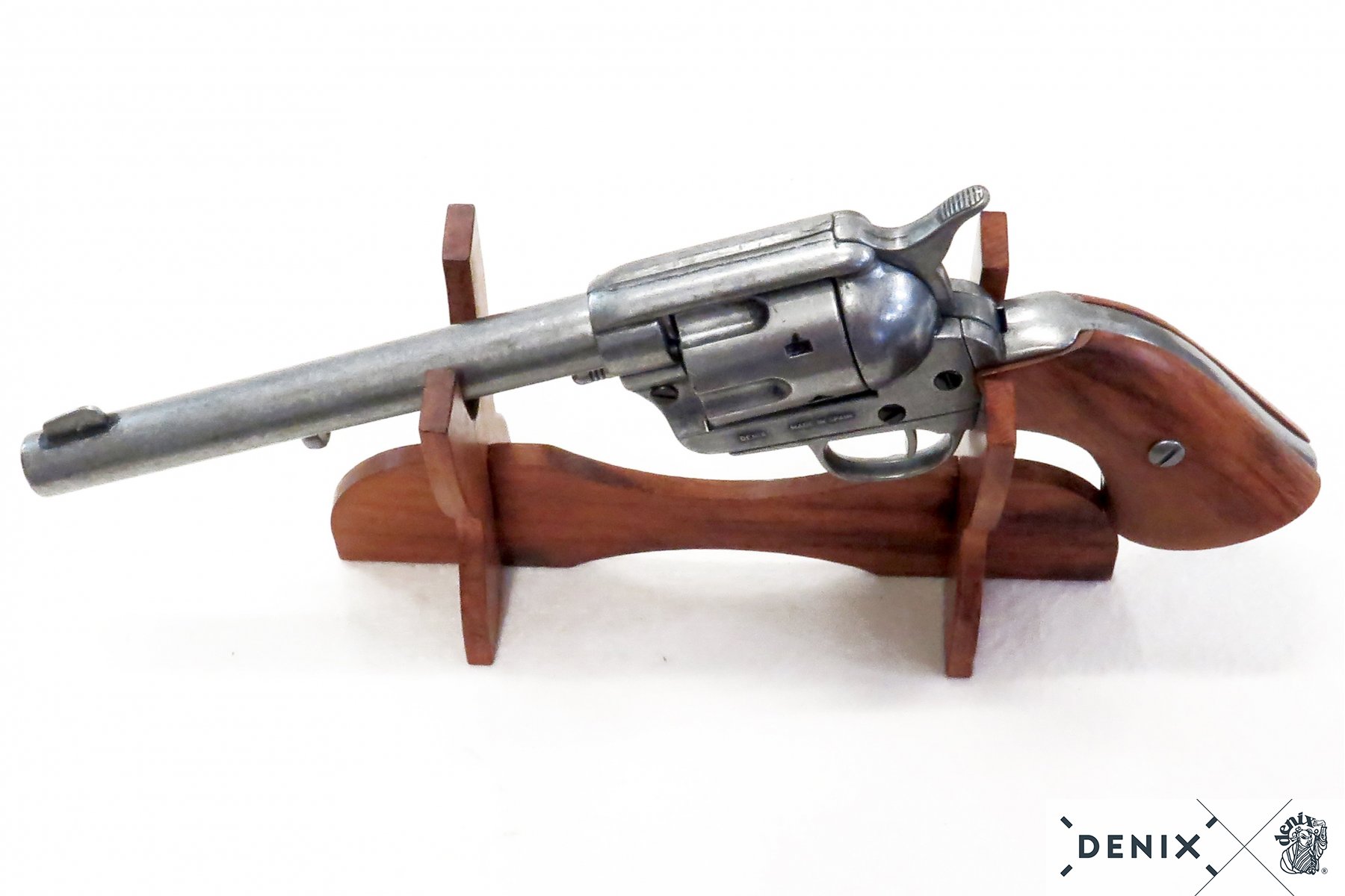 Макет кольт кавалерийский 45 калибра от специалистов испанского бренда Denix отличает скрупулезность к деталям и совершенный внешний вид, Внешне практически невозможно отличить данный макет от оригинального образца. Для производства данной модели использована сталь и металлический сплав с цинком. Рукоять эргономичной формы выполнена из массива натурального дерева. Длина оружия полностью отвечает длине боевого прототипа – 34 см, как и его вес – 1,02 кг. Курок макета взводится, барабан вращается. Держа в руке такой макет, у вас будет ощущение обладания реальным боевым оружием. При этом купить такой экземпляр может каждый желающий – он совершенно безопасен.