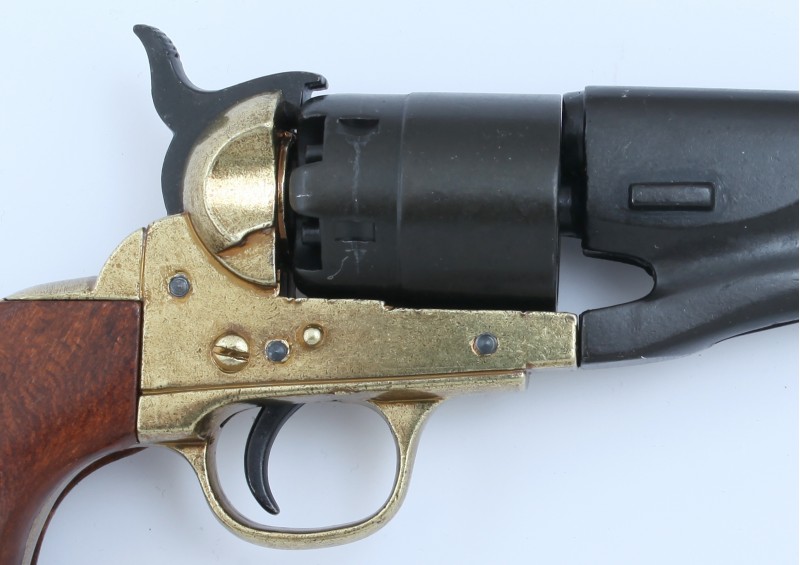 Макет револьвера Кольт DE-1007-L времен Гражданской войны от испанского бренда Denix отличается высокой степенью сходства с боевым аналогом, его габариты, масса и конструкция полностью отвечают оригиналу. Корпус револьвера изготовлен из металлического сплава хорошей прочности, обеспечивающего долговечность этому оружию. Часть элементов оружия изготовлены из латуни, на рукоятке имеются деревянные накладки, для удобства удержания револьвера. Это изящное и эффектное оружие имеет подвижные элементы, однако не рассчитан на ведение стрельбы. Покупка макета револьвера доступна сегодня всем желающим.