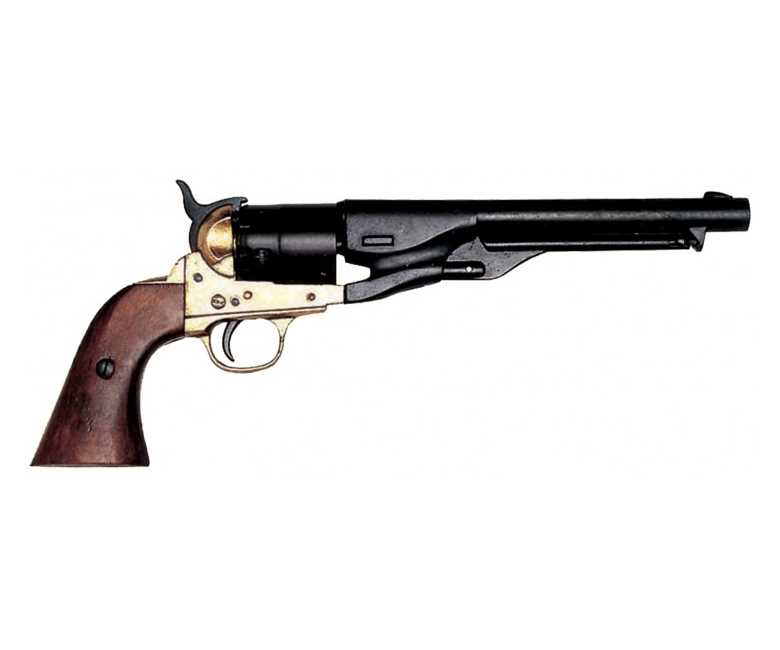 Макет револьвер Кольт – это выполненная в полном масштабе копия реального боевого оружия времен Гражданской войны в США. Прототипом этого макета является Colt Army образца 1860 года. Эксперты считают, что именно эта модификация Кольта стала наиболее удачной и продвинутой, если речь идет о капсюльном оружии. Револьвер стрелял боеприпасами 44 калибра, и имел массу преимуществ по сравнению со своими предшественниками. В частности, он был гораздо легче за счет изменения конфигурации ствола с 8-гранного на круглый, а также благодаря замене барабана-цилиндра на барабан переменного сечения. Также изменения в конструкции револьвера коснулись и механизма подствольного пресса – вместо шестеренчатой его конструкции стала использоваться простая рычажная.