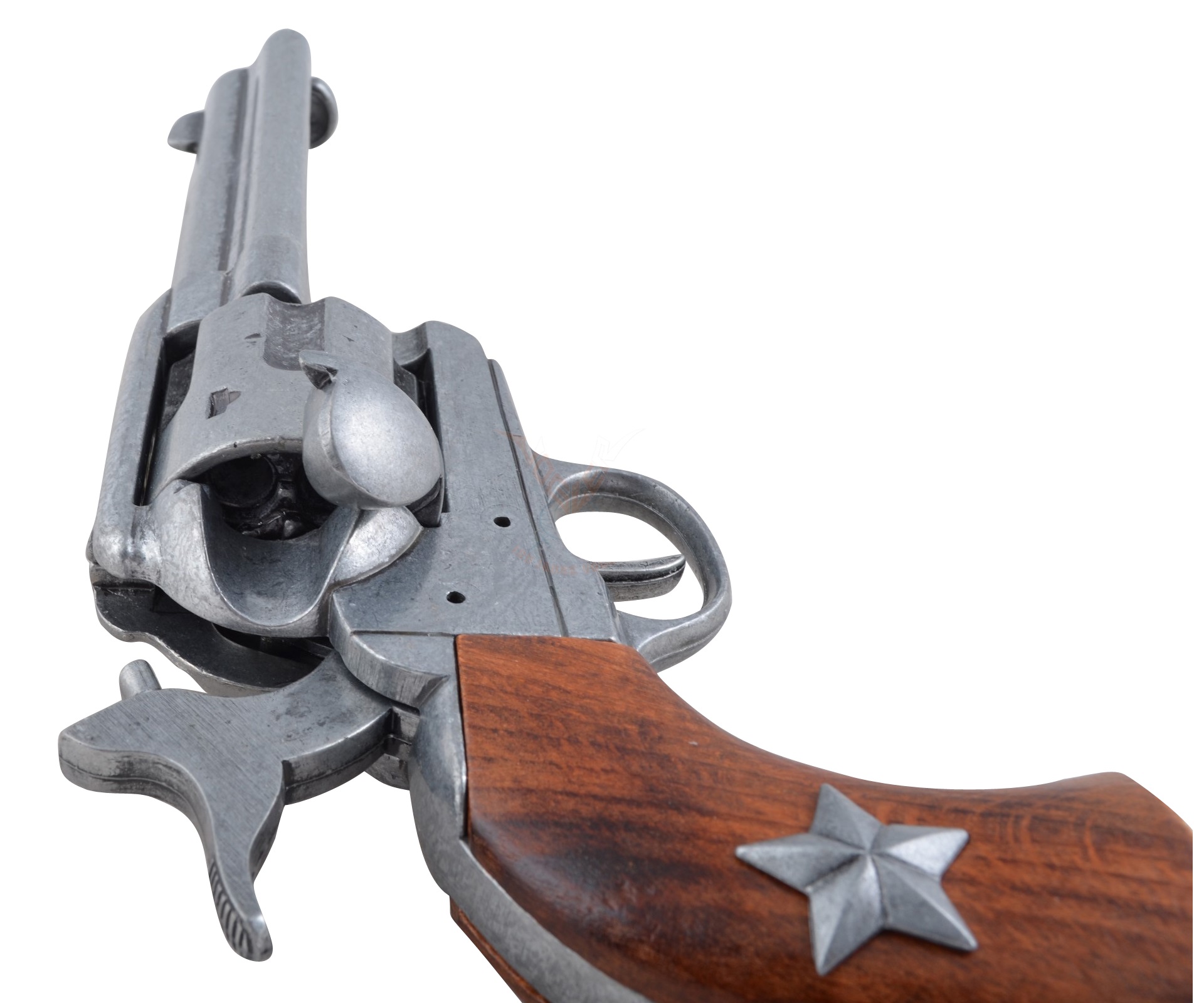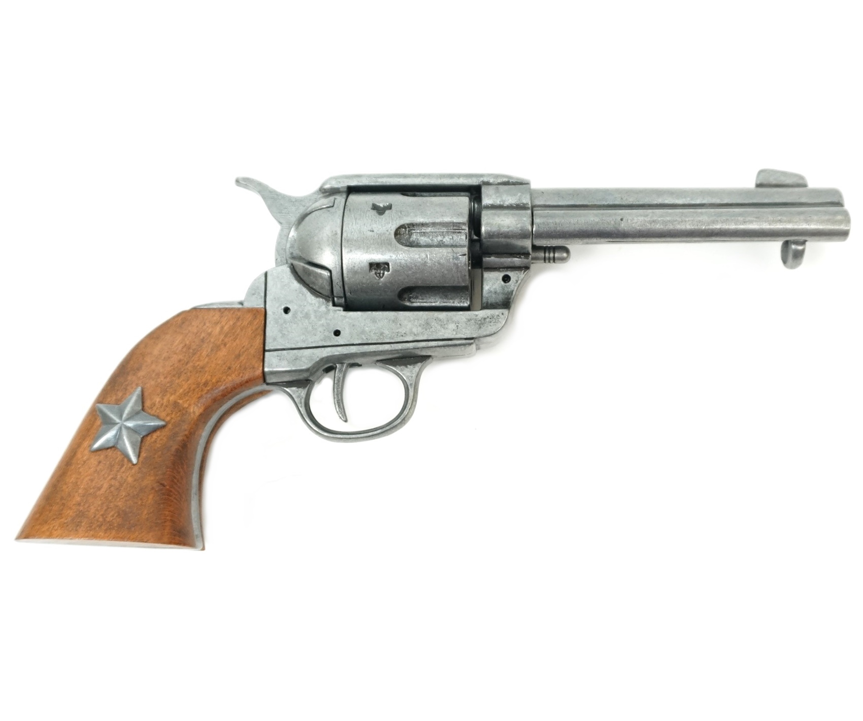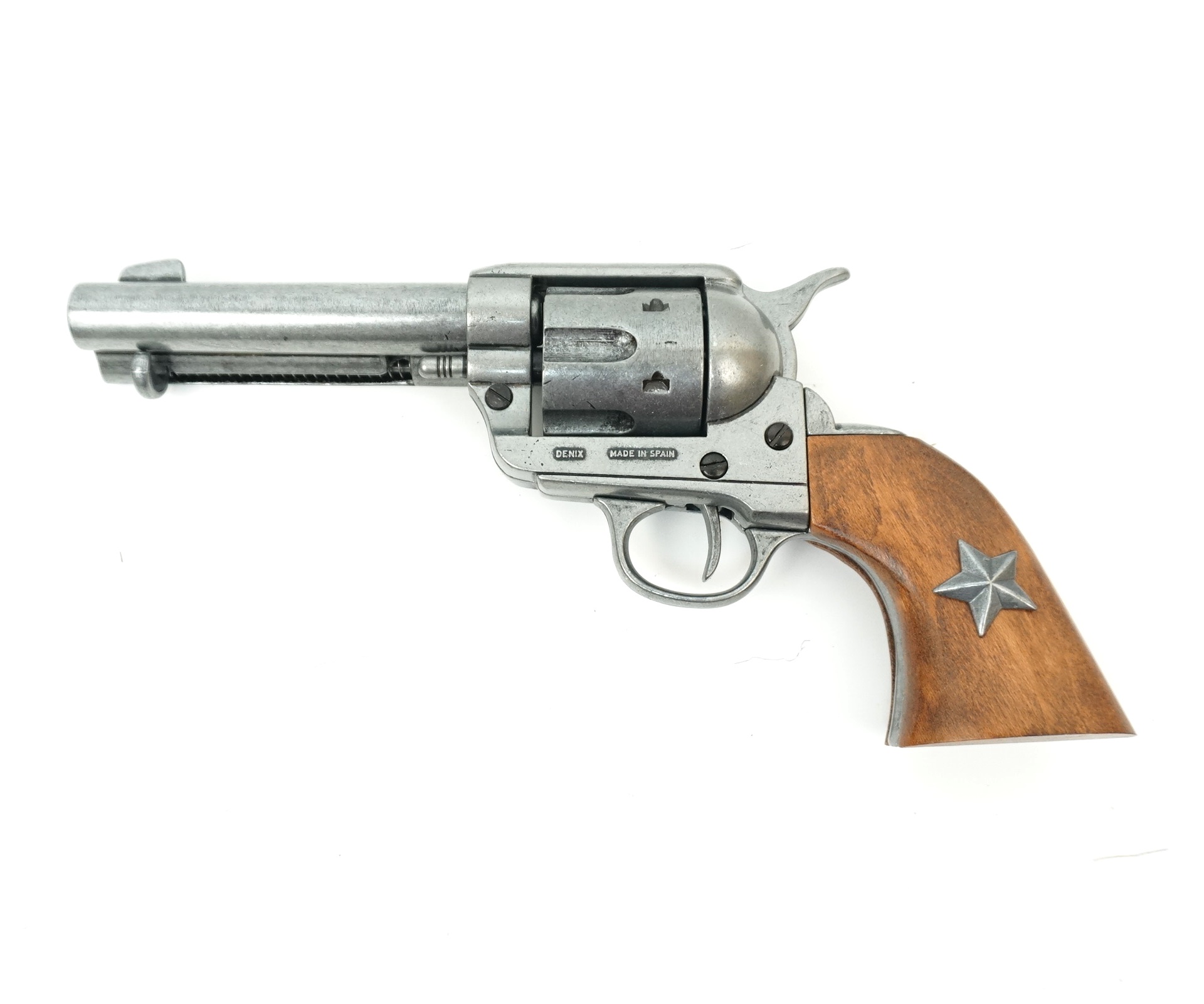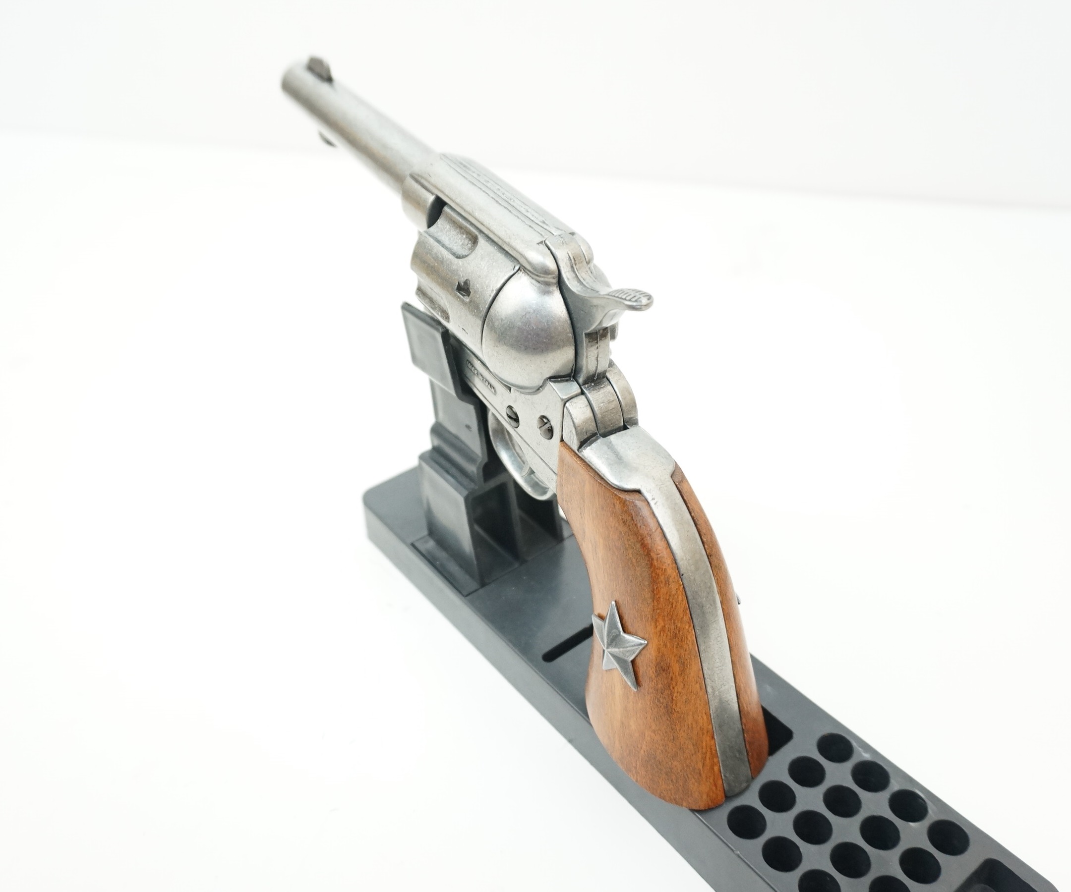 Макет револьвер Кольт Peacemaker, .45 калибра, 4,75" (США, 1886 г.) DE-1038 – это внешне полностью отвечающая боевому прототипу модель знаменитого оружия. Кольт Peacemaker выпускался с 1873 года, причем с различной длиной ствола (7,5 дюймов, 5, 5 дюймов и 4,75 дюймов и т.д.). Кольт Миротворец со стволом 4,75" 1886 года выпуска считался коммерческой модификацией.