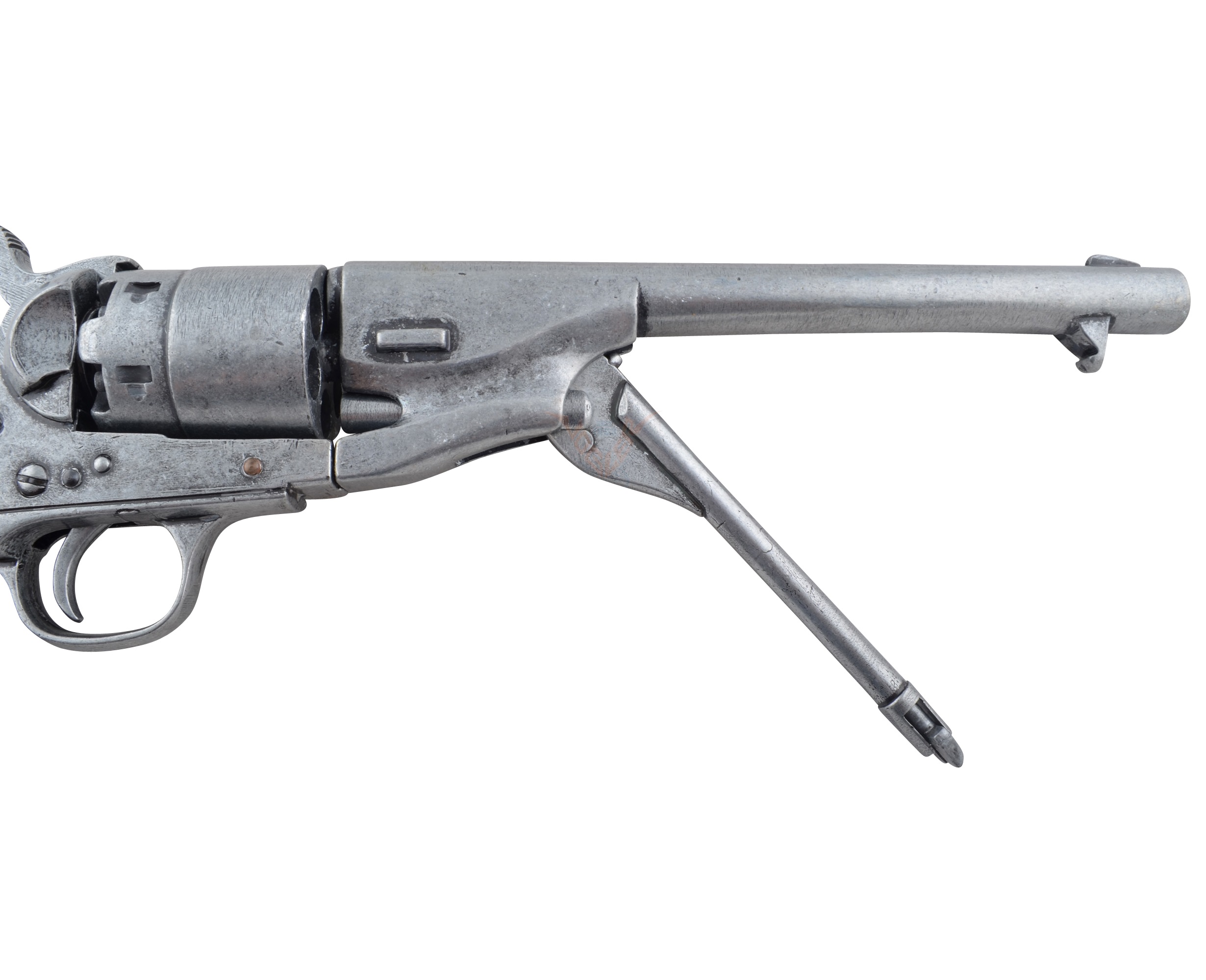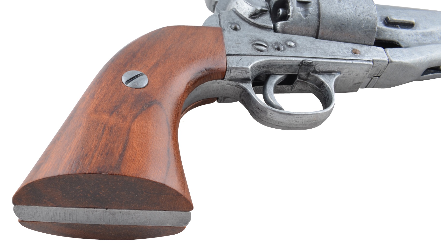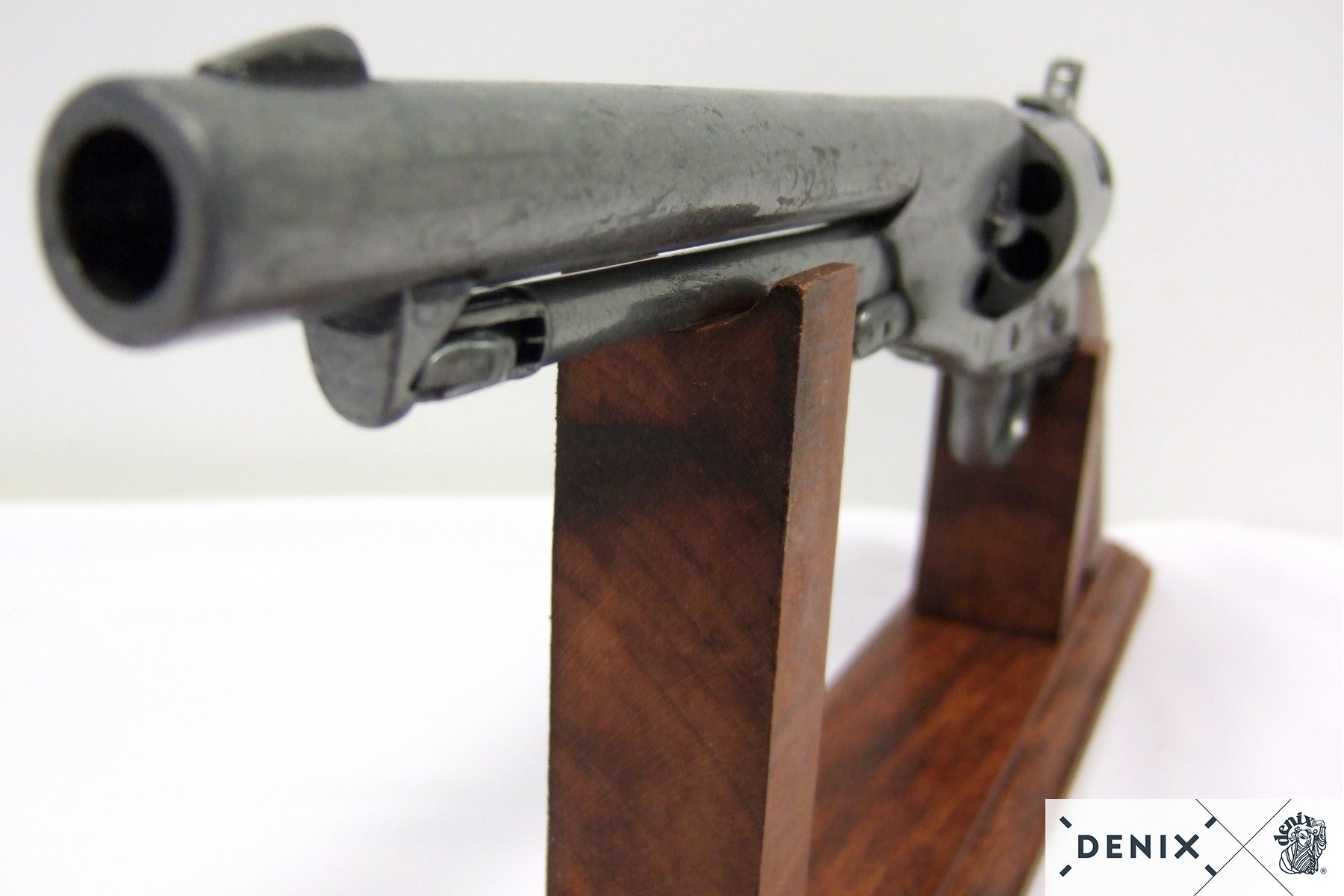 Макет револьвера Кольт DE-1007-G времен Гражданской войны от испанского бренда Denix отличается высокой степенью сходства с боевым аналогом, его габариты, масса и конструкция полностью отвечают оригиналу. Корпус револьвера изготовлен из металлического сплава хорошей прочности, обеспечивающего долговечность этому оружию. Часть элементов оружия изготовлены из стали, на рукоятке имеются деревянные накладки, для удобства удержания револьвера. Это изящное и эффектное оружие имеет подвижные элементы, однако не рассчитан на ведение стрельбы. Покупка макета револьвера доступна сегодня всем желающим.