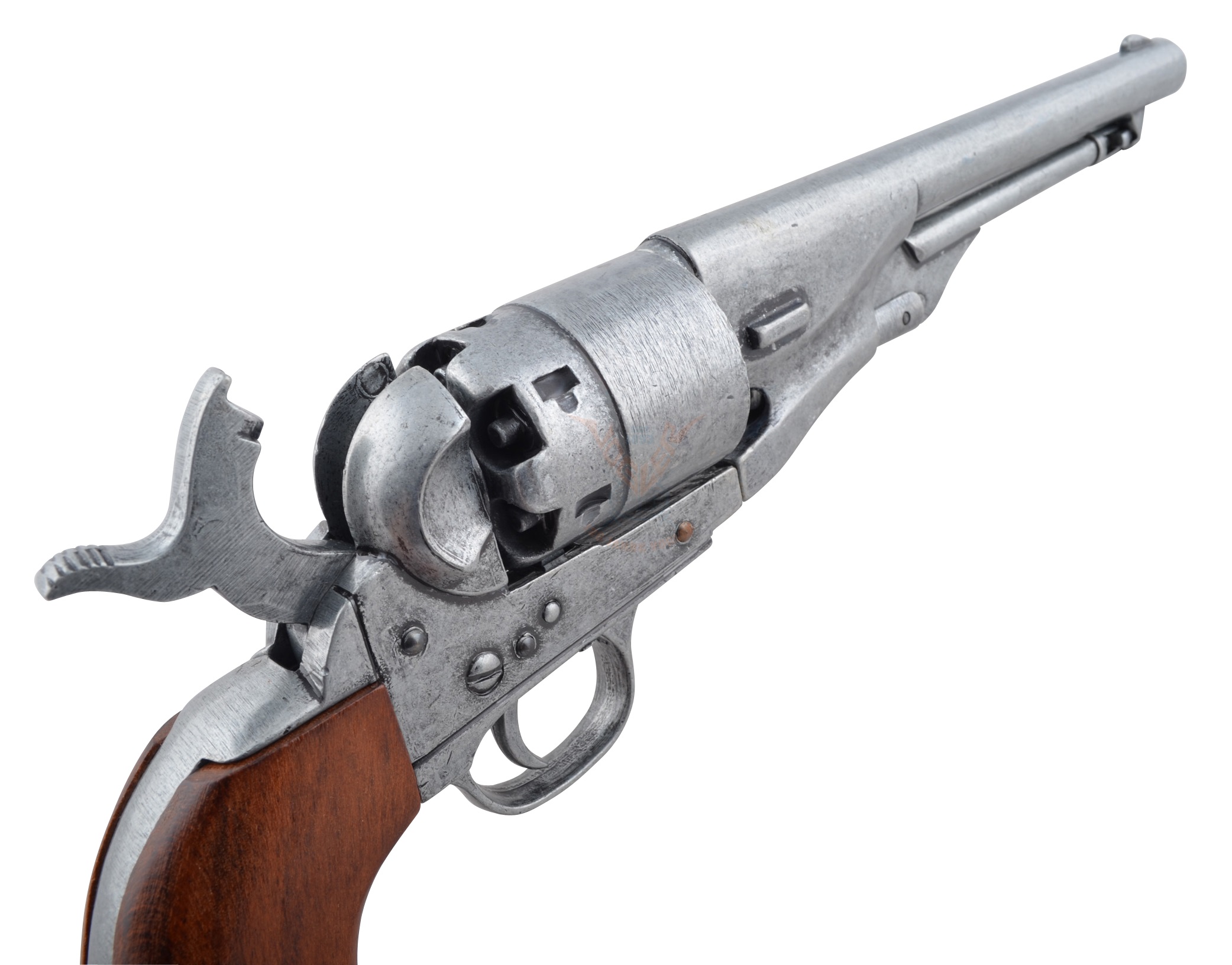 Макет револьвер Кольт – это выполненная в полном масштабе копия реального боевого оружия времен Гражданской войны в США. Прототипом этого макета является Colt Army образца 1860 года. Эксперты считают, что именно эта модификация Кольта стала наиболее удачной и продвинутой, если речь идет о капсюльном оружии. Револьвер стрелял боеприпасами 44 калибра, и имел массу преимуществ по сравнению со своими предшественниками. В частности, он был гораздо легче за счет изменения конфигурации ствола с 8-гранного на круглый, а также благодаря замене барабана-цилиндра на барабан переменного сечения. Также изменения в конструкции револьвера коснулись и механизма подствольного пресса – вместо шестеренчатой его конструкции стала использоваться простая рычажная.