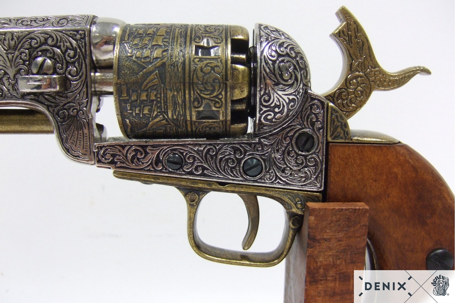 Макет револьвера DE-1040-L представляет собой полномасштабную, отличного качества копию, выполненную с большим вниманием к самым мелким деталям. Основание оружия изготовлено из прочного и легкого сплава на основе цинка, оружие украшено эффектной инкрустацией по латуни. На рукоятке имеются накладки из натурального дерева. Общая длина револьвера составляет 35 см, весит он столько же, сколько и оригинал – 1,05 кг. Наличие подвижных частей - УСМ и барабана добавляет модели реалистичности. Такое оружие очень приятно держать в руках, выглядит оно правдоподобно и достаточно грозно, но на стрельбу любыми боеприпасами не рассчитано.