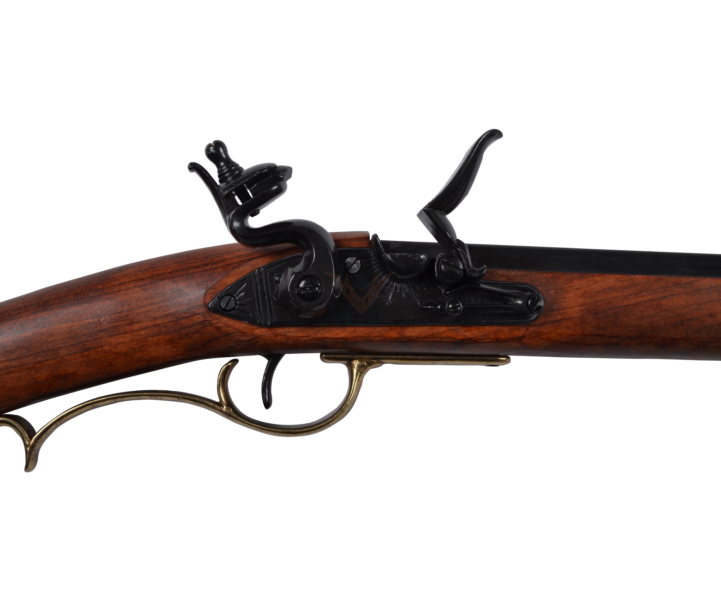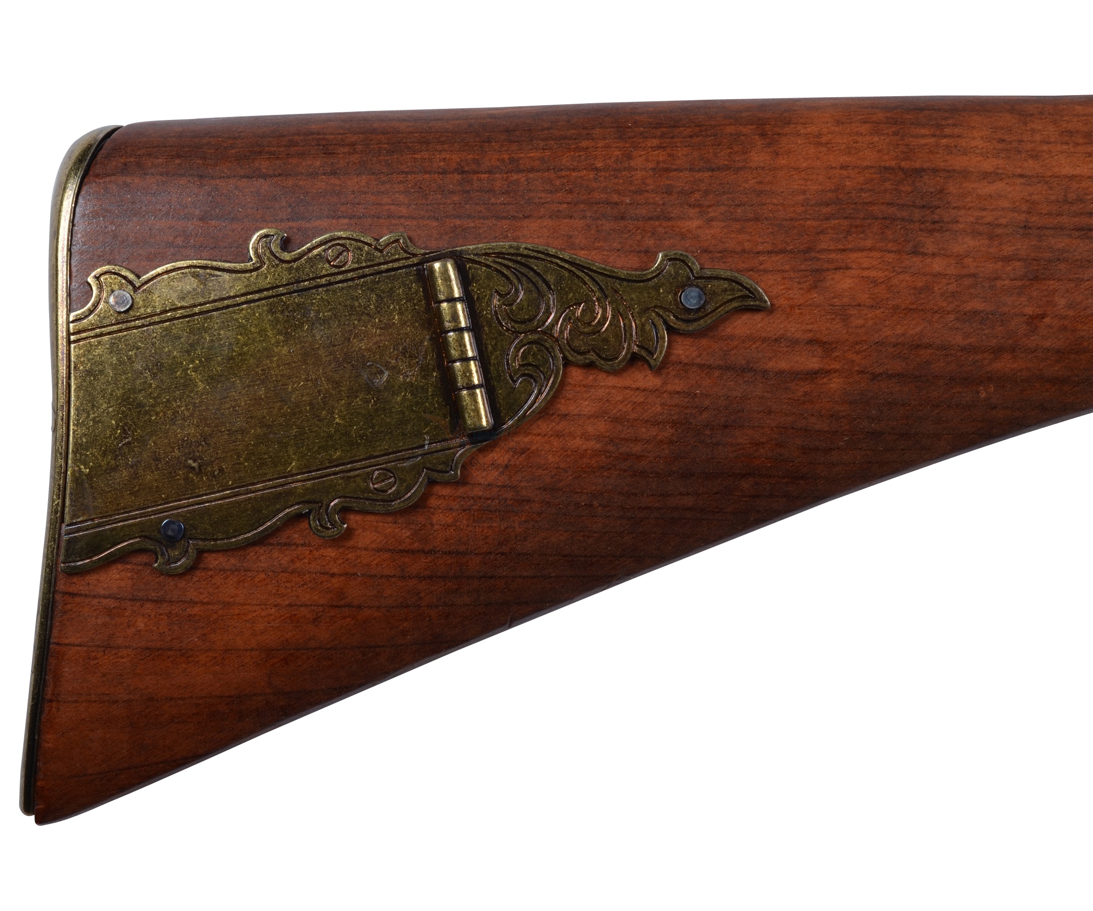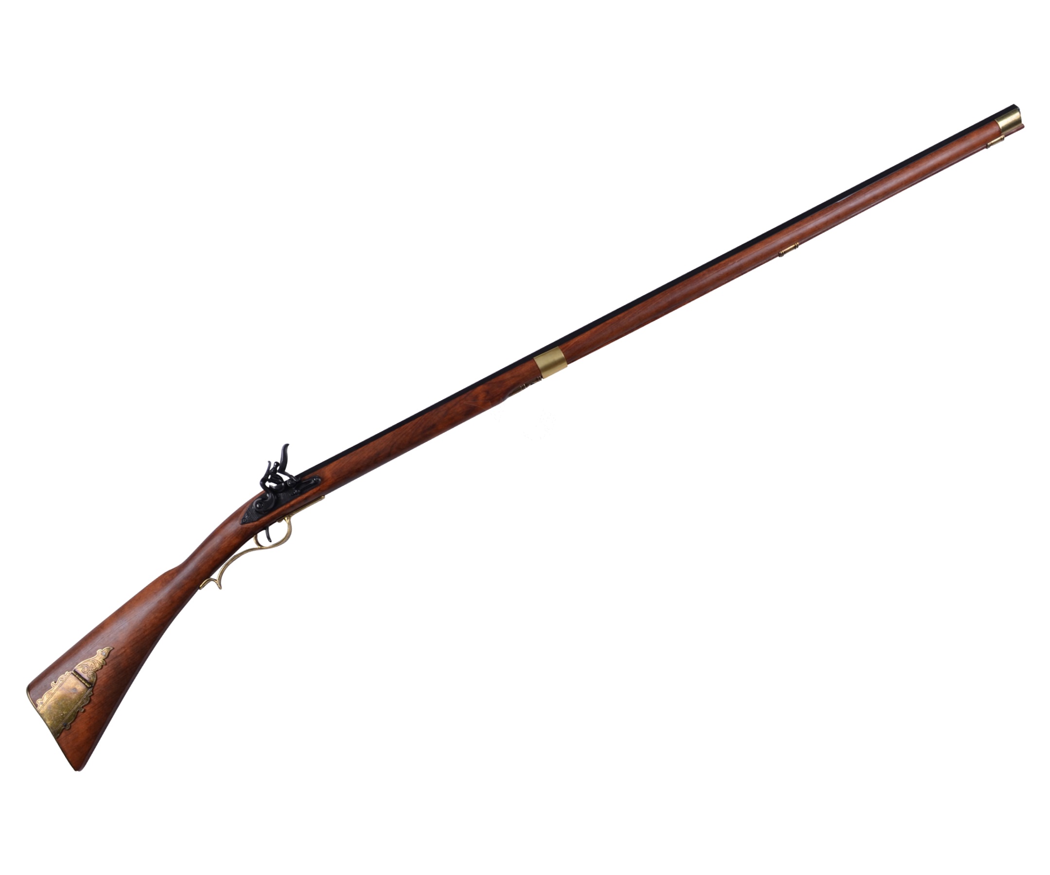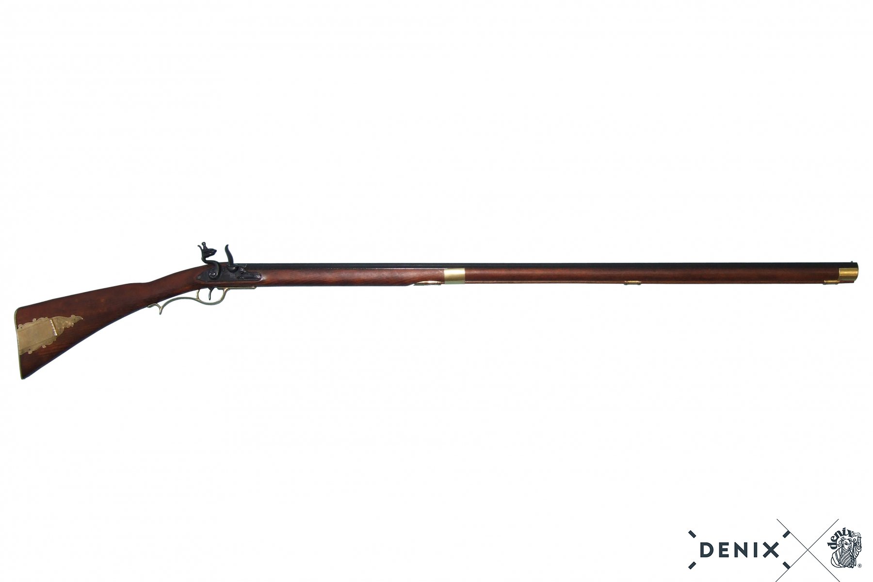 Макет винтовки Кентукки DE-1137 от испанской компании Denix представляет собой реалистичную копию этого легендарного кремниевого оружия, каждая деталь которой выполнена в точном соответствии с оригиналом. Как и многие оригинальные экземпляры, приклад этой копии украшен красивой металлической накладкой с гравировкой. Спусковой крючок можно нажимать, это делает оружие еще более реалистичным. Естественно, макет винтовки Кентукки на рассчитан на стрельбу, но благодаря этому приобрести такой великолепный экземпляр могут все желающие. Длина винтовки составляет 1,48 м, для своих габаритов модель достаточно легкая – всего 2,16 кг.