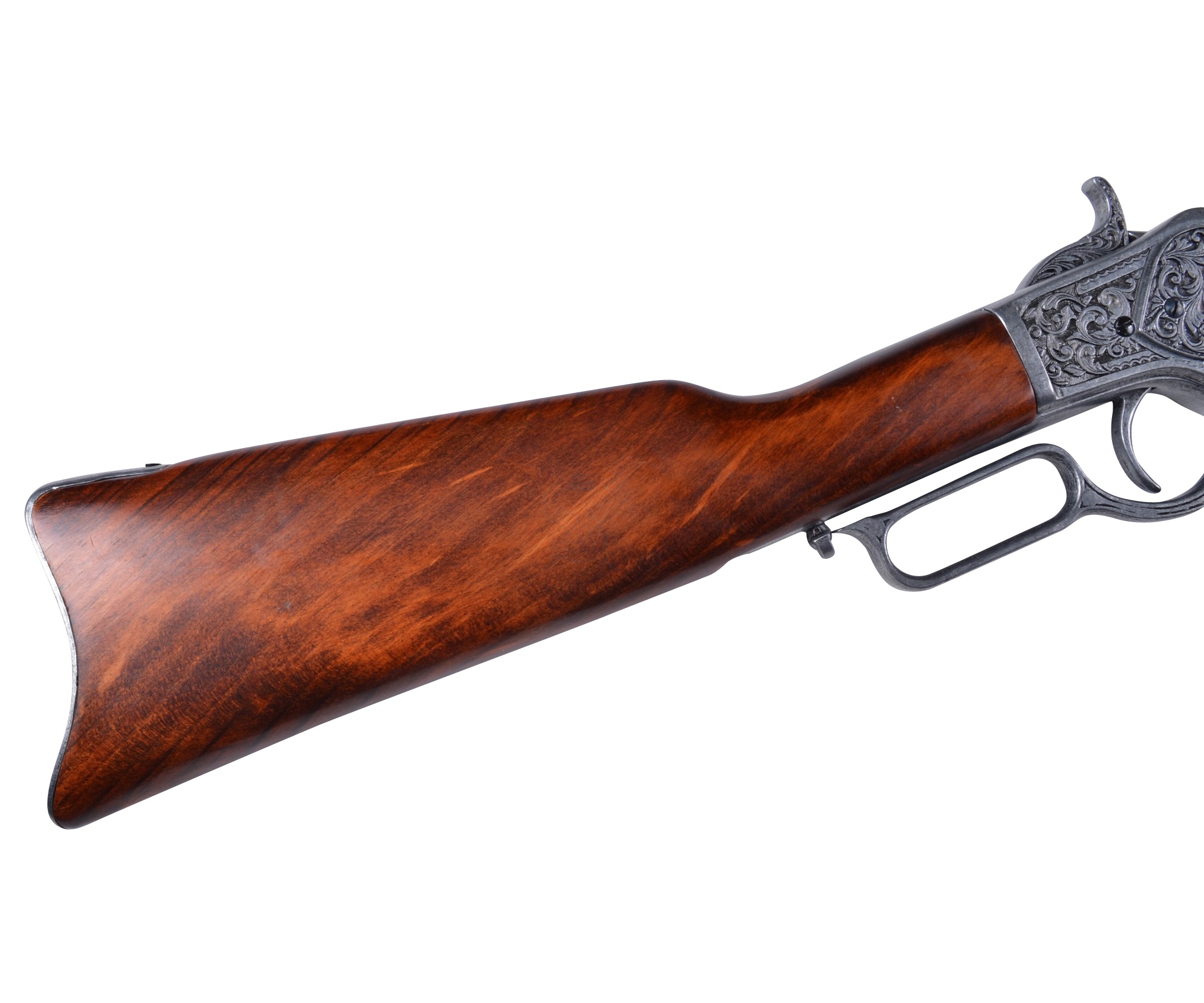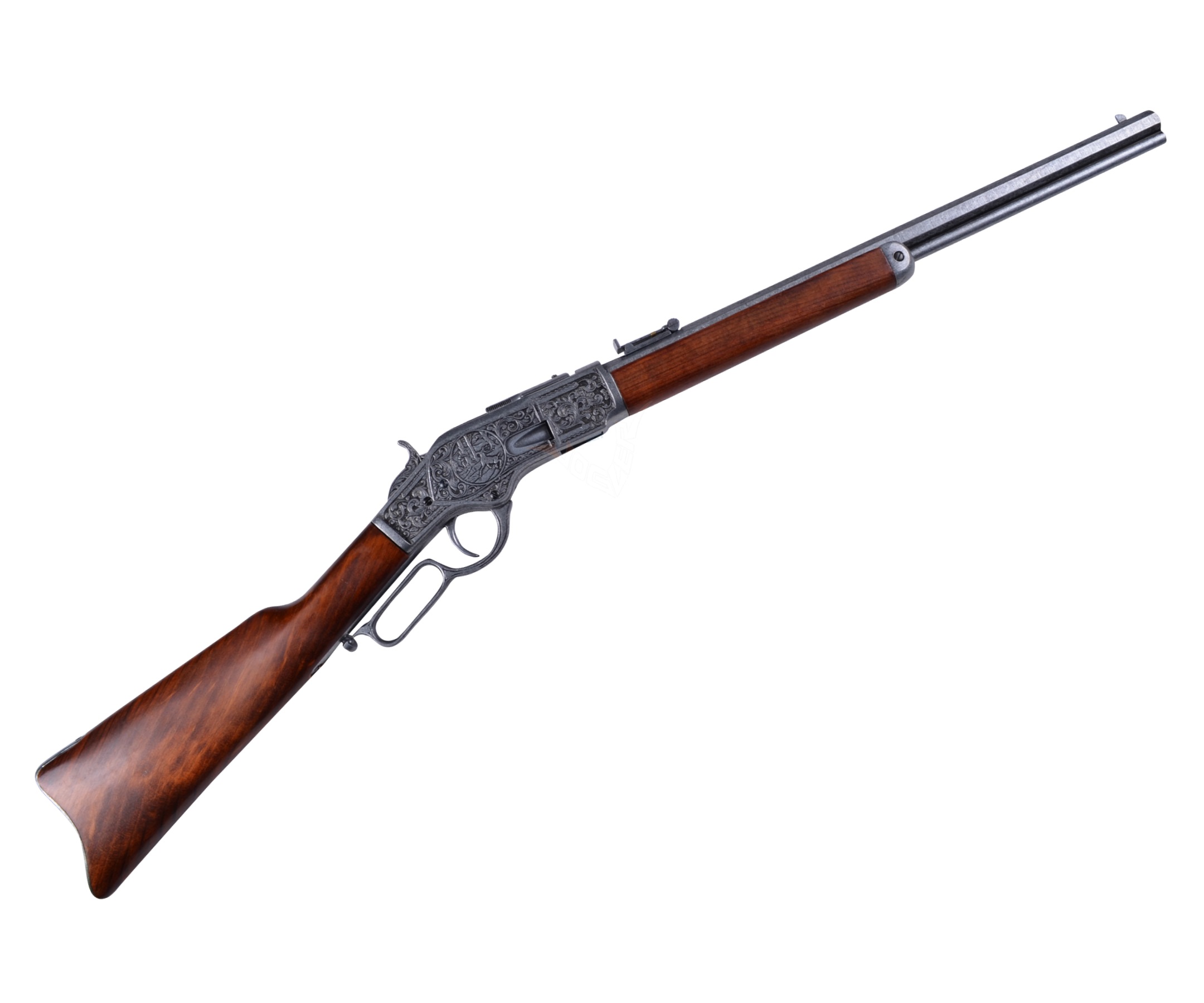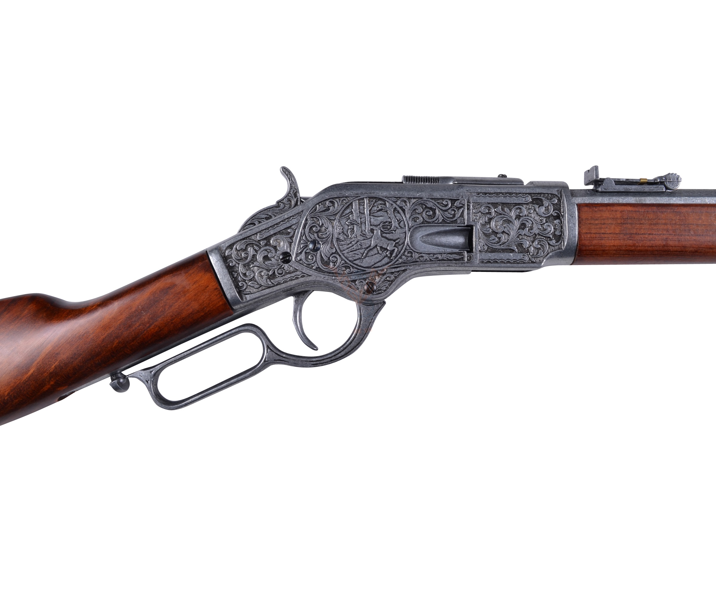 Макет винтовка Винчестер, изготовленная мастерами испанского бренда Denix, выглядит невероятно эффектно и грозно. Практически невозможно определить, что перед вами – сувенирная копия легендарной винтовки – все элементы выполнены соответственно оригинальному образцу, вес и длина макета также отвечают прототипу. В производстве этого экземпляра использован металлический сплав, оружейная сталь (для ствольной коробки) и натуральное дерево (для ложа и приклада). По латуни выполнена гравировка с изображением охотника с ружьем, в окружении красивого цветочного узора. Вес винтовки составляет 2,65 кг, ее длина – 99 см. Действующий ударно-спусковой механизм позволяет выполнить взведение и нажать на курок.