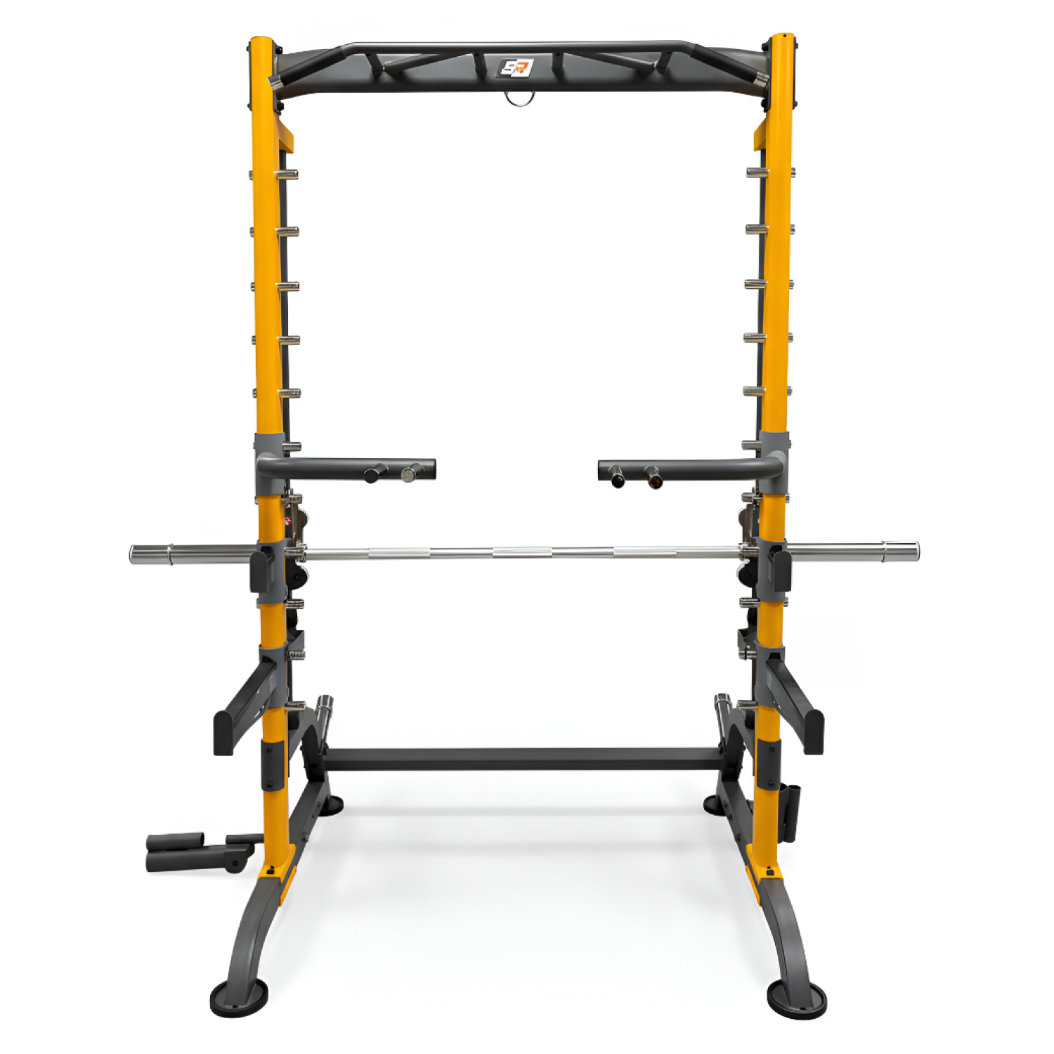 Тренажёр оборудован грифом для приседаний, который движется строго по заданной траектории и фиксируется с помощью ограничительных кронштейнов безопасности, размещённых сверху вниз на стойках. Это обеспечивает дополнительную защиту при выполнении упражнений со свободными весами. Конструкция также дополнена боковыми упорами и держателями, расширяющими функциональные возможности тренажёра.