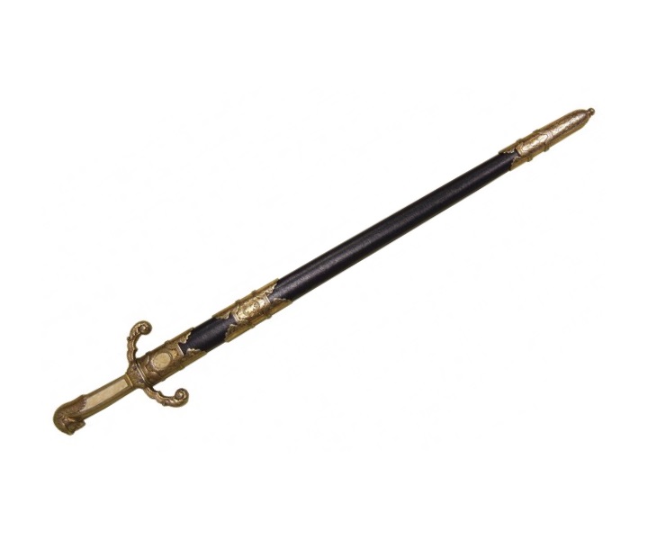Макет меч Петра Великого, в красных ножнах – это полноразмерная копия высокой точности, повторяющая великолепный образец холодного оружия времен Петра Первого. Достоверно неизвестно, действительно ли Петр Первый носил такой меч – во время его царствования меч уже не применялся в качестве боевого оружия.