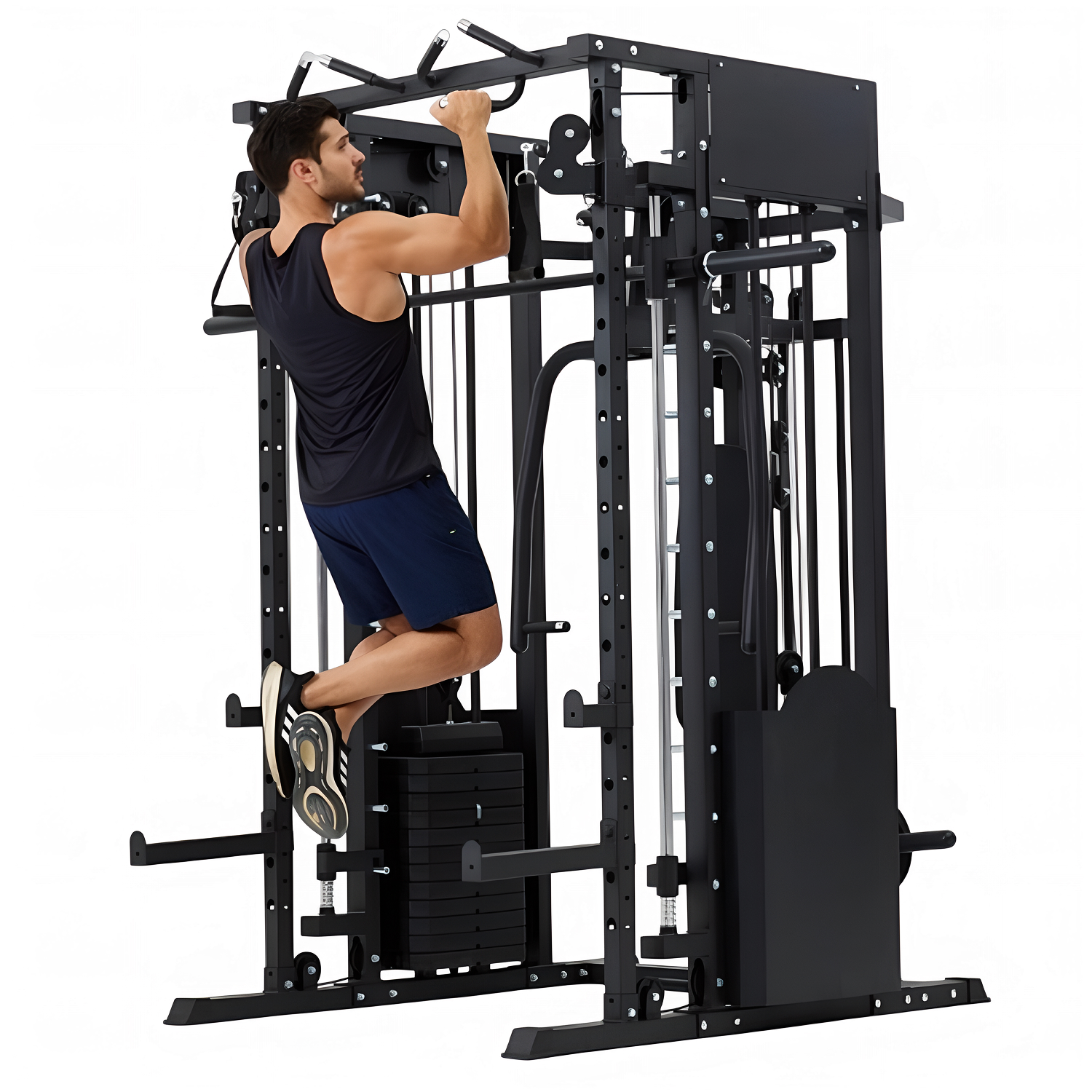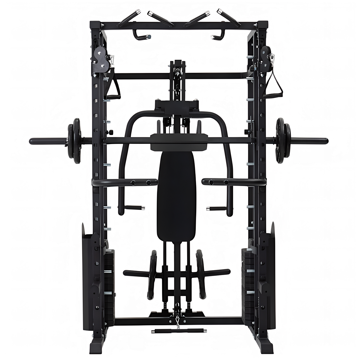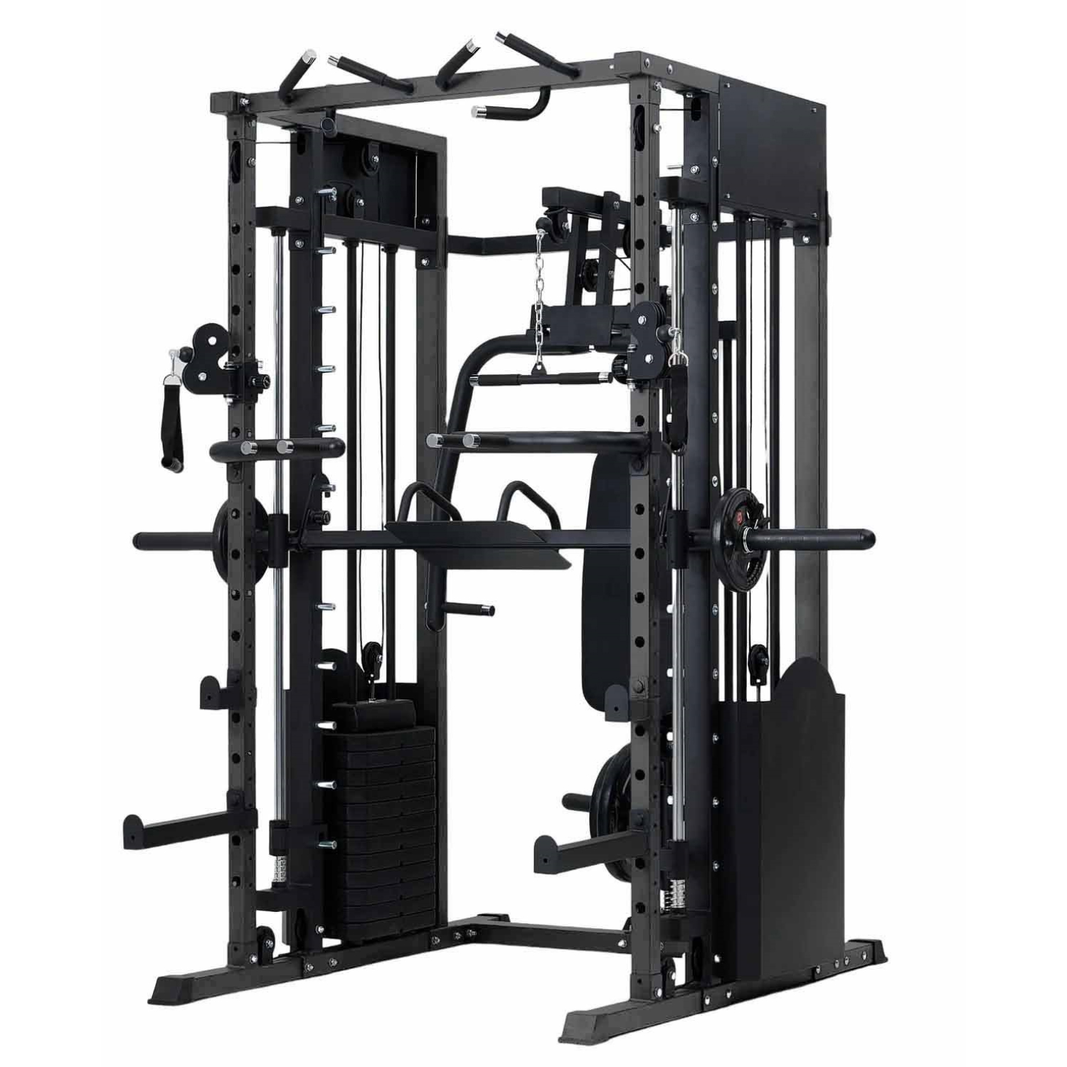 Многофункциональный силовой комплекс позволяет выполнять широкий спектр упражнений: жимы и тяги для груди и спины, верхнюю и нижнюю тягу, баттерфляй, упражнения на бицепс и трицепс, тяги к поясу, приседания и упражнения со штангой, а также тренировки на пресс.