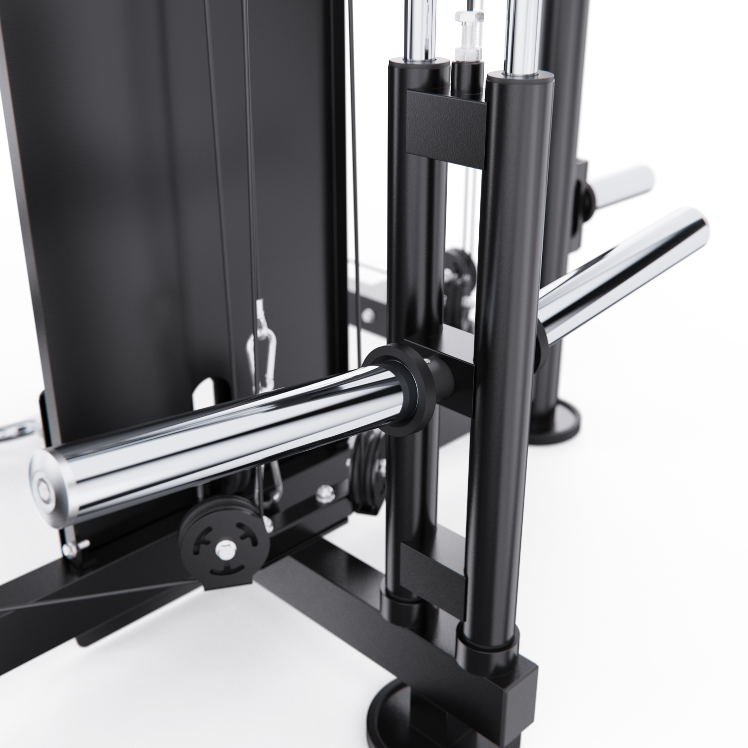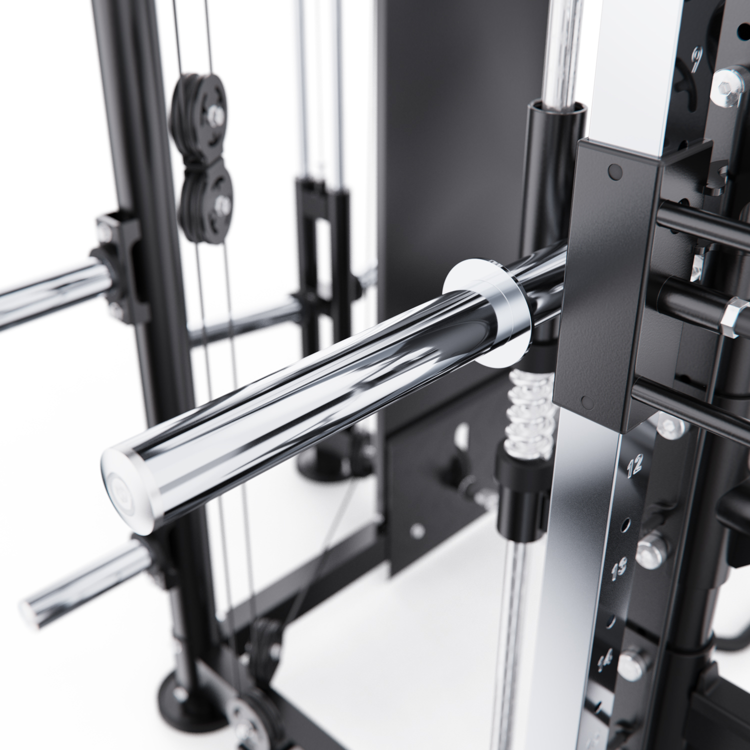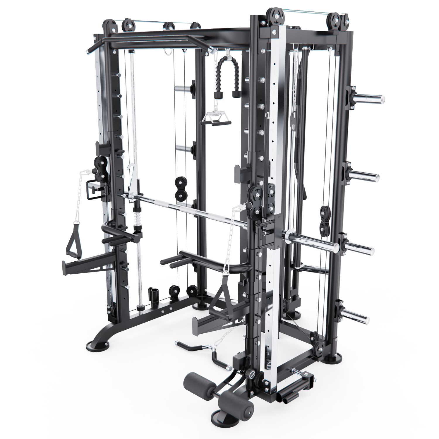 Высота держателей для штанги, ручек для отжиманий и грифа регулируется в 12-ти положениях. Валики регулируются по углу наклона в 3-х положениях. Боковые ручки, ручки для тяги по бокам регулируются в 18-ти положениях.