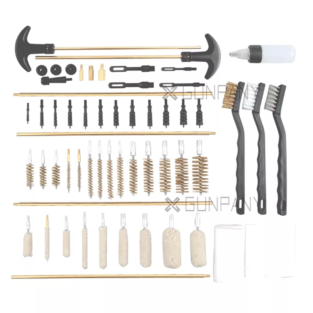 В комплект Gunpany на 62 предмета входит 2 стержня с ручками и 4 усиленные колена, соединяющиеся между собой посредством прочной резьбы, что позволяет быстро регулировать длину шомпола. Стержни шомпола выполнены из латуни на станке с ЧПУ, поэтому не имеют задиров и выбоин, выдерживают механические нагрузки, не оставляют следов на оружии. К гладкой латунной поверхности не прилипают продукты горения, которые могут поцарапать ствольный канал при интенсивной чистке.