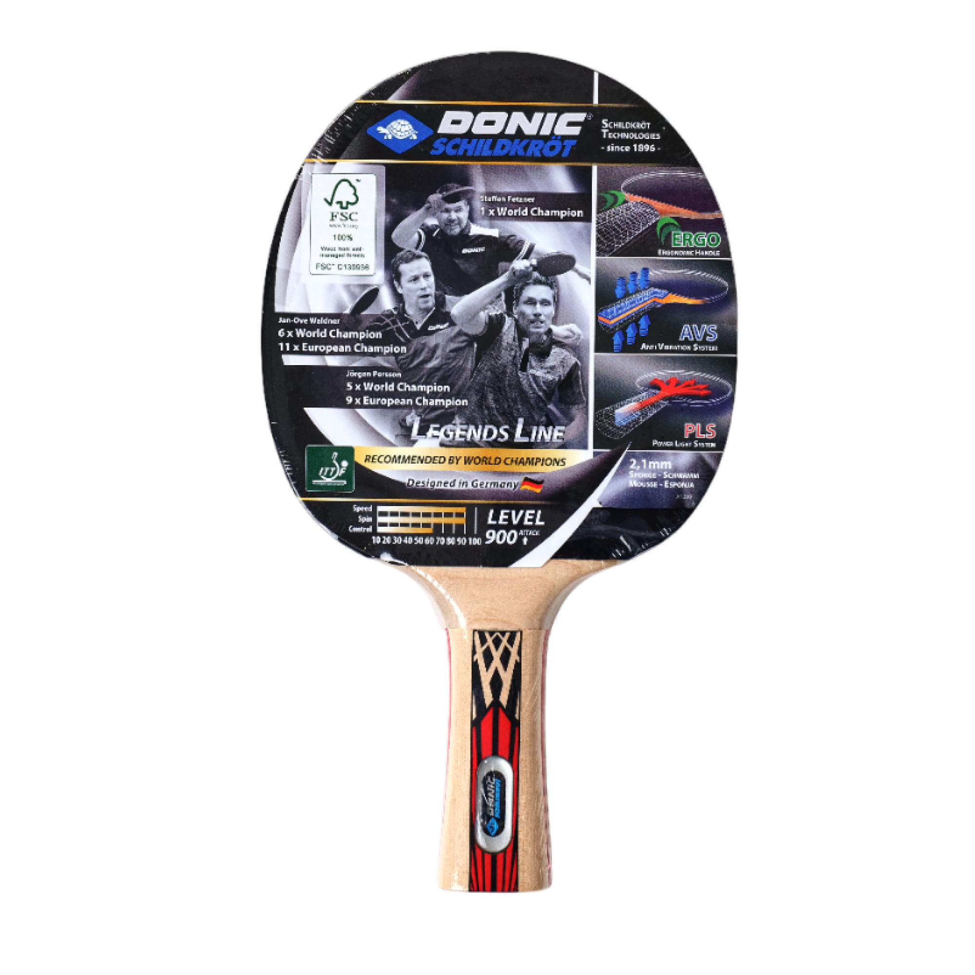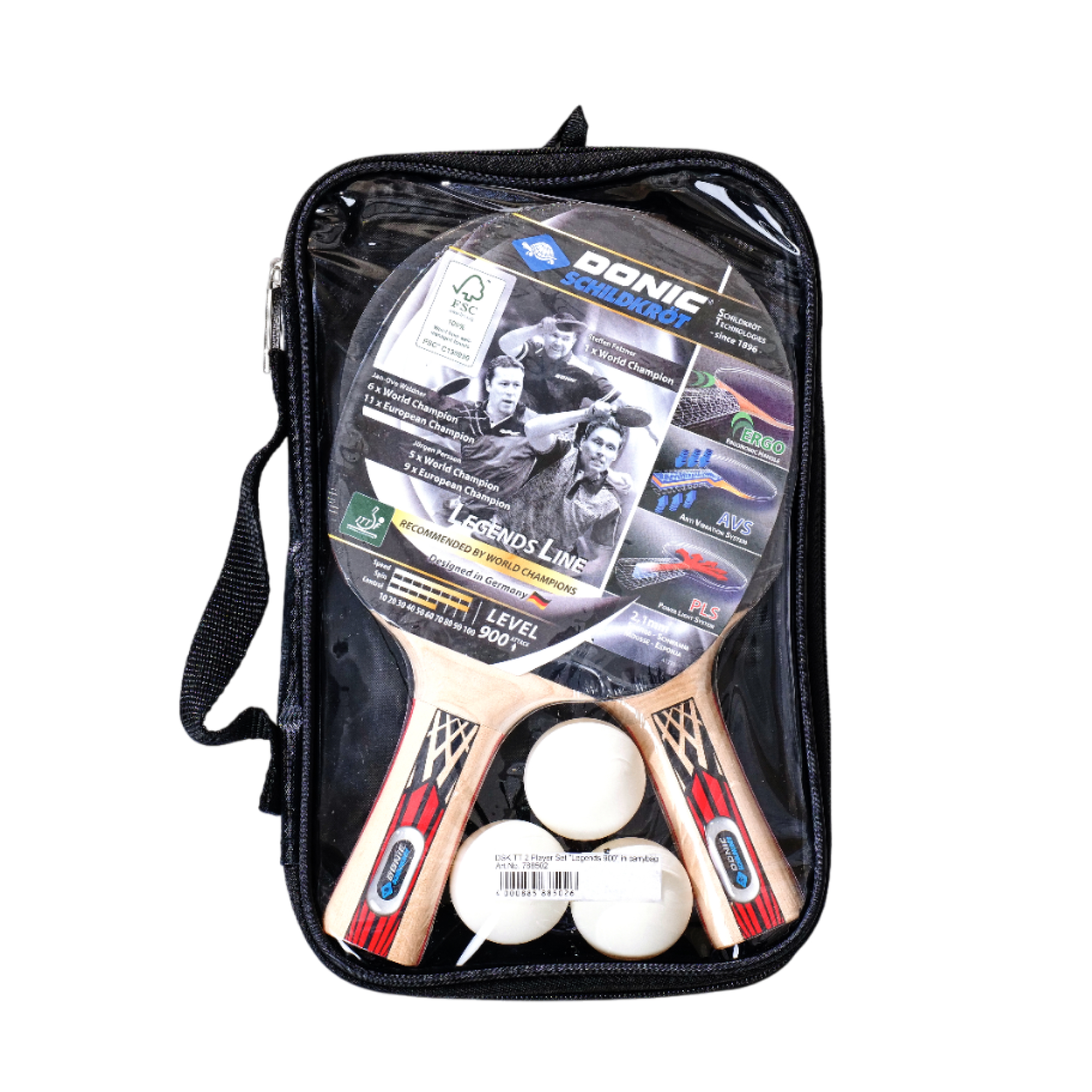 Набор DONIC Schildkrot LEGENDS 900: 2 ракетки LEGENDS 900, 3 мячика белого цвета Champion 3* 40+, полупрозрачный чехол из жаккарда. Мячики сделаны из ABS-пластика. 3-star – категория мячиков c допуском округлости менее 0,2 мм. Допуск округлости показывает, насколько шар «круглый» и имеет равномерный отскок. Шары категории 3-star подходят для использования на турнирах. Размер мячиков - 40 мм, они отличаются отличным качеством, достигнутым с помощью технологии производства Blow-Press. Благодаря этой технологии, мячик имеет идеальную форму и отскок. Ракетка DONIC "LEGENDS 900" рассчитана на тип игры Атака. Для покрытия используется накладка Spinmax, а толщина губки 2,1 мм. Форма ручки Concave - ручка, расширяющаяся к концу. Ракетка одобрена Международной федерацией настольного тенниса ITTF. AVS Anti-Vibration-System (AVS) — это амортизирующая система, разработанная Schildkröt. Благодаря AVS улучшается контроль мячика и снижаются вибрации, вызванные энергией удара. Два амортизирующих мягких слоя находятся между ручкой и её покрытием. В результате AVS повышает точность ударов как в оборонительном, так и в наступательном стиле игры. ERGO Ручка ERGO (эргономичная) анатомически точно прилегает к руке и помогает игроку чувствовать себя с ракеткой единым целым! Закругленная форма ручки позволяет избежать давления в руке и делает процесс игры более приятным и комфортным. FSC Фанера 6 мм, из которой сделана ручка имеет сертификат FSC (Лесной попечительский совет). Он является гарантом ответственного подхода к использованию лесных ресурсов и сохранения лесных экосистем в мировом масштабе. PLS Power Light System (PLS) - это система, снижающая общий вес рукоятки и переносящая центр тяжести на центральную часть благодаря полой конструкции. Таким образом, во время игры ваши удары будут гораздо быстрее и мощнее, а ощущение усталости придёт гораздо позже. Spinmax Универсальная резиновая накладка Spinmax создана из каучука. Она достаточно плотная, что увеличивает вращение мячика во время игры, а также долговечная из-за прочности материала. Благодаря этим свойствам вы сможете комфортно играть в атакующей позиции.