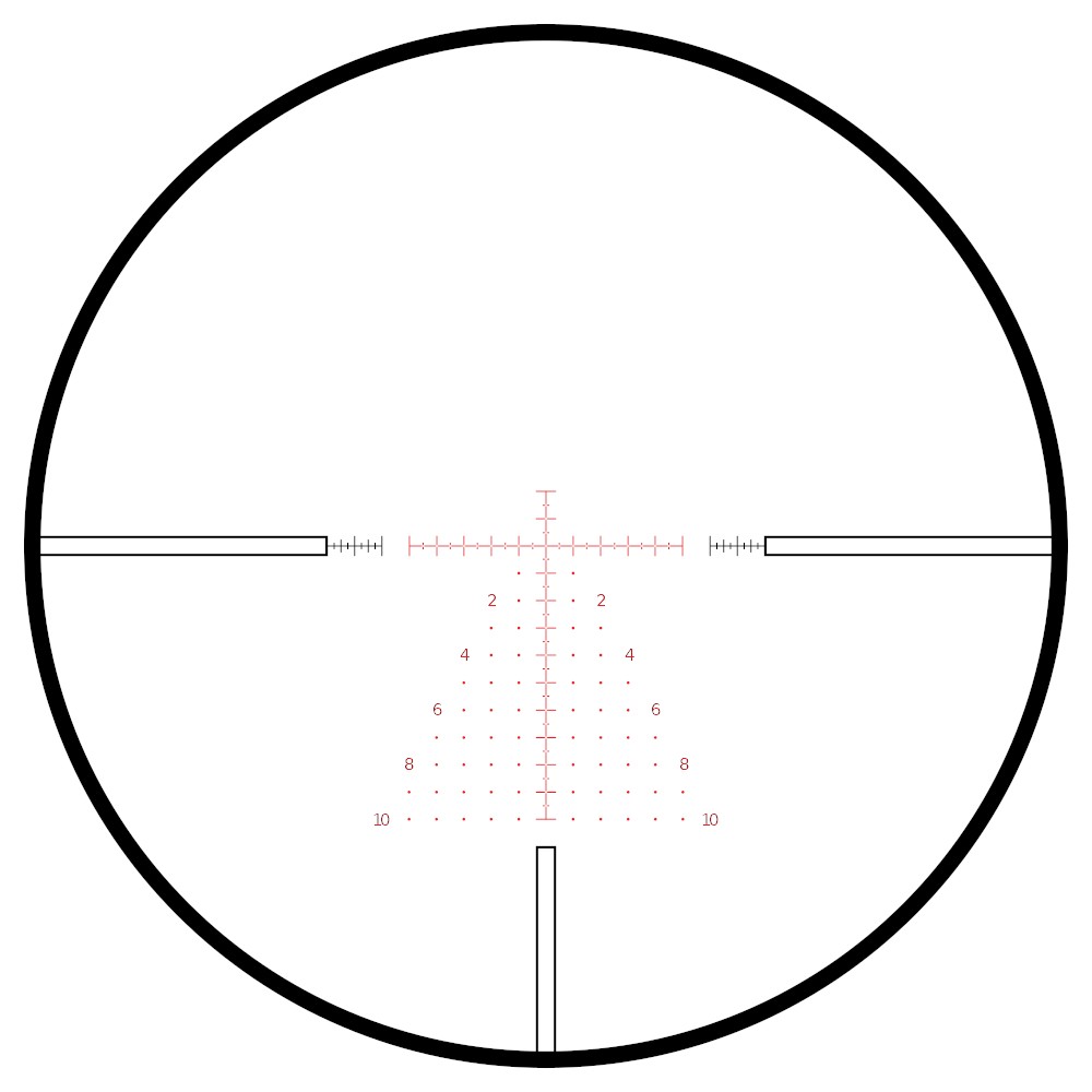Объединяет принципы MилДот и концепцию «открытого прицельного штриха»: множество прицельных точек, широкие полые «пеньки» и зазоры между хэш-метками не перекрывают всё поле зрения, позволяя выцеливать даже маломерные цели. Вертикальная разметка (на дальность) выполнена с шагом 0,25, 0,5 и 1 мил; чтобы упростить и ускорить ввод поправок, каждое второе значение пронумеровано. Для улучшения видимости в сумерках или на тёмном фоне центр подсвечивается красным.