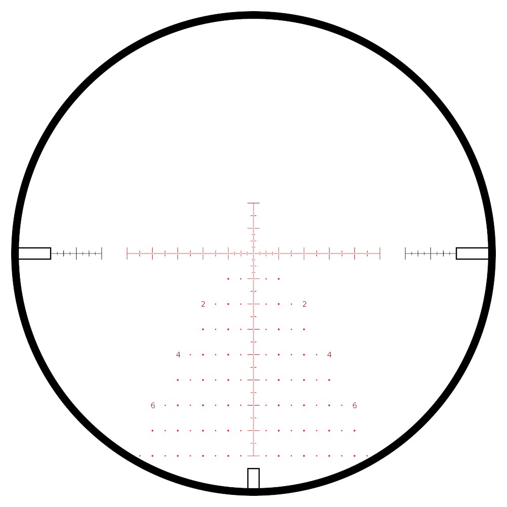 Прицельная марка Mil Pro 20x вытравлена на линзе, расположенной в фокальной плоскости окуляра, и не меняет визуальных размеров при смене кратности. Центральная часть и нижняя направляющая подсвечиваются красным цветом, уровень яркости регулируется для дневного и сумеречного освещения: от 0 (без подсветки) до 11 (максимум).