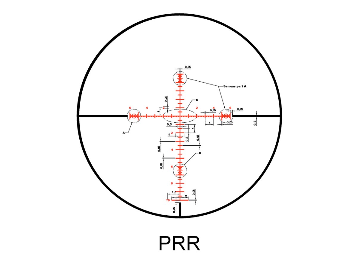 Прицельная сетка PRR, расположенная в первой фокальной плоскости (FFP), с увеличением кратности пропорционально изменяется. При этом угловые размеры прицельной сетки остаются одинаковыми при любых изменениях кратности. Барабанчики ввода поправок высокие и открытые. Отстройка параллакса осуществляется боковым барабаном (SF) от 9,14 м. до бесконечности.