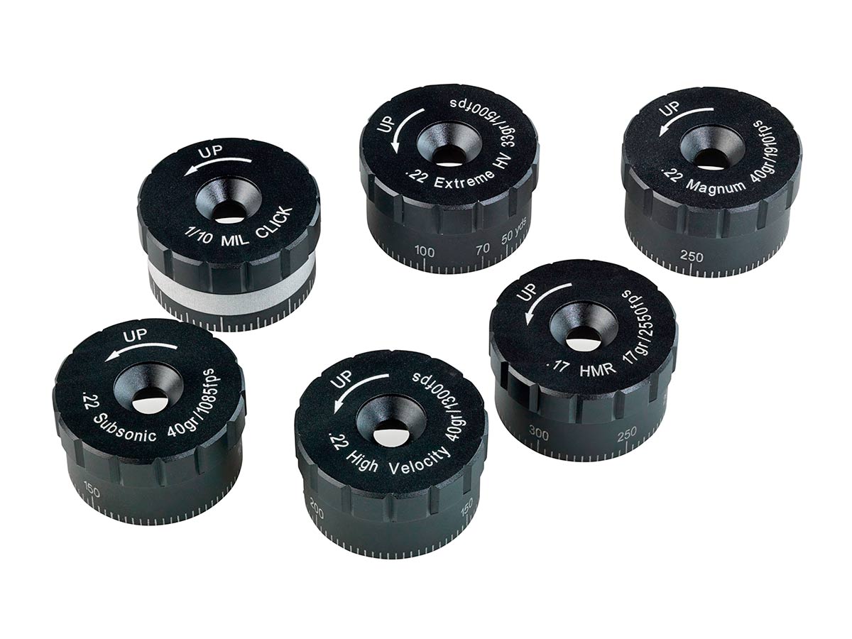 В комплекте 7 сменных барабанчиков - 6 размечены под баллистику различных калибров и патронов (17 HMR / 17gr / 2250 fps; 22 Subsonic / 40gr 1085 fps; .22 High Velocity / 40gr 1300 fps; .22 Extreme Velocity / 33gr 1500 fps; .22 Mag. / 40gr /1910 fps; .223Rem), а седьмой оставлен "пустым" для того, чтобы стрелок мог его разметить самостоятельно под баллистику своего комплекса оружие-патрон.