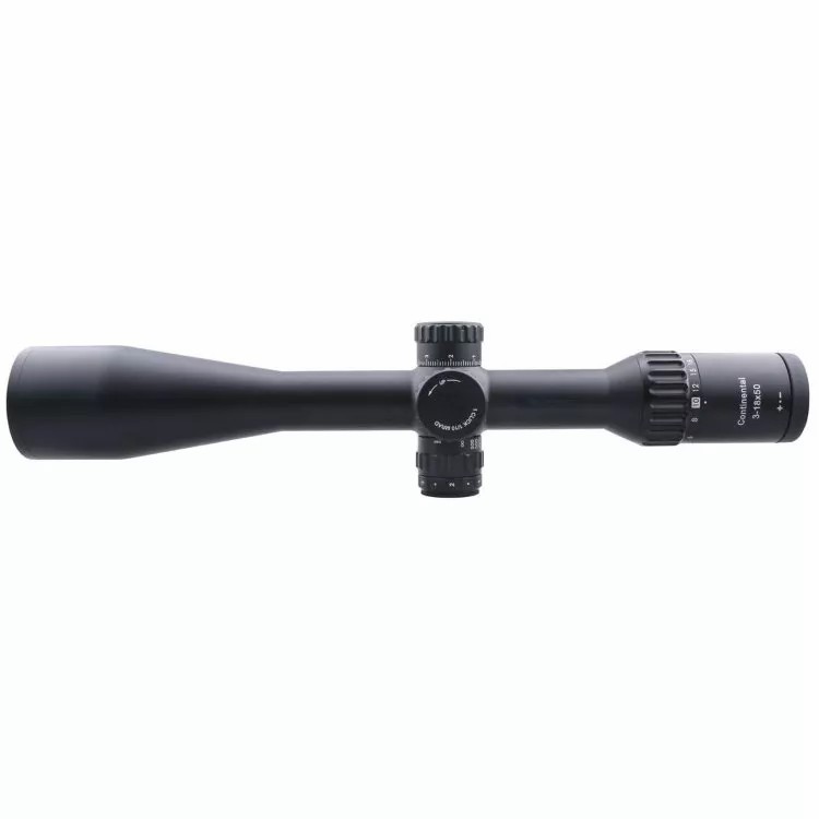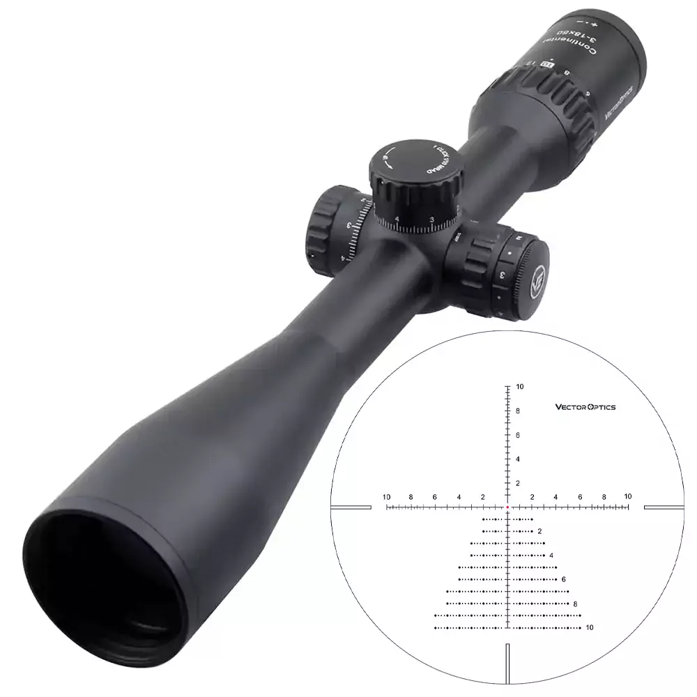VectorOptics Continental 3-18x50 Tactical SFP — тактический прицел класса premium для максимально точной стрельбы на больших дистанциях. Модель отличается высокопрочным 30 мм корпусом, тактическими барабанами с малым шагом выверки, механизмом отстройки параллакса, баллистической сеткой и кристально чистым изображением без эффекта «замочной скважины».