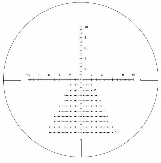 Баллистическая марка VCT-10 (SFP, 10x) учитывает все нюансы стрельбы на дальние дистанции, при смене кратности не масштабируется и сохраняет неизменными видимые размеры; угловые значения верны на 10x. Все линии и прицельные элементы очень тонкие и чёткие, сетка хорошо просматривается и не перекрывает обзор. Для быстрого захвата цели есть «плавающая» центральная точка ø 0,18 мрад. А частая разметка направляющих (с шагом 0,25, 0,5 и 1 мрад) и наличие горизонтальной «ёлочки» позволяет вносить необходимые поправки на ветер, движение и дальность без механической выверки, когда нет времени крутить барабаны или не хочется трогать настройки. Для улучшения видимости (и привлечения внимания) « точка» подсвечивается красным. Доступно 6 уровней яркости с быстрым отключением подсветки в промежуточных положениях.