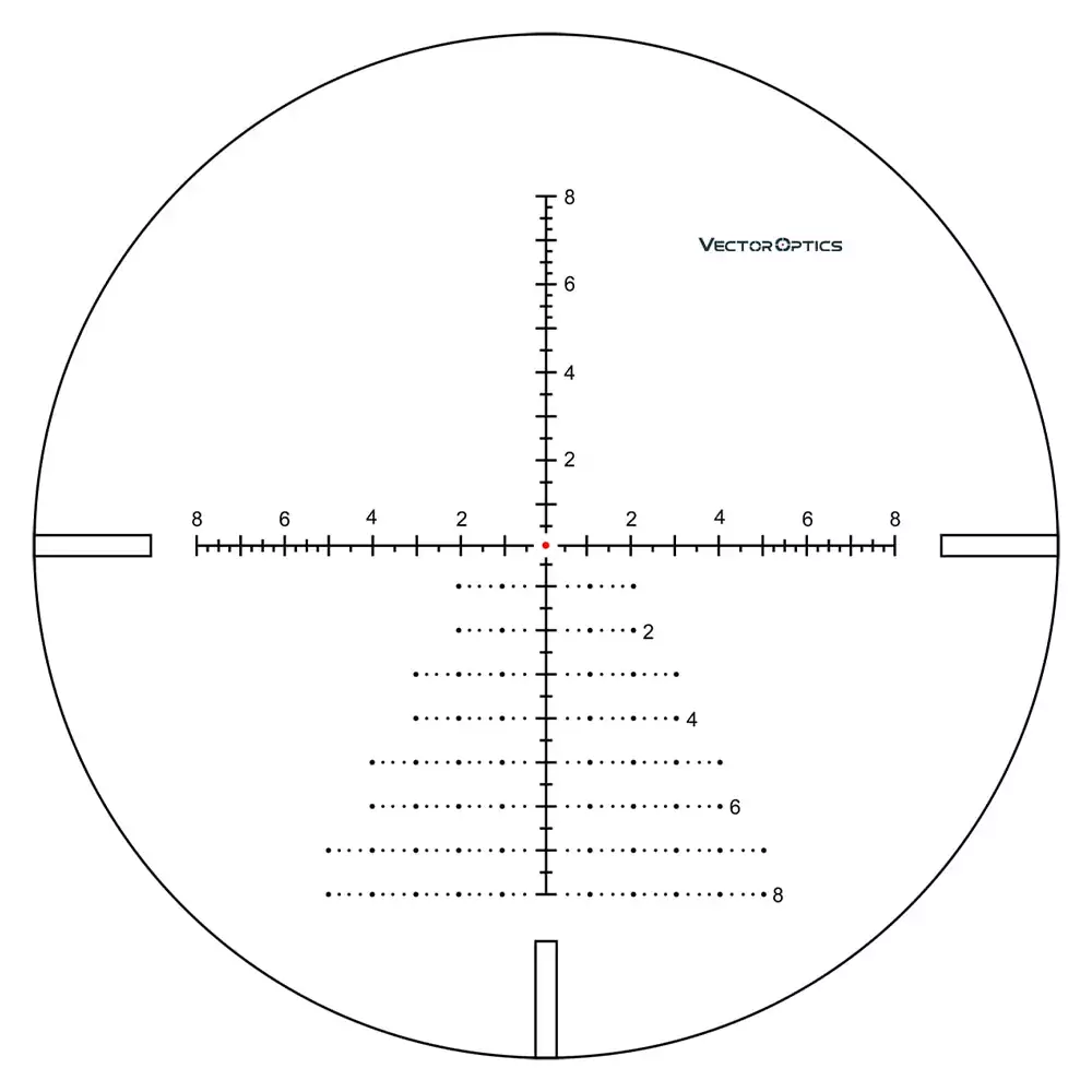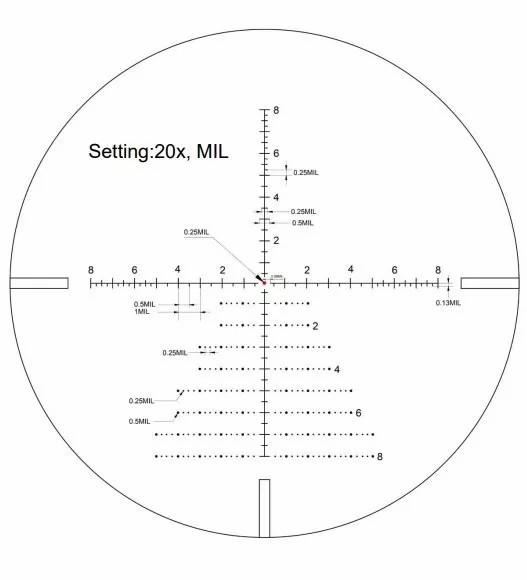 Баллистическая марка VCT-20 учитывает нюансы стрельбы на дальние дистанции. Сетка находится в фокальной плоскости окуляра и не меняет видимых размеров при перемене кратности; угловые значения верны на 20x. Кратность, при которой угловые значения сетки являются верными, особо выделена на шкале увеличение — чёрным цветом на белом фоне (остальные значения белым на чёрном). Все линии и прицельные элементы очень тонкие и чёткие. Для быстрого захвата цели есть «плавающая» центральная точка ø 0,25 мрад. А частая разметка направляющих (с шагом 0,25, 0,5 и 1 мрад) и наличие горизонтальной «ёлочки» позволяет вносить необходимые поправки на ветер, движение и дальность без механической выверки, когда нет времени крутить барабаны или не хочется трогать настройки. Для улучшения видимости на солнце и в сумерках « точка» подсвечивается красным. Доступно 6 уровней яркости с быстрым отключением подсветки в промежуточных положениях.